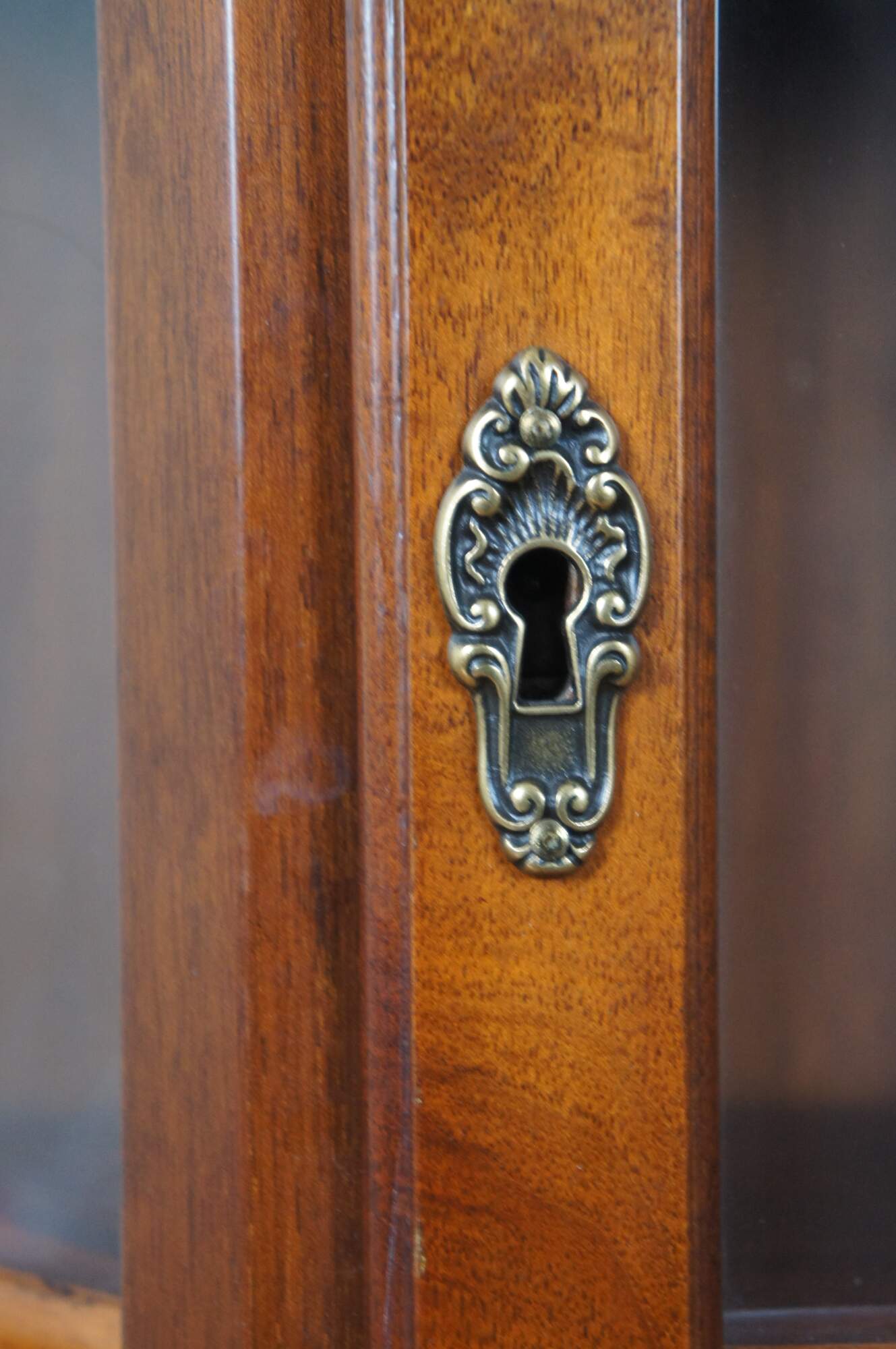 Vintage made in Sweden arch top wooden curio / display cabinet with glass front and beveled base.