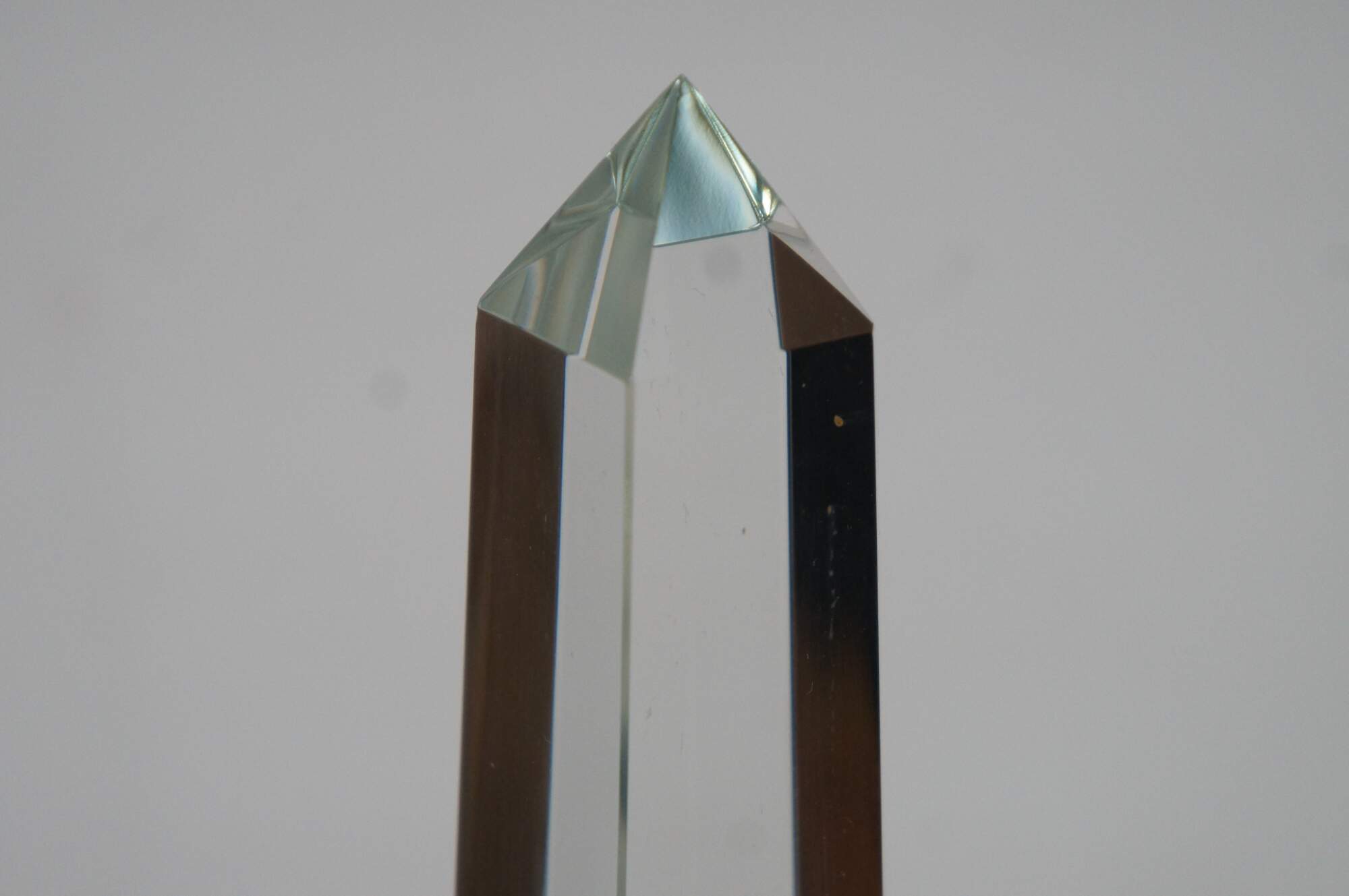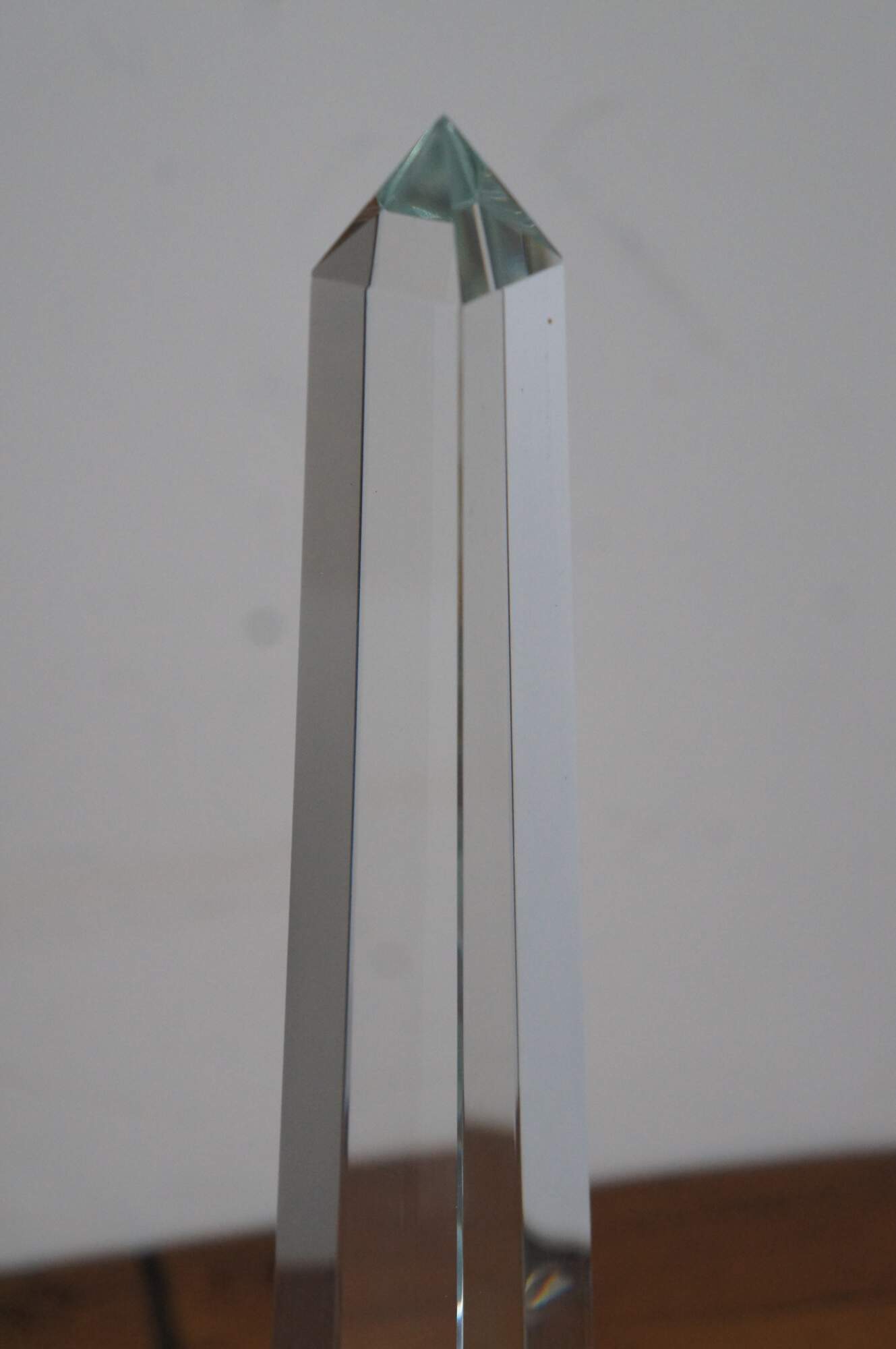 Vintage heavy clear glass obelisk sculpture with tiered base.