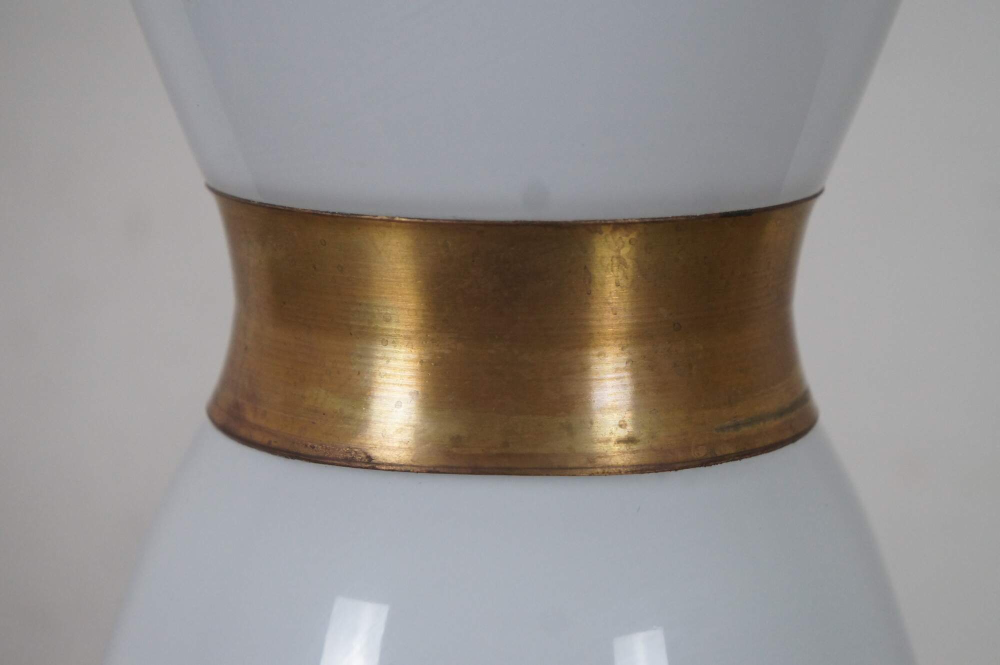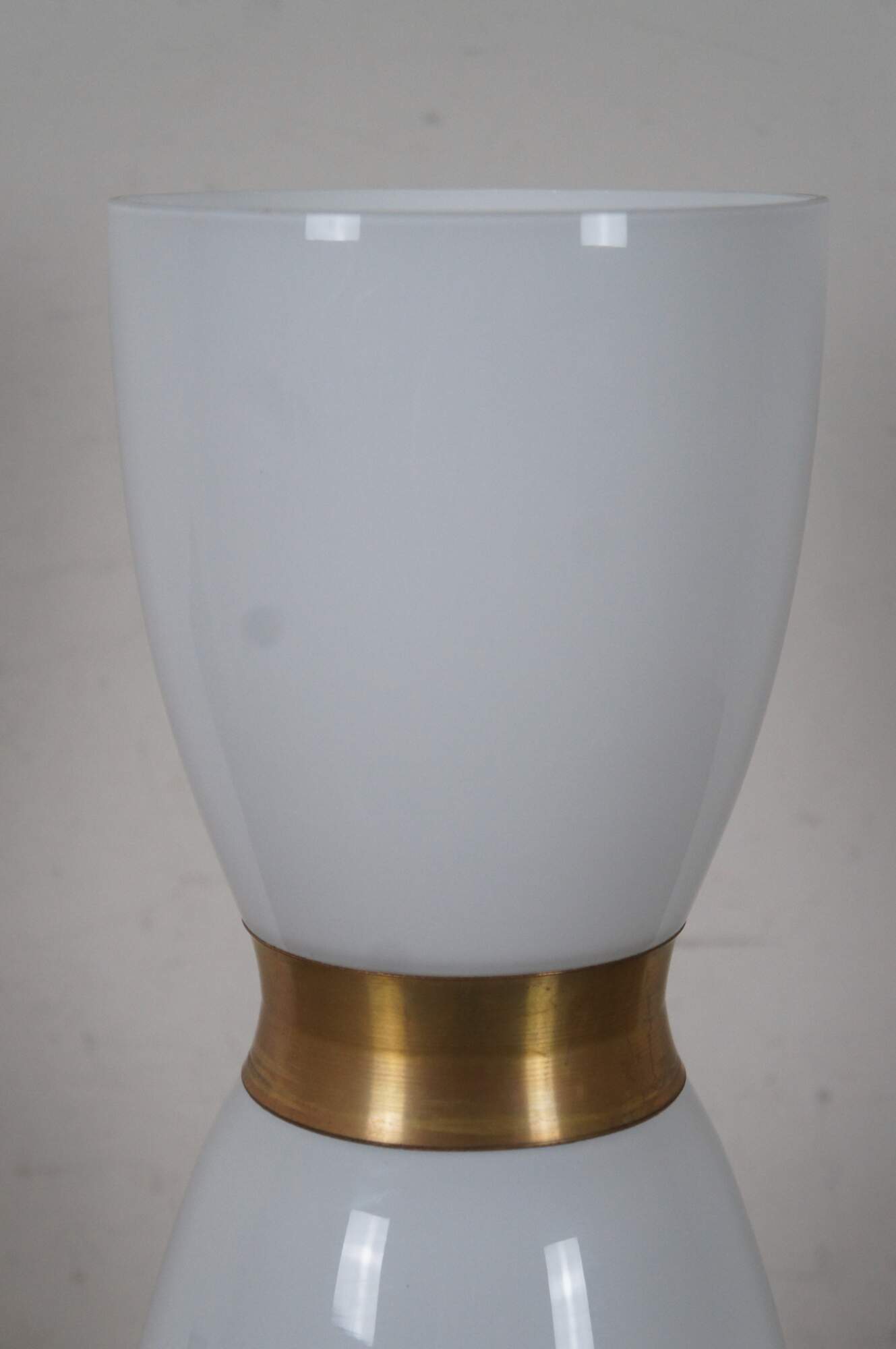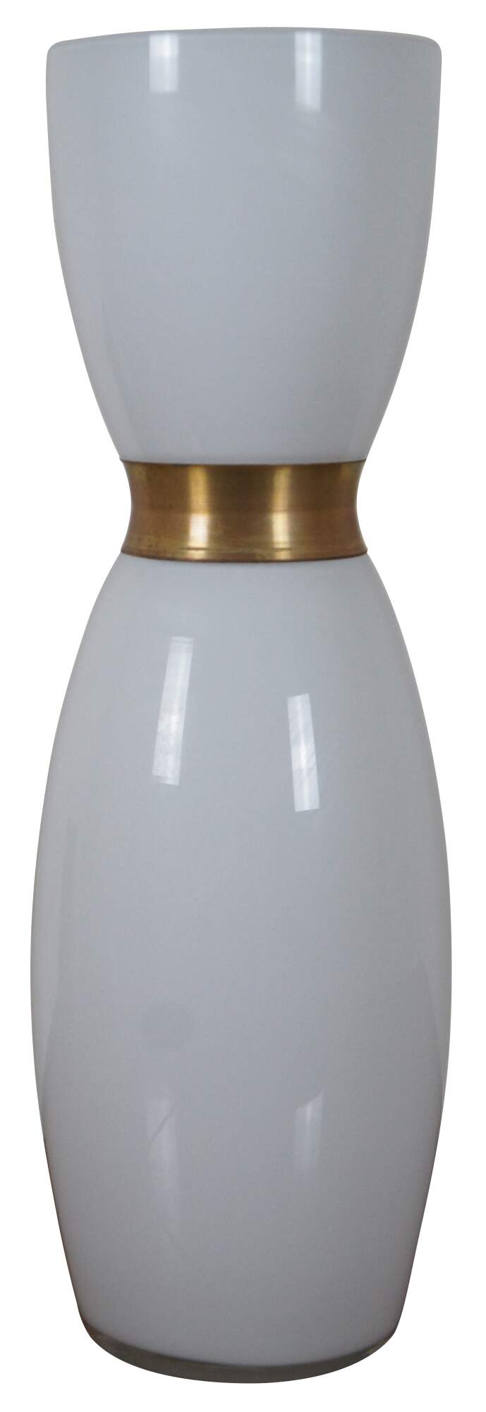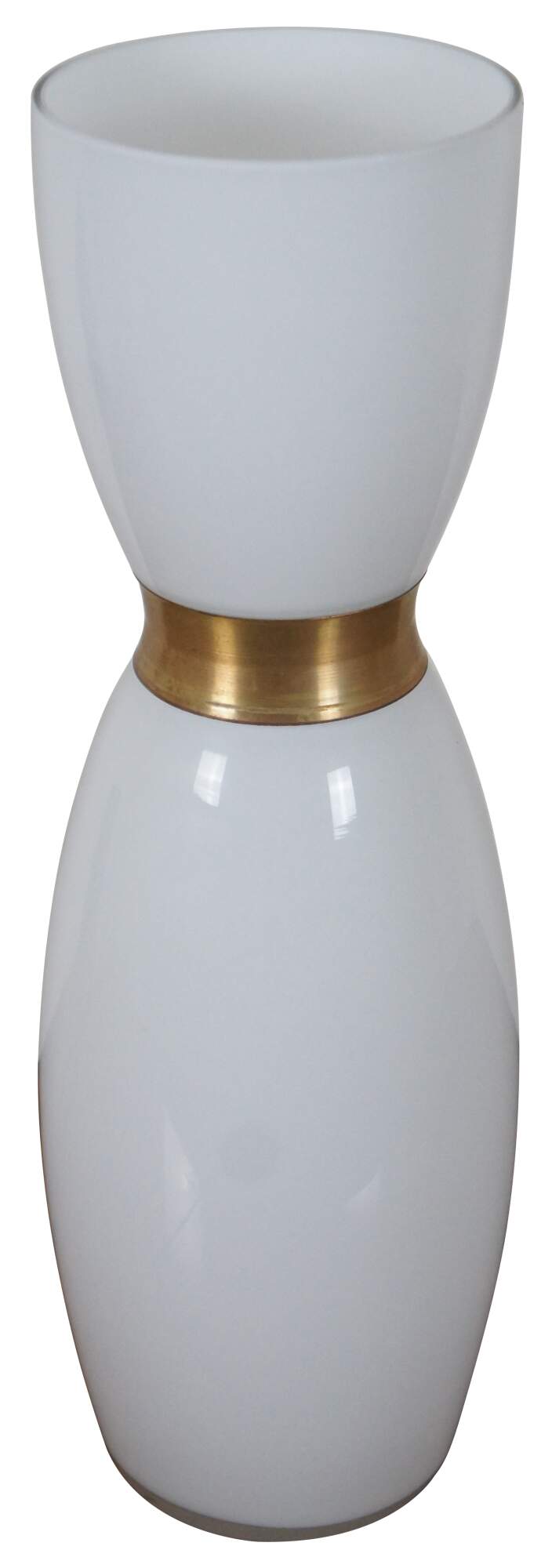 Alamance hourglass shaped white glass vase cinched with a brass band.