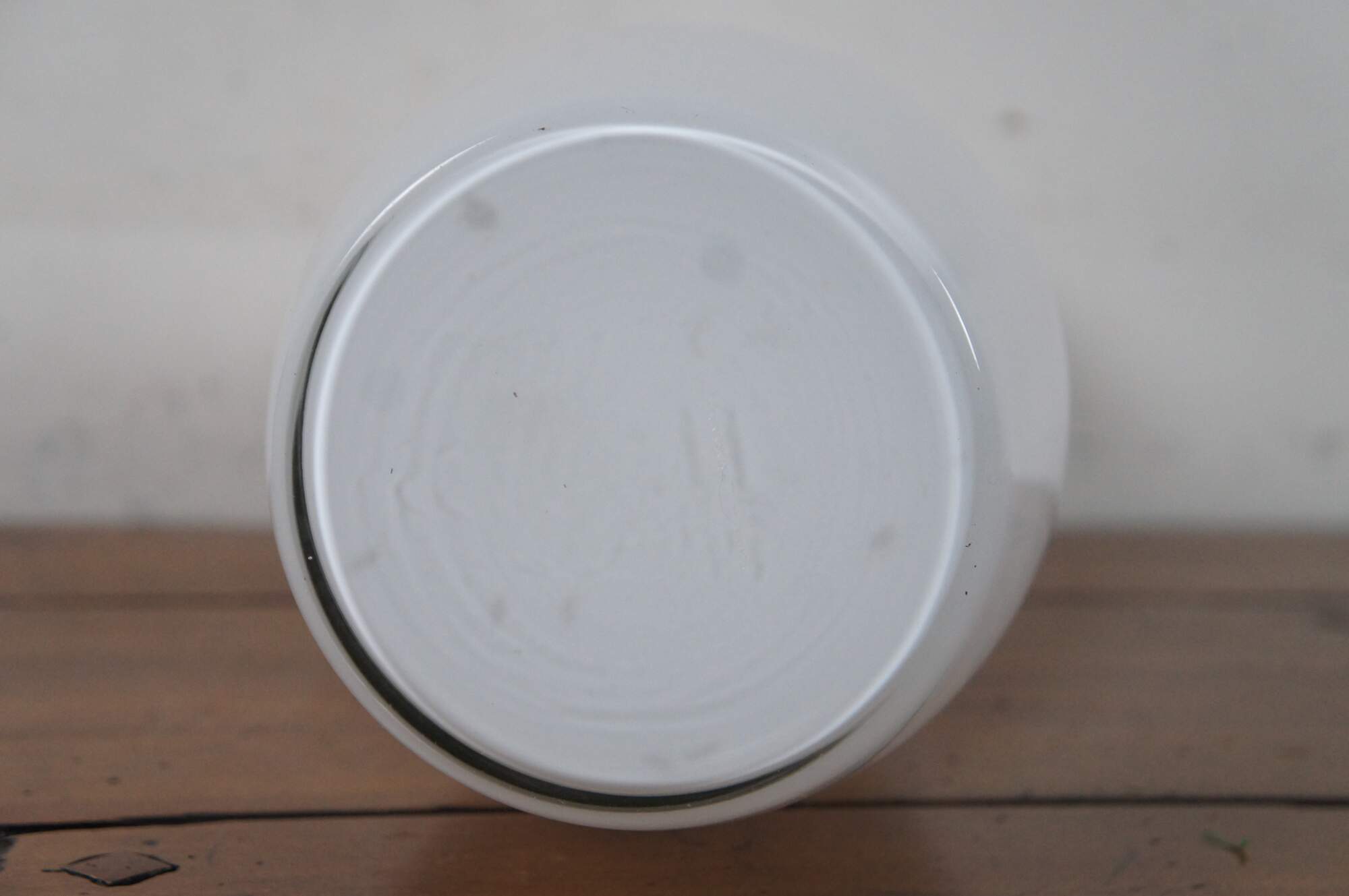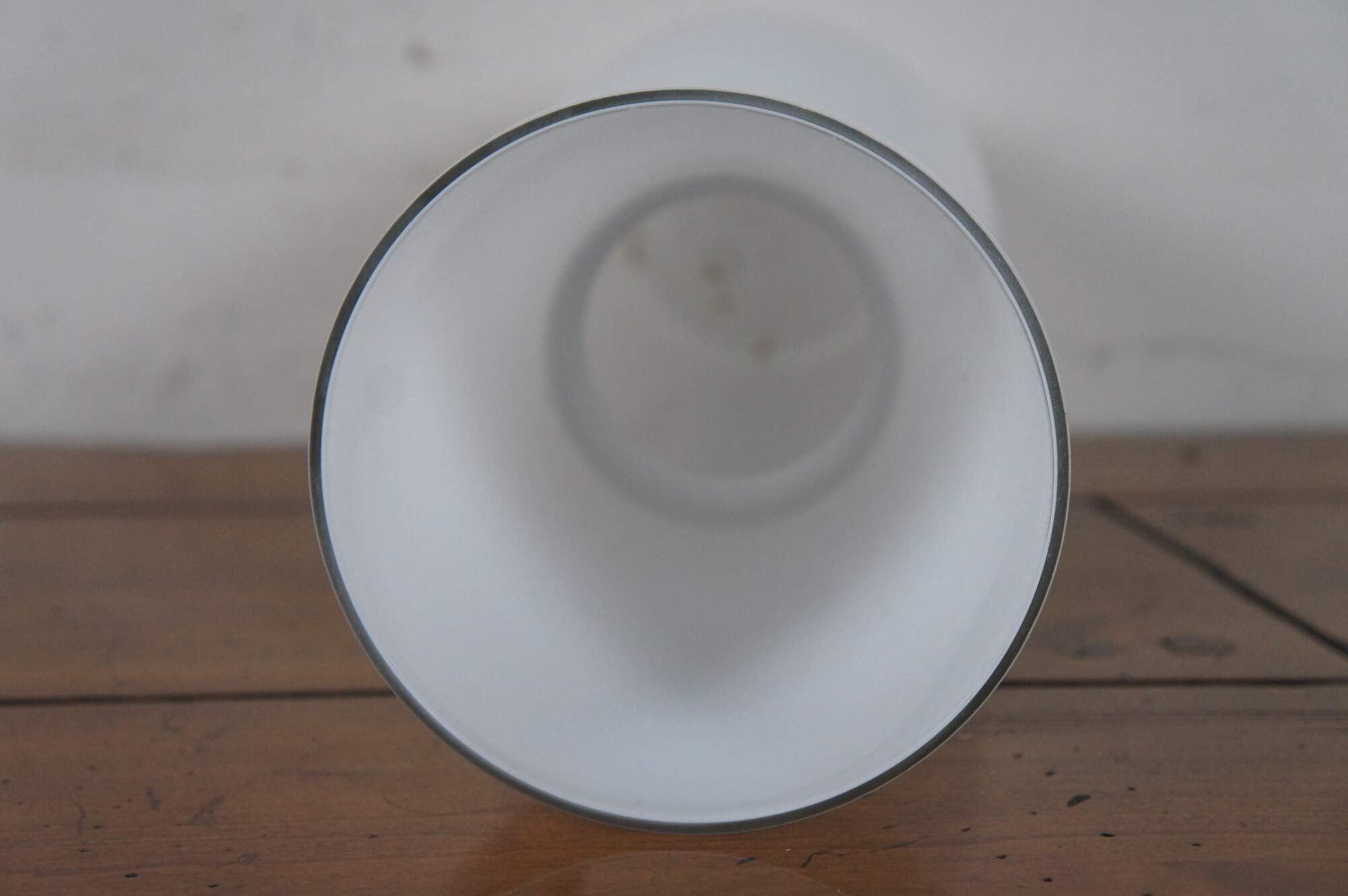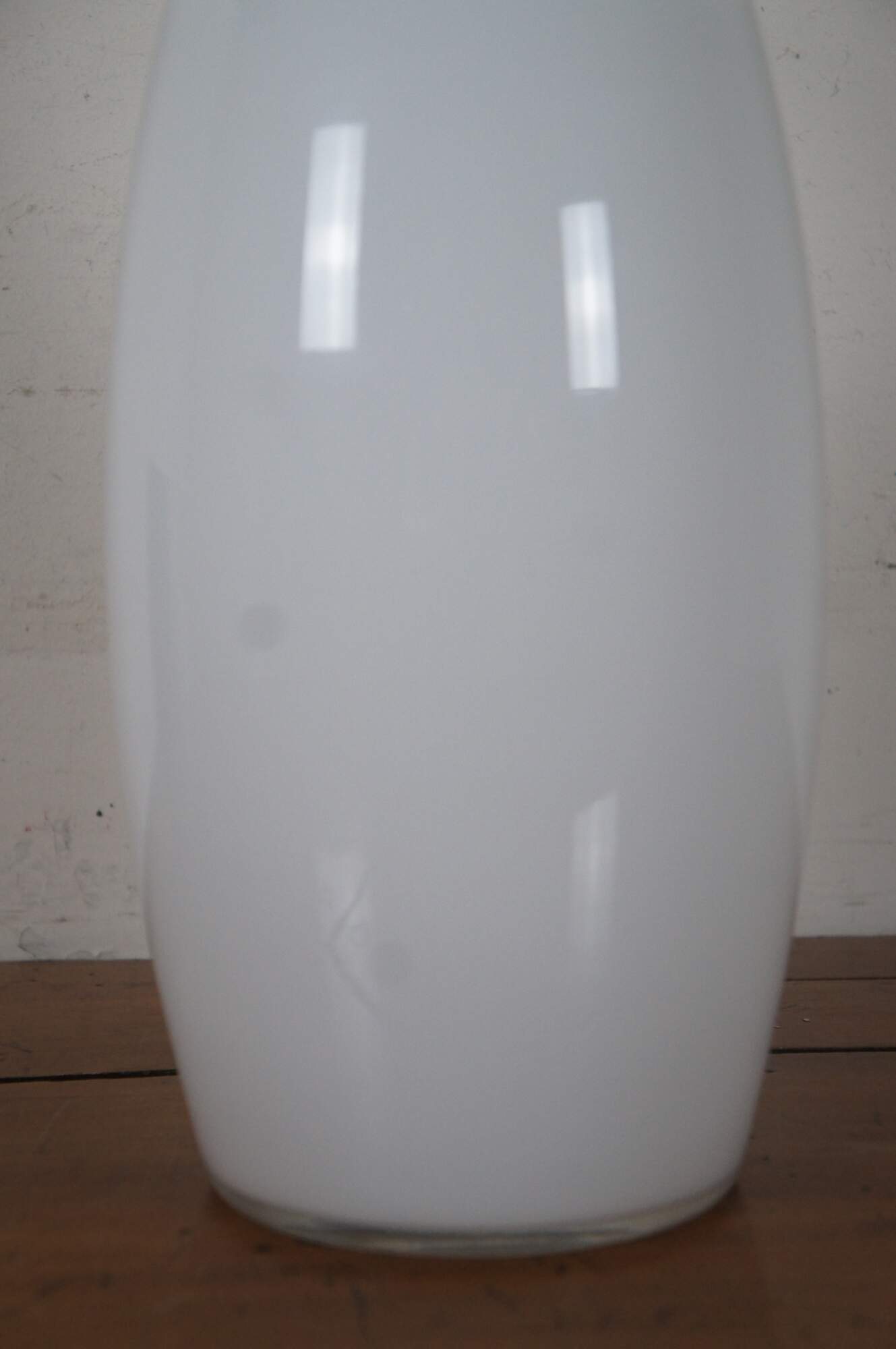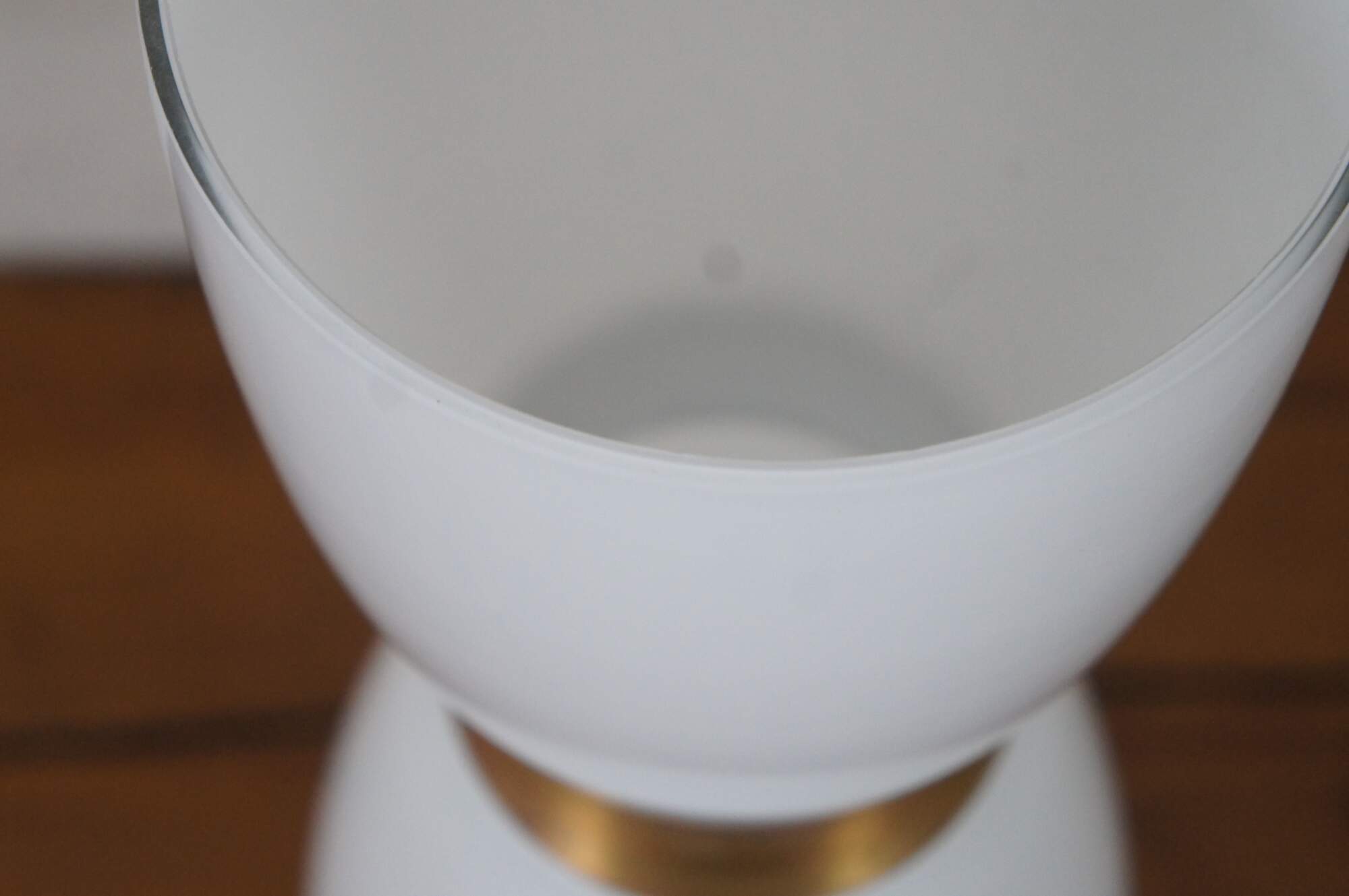 Alamance hourglass shaped white glass vase cinched with a brass band.