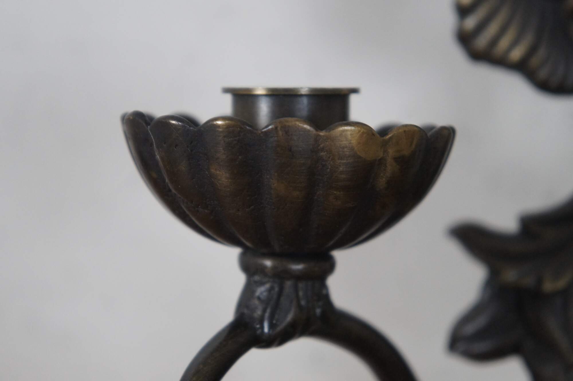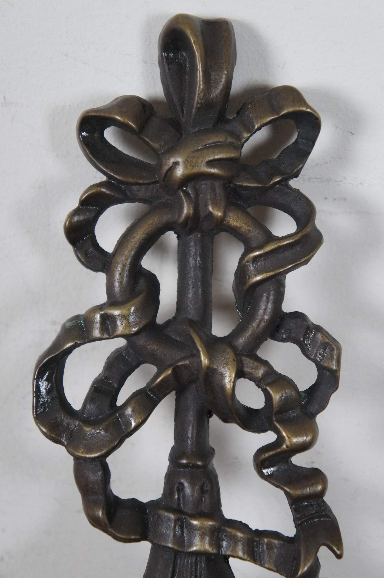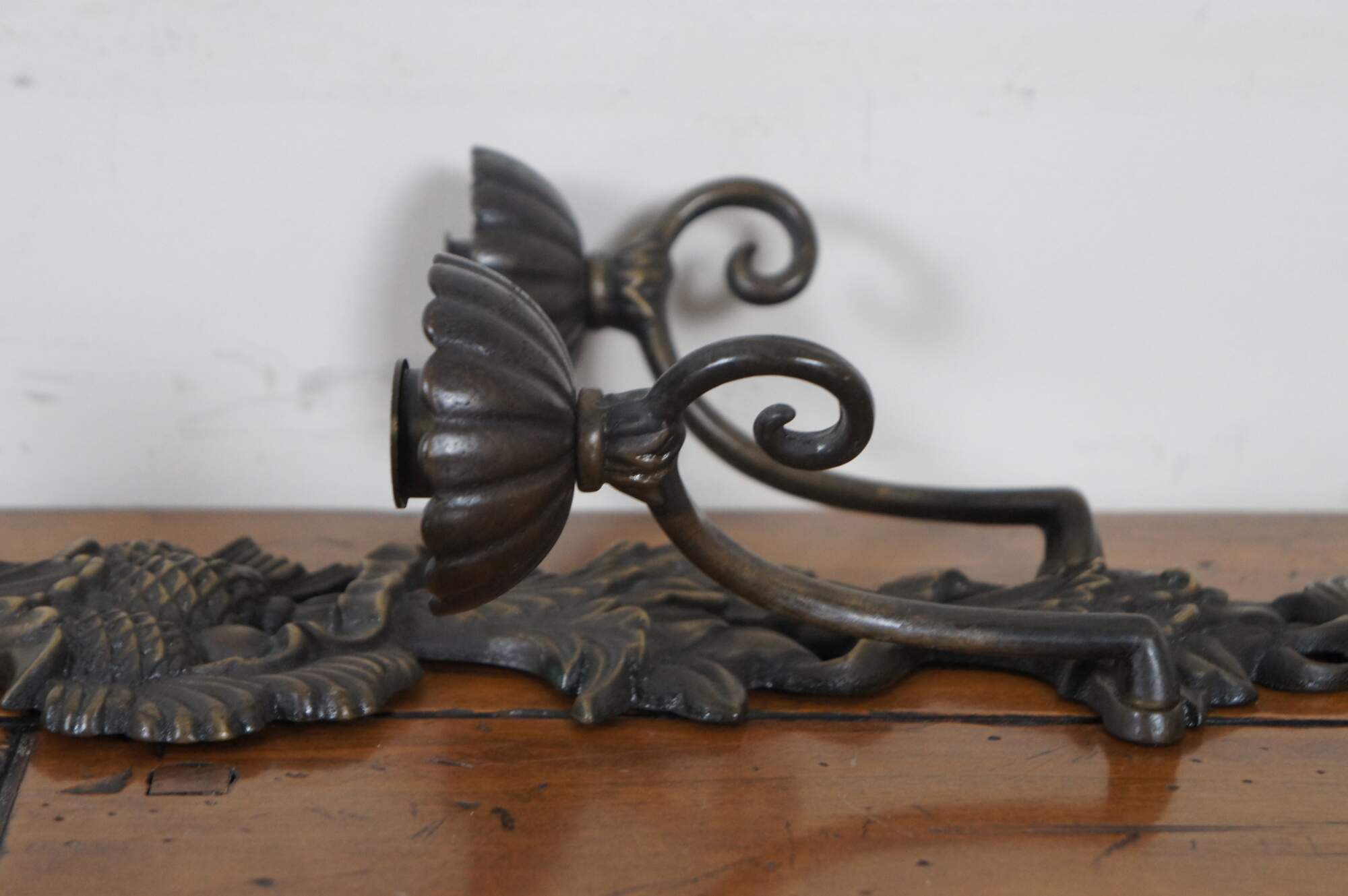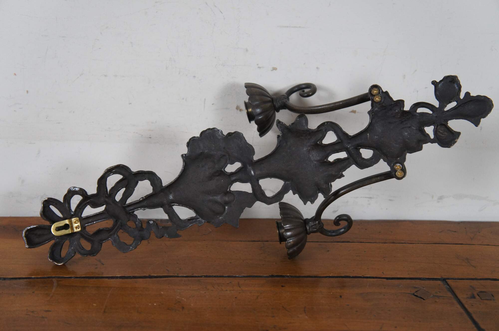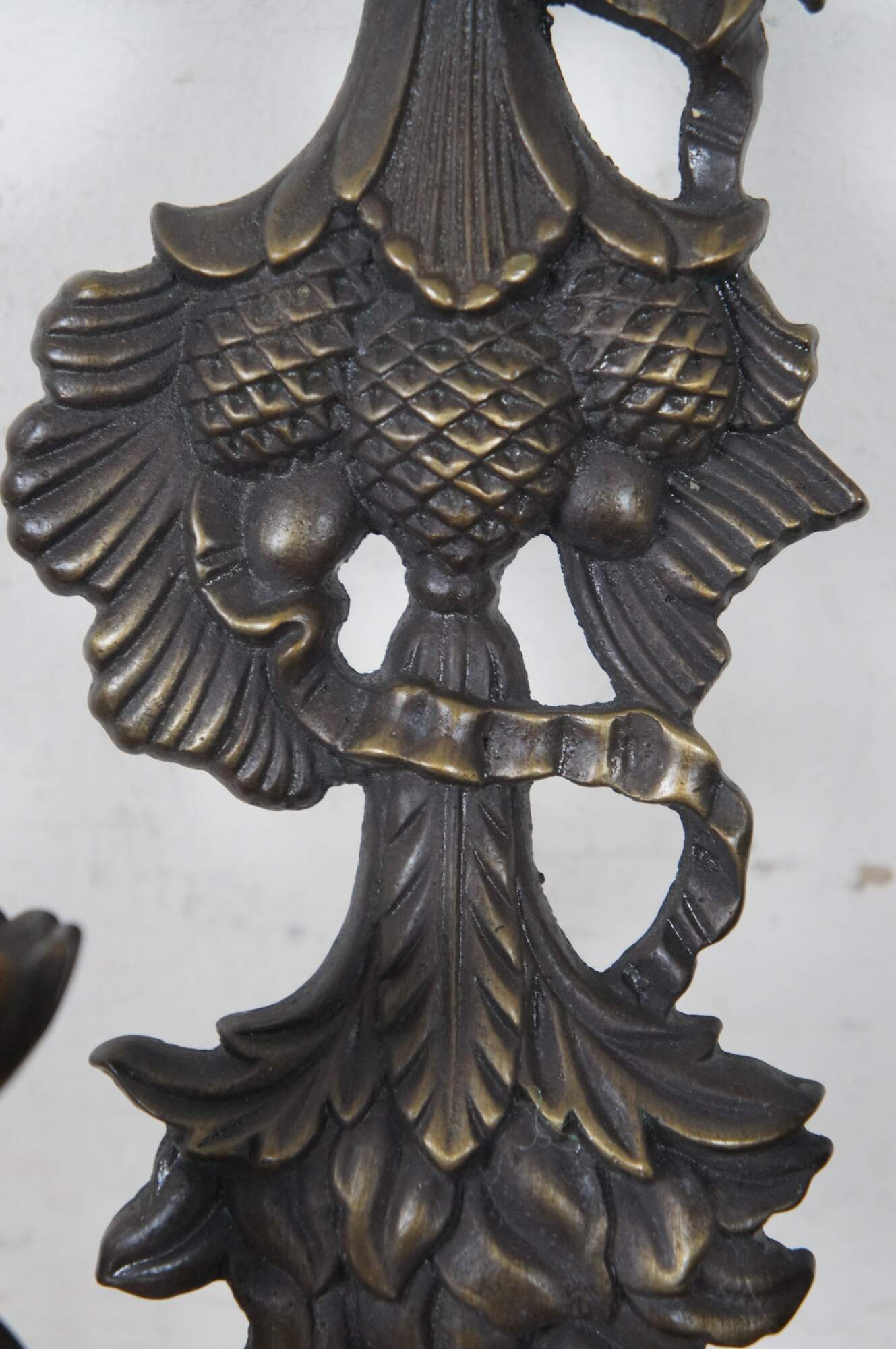 Pair of vintage bronze two light candle sconces featuring a Victorian design of ribbons, leaves and pine cones.