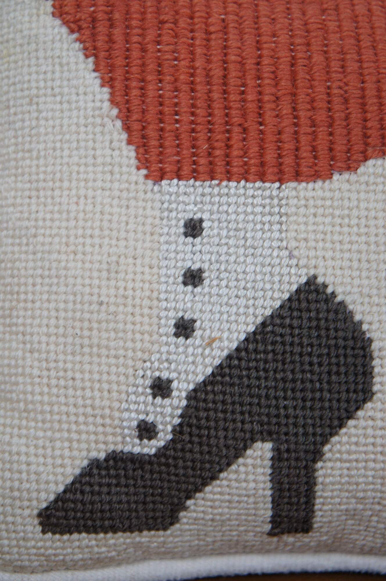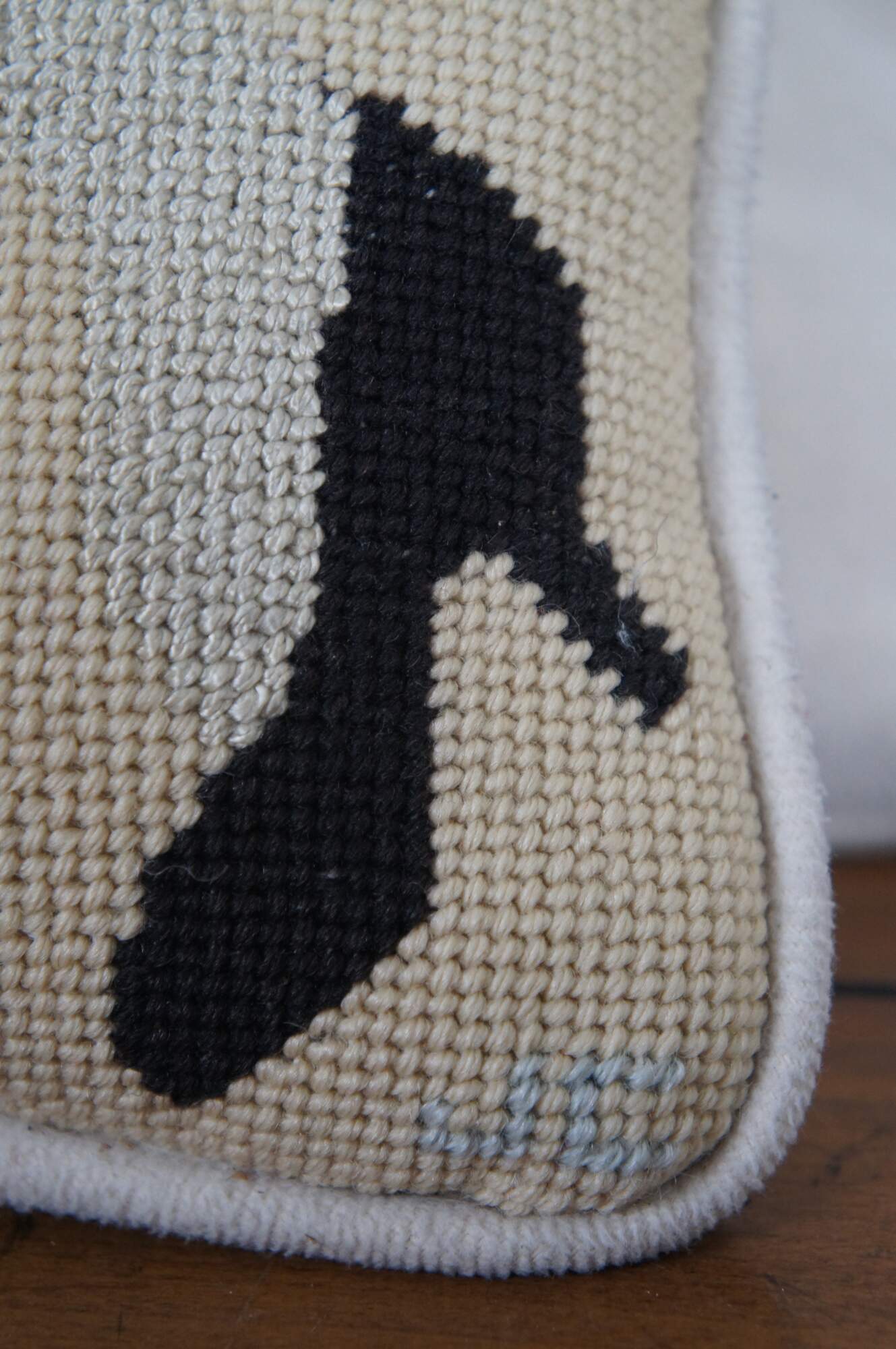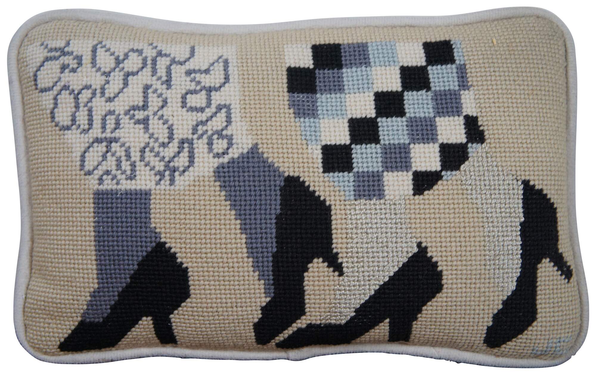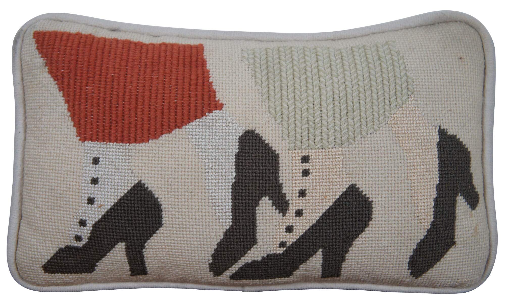 Set of two vintage miniature throw pillows with velour backs and needlepoint fronts, showing the walking feet of women in long skirts,Victorian boots, and high heels, signed with the initials JC.