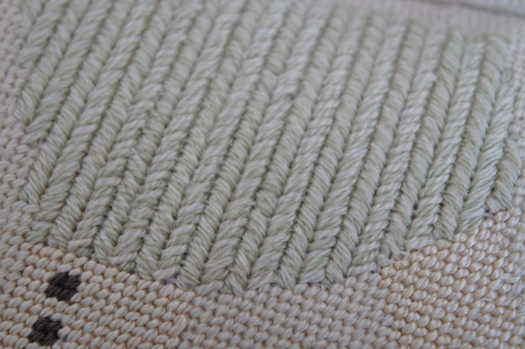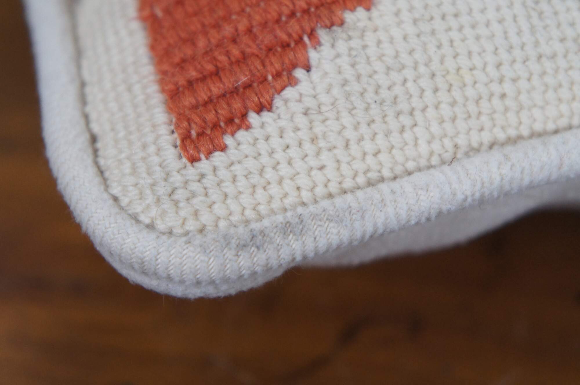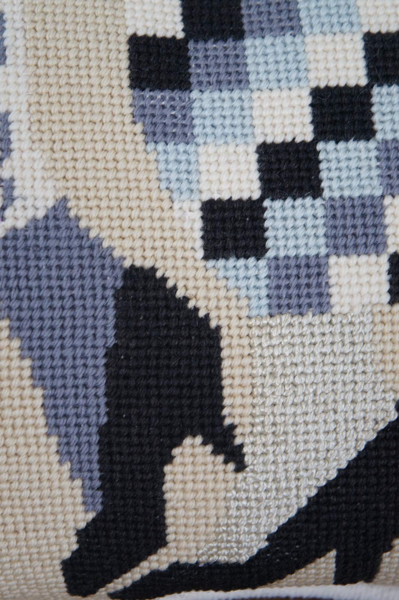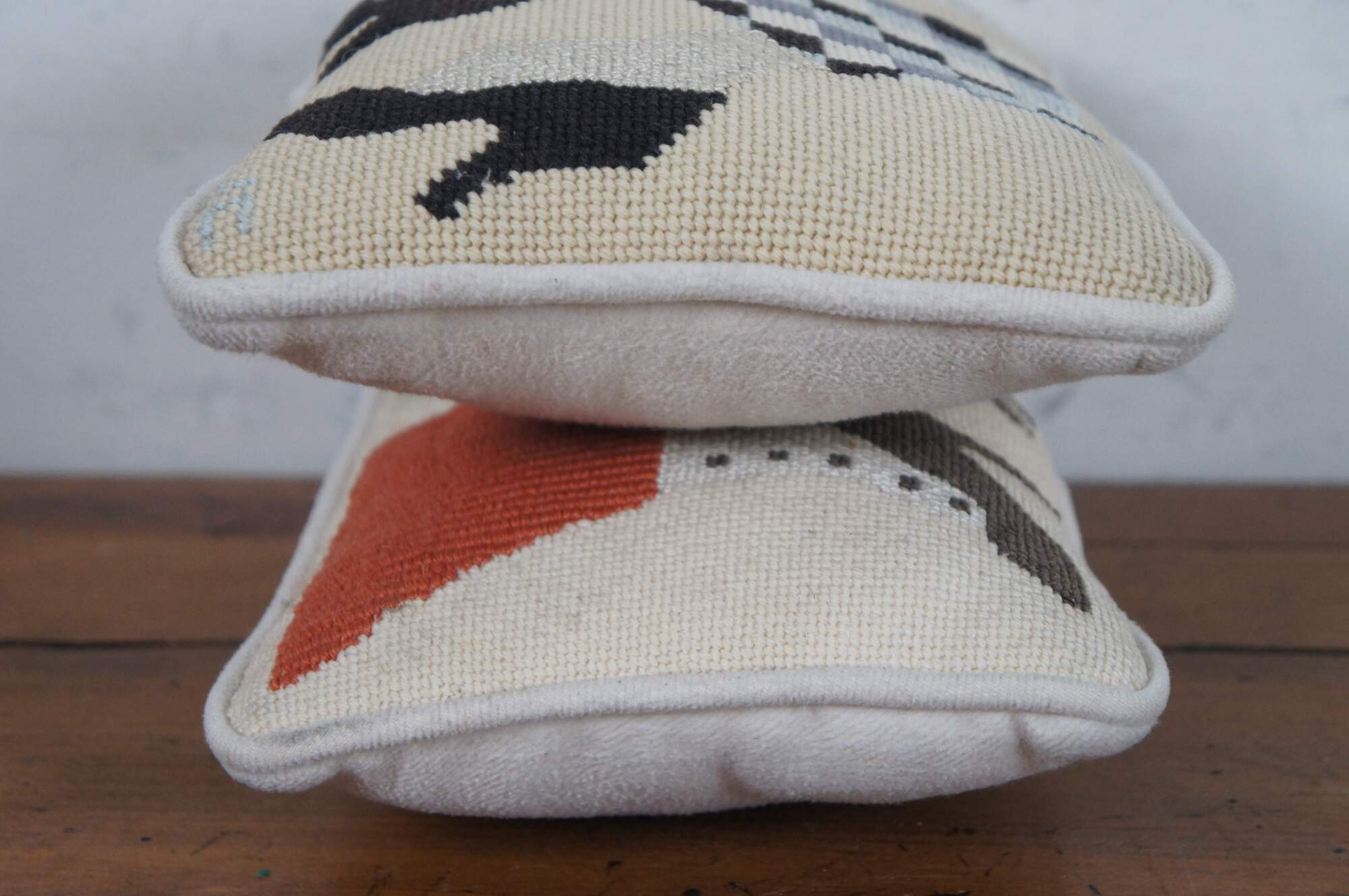 Set of two vintage miniature throw pillows with velour backs and needlepoint fronts, showing the walking feet of women in long skirts,Victorian boots, and high heels, signed with the initials JC.