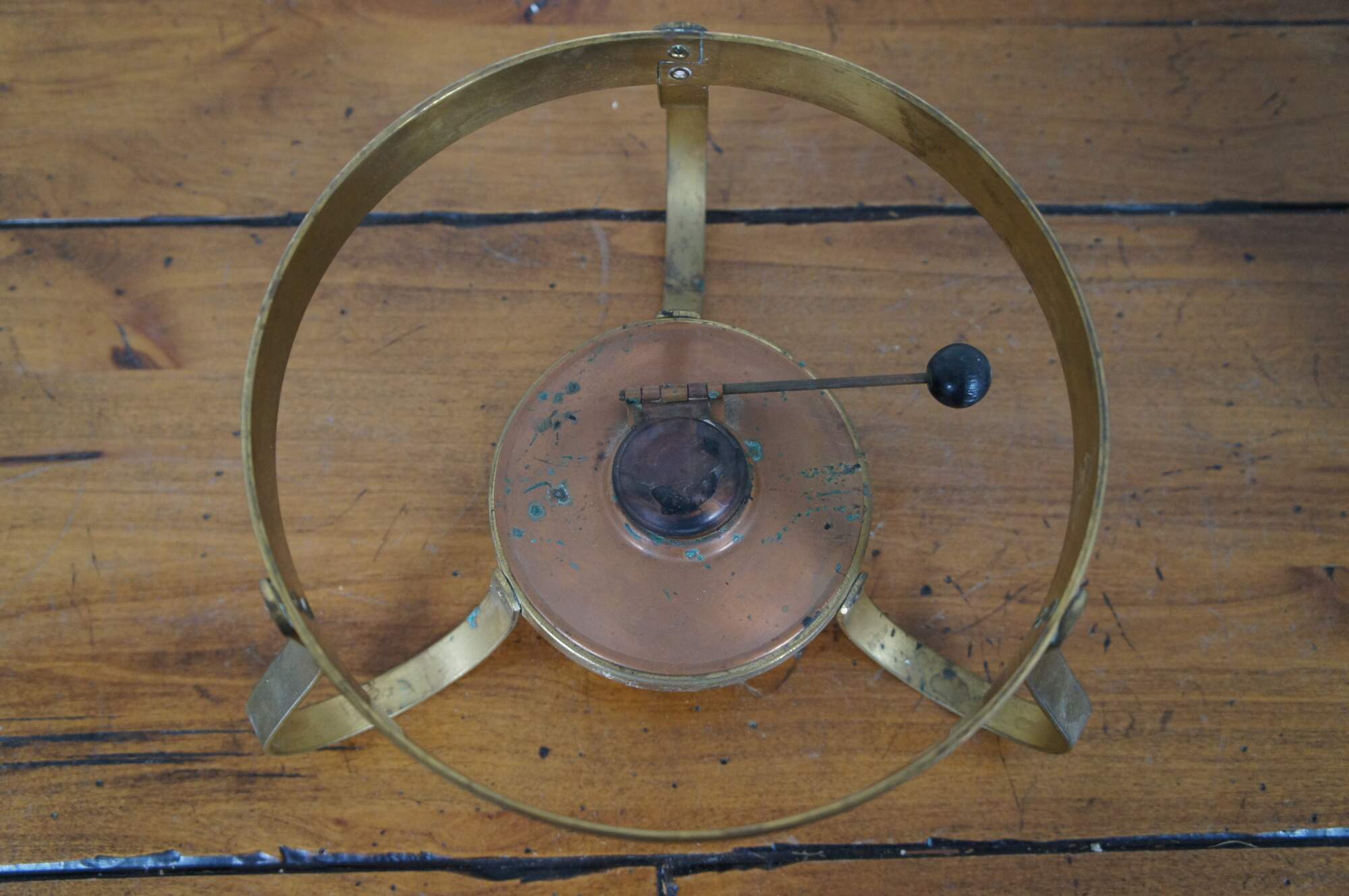 Vintage Wittcrosse chafing dish set including a brass stand, copper oil lamp / burner, and a two-part warming pan with lid.