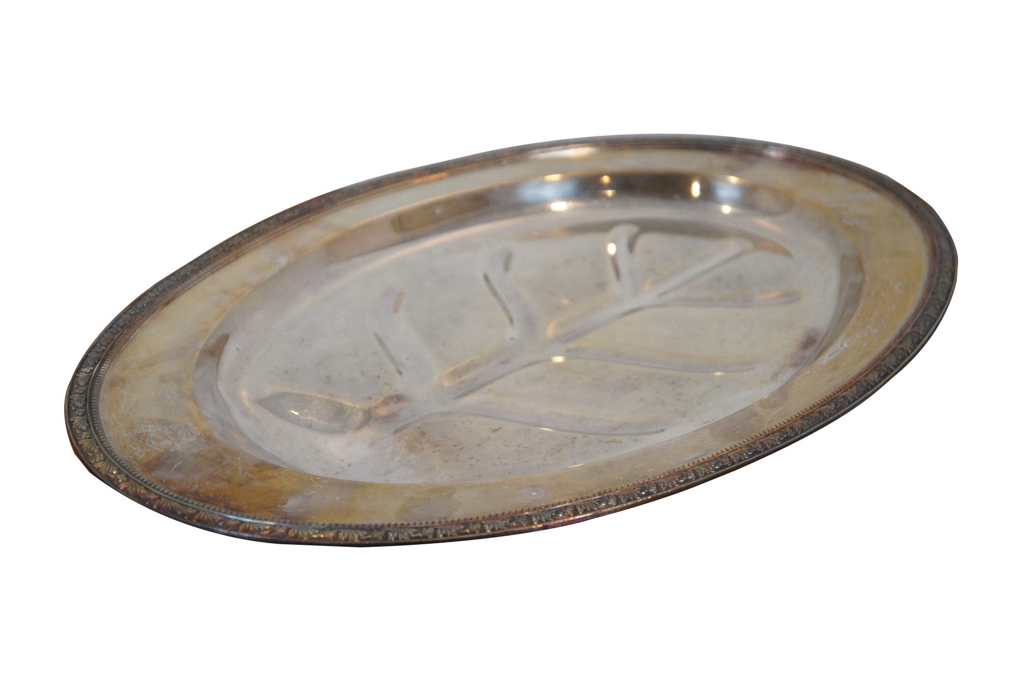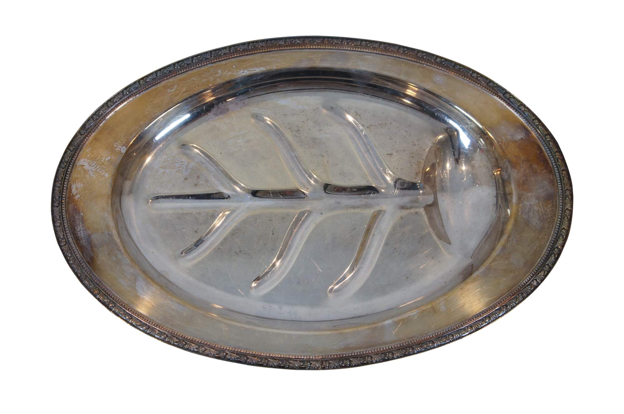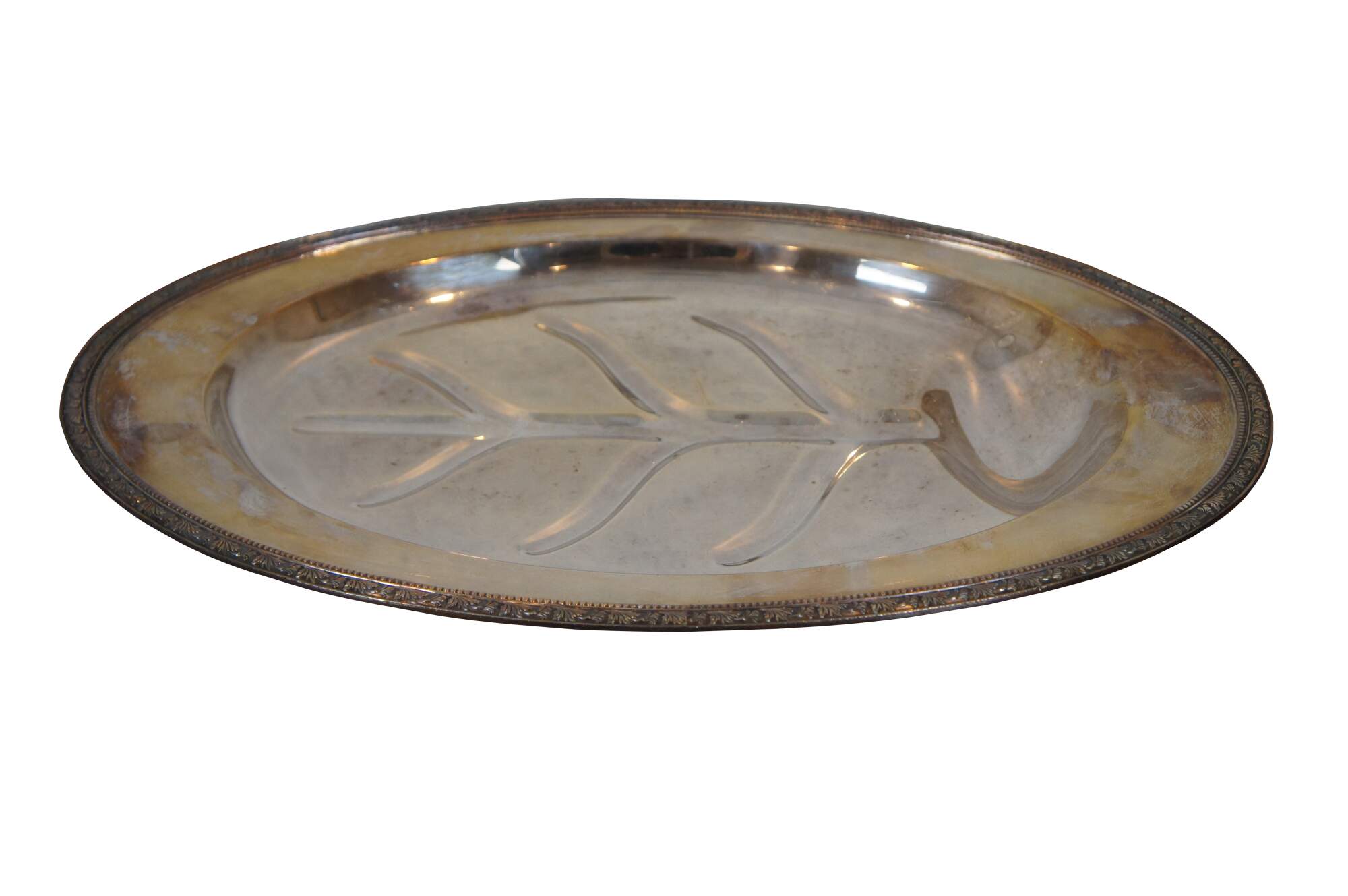 Vintage William A Rogers silverplate footed oval meat tray / serving platter in the Arbor pattern, with Tree of Life style well for drippings, bordered with a beaded and foliate leaf design.