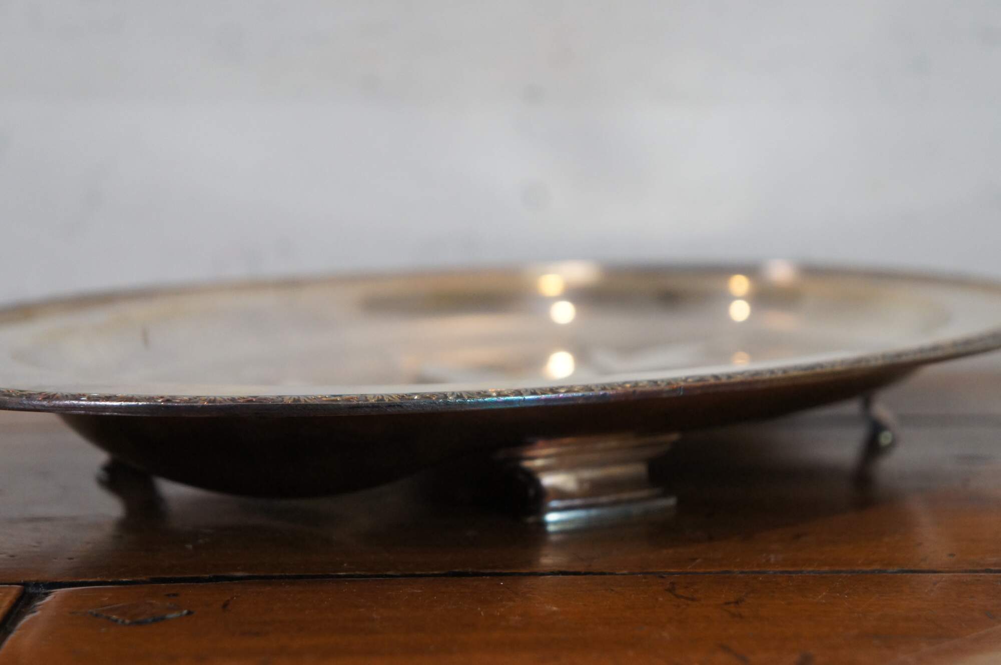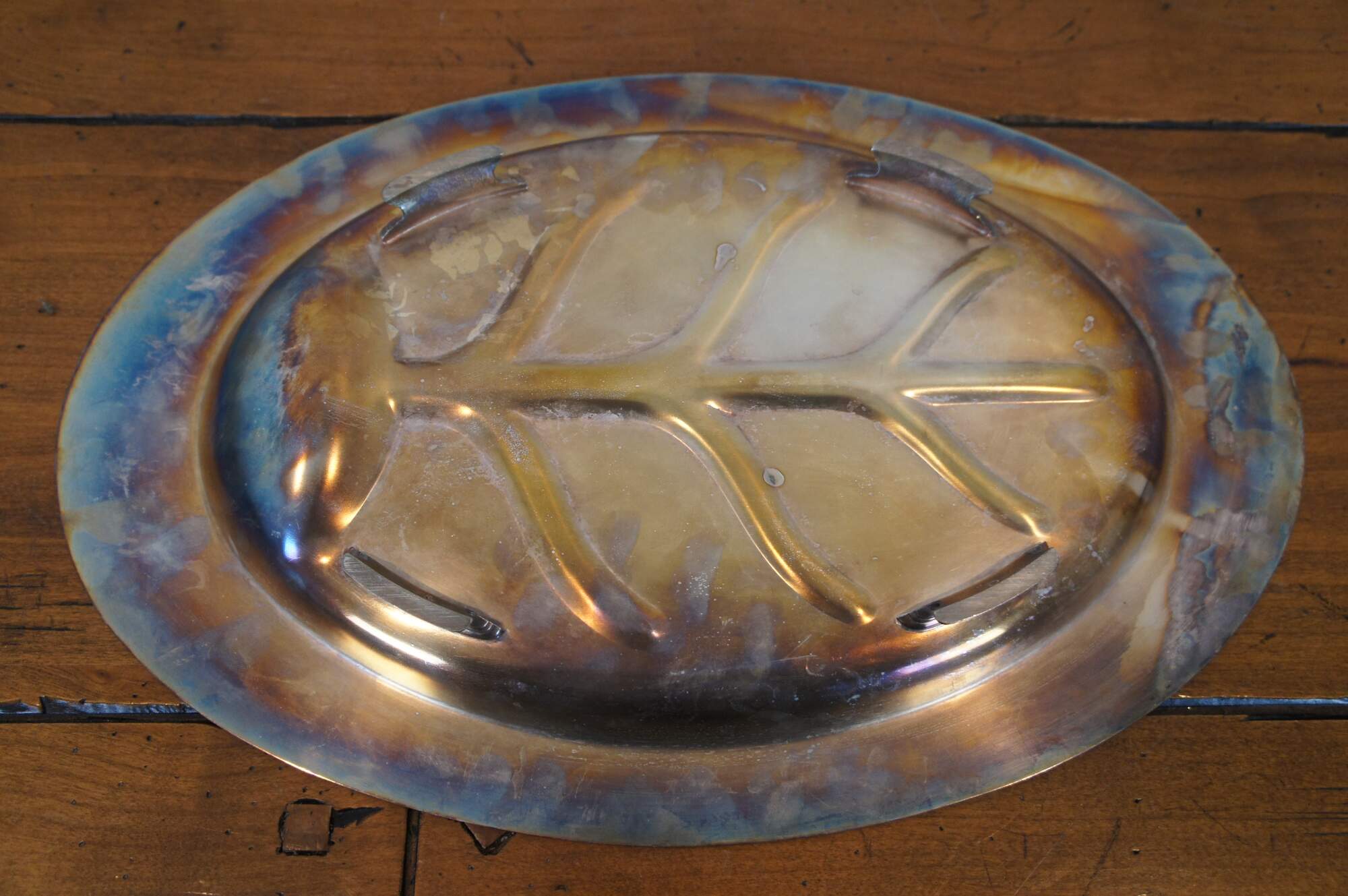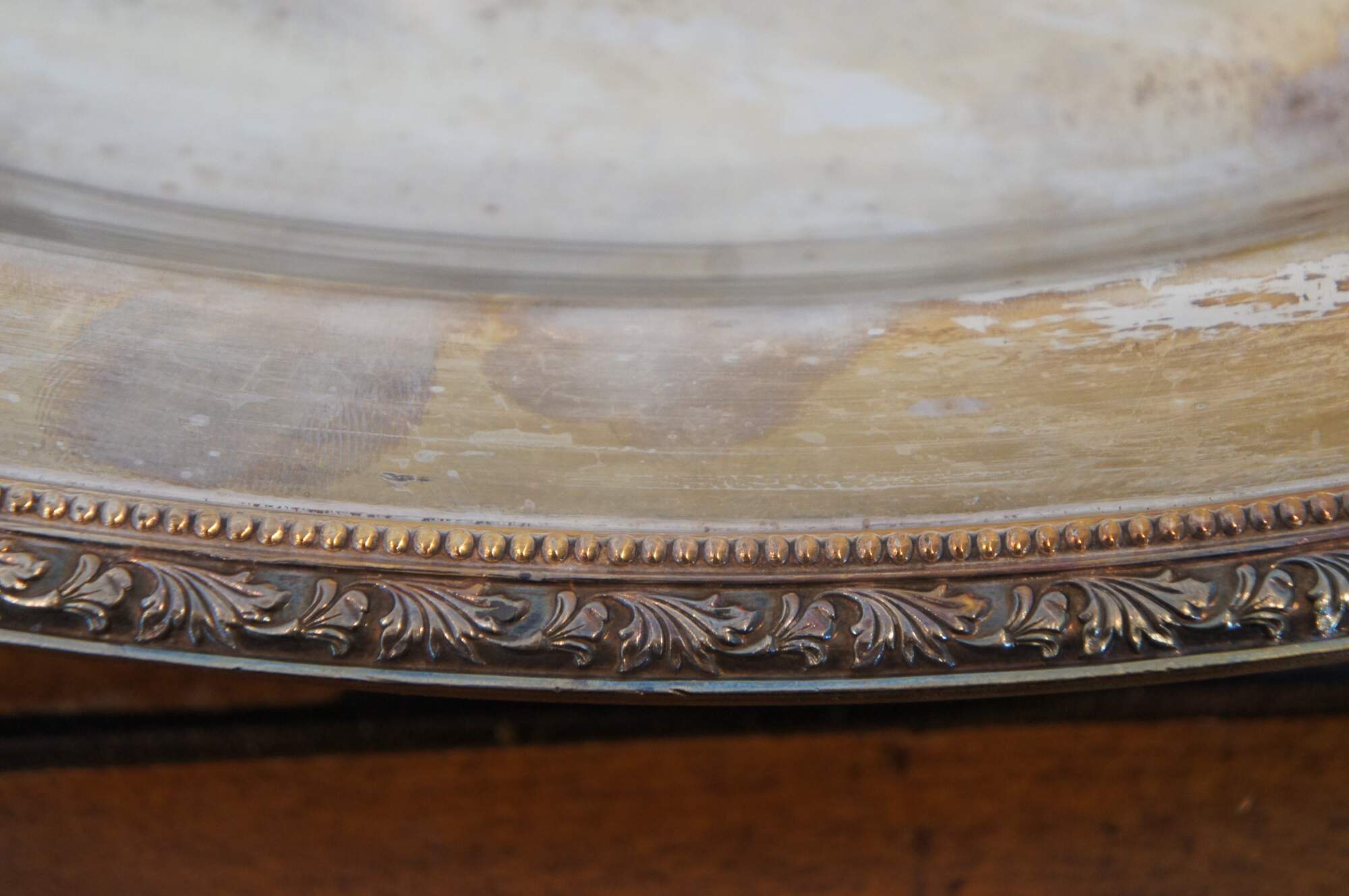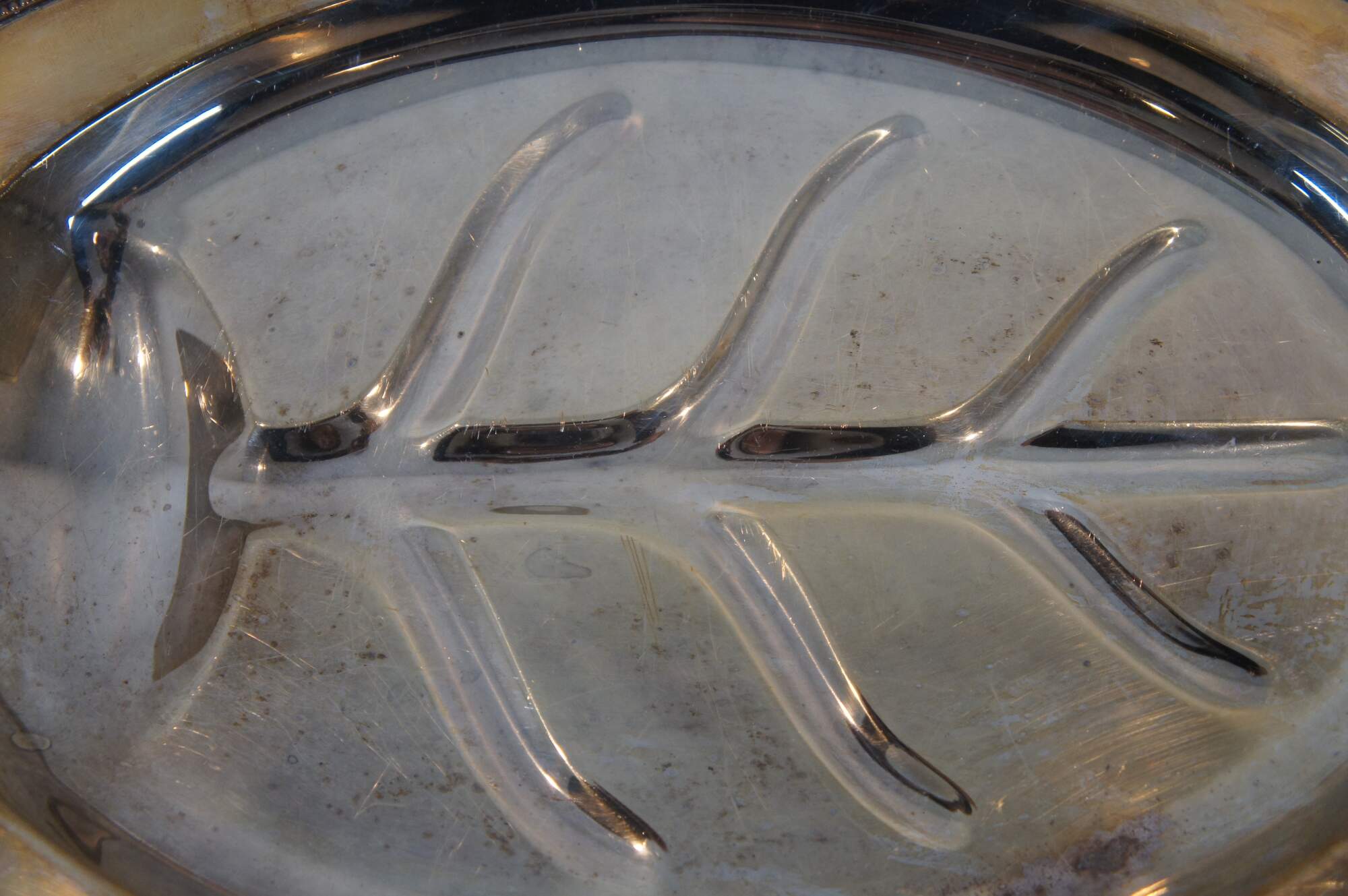 Vintage William A Rogers silverplate footed oval meat tray / serving platter in the Arbor pattern, with Tree of Life style well for drippings, bordered with a beaded and foliate leaf design.