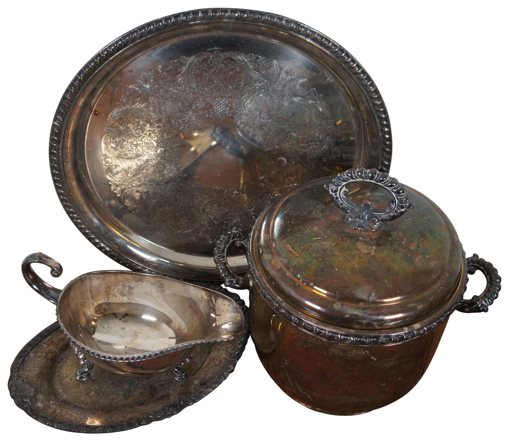 4 Vintage Silver Plate Serving Pieces Ice Bucket Tray Platter Gravy Sauce Boat