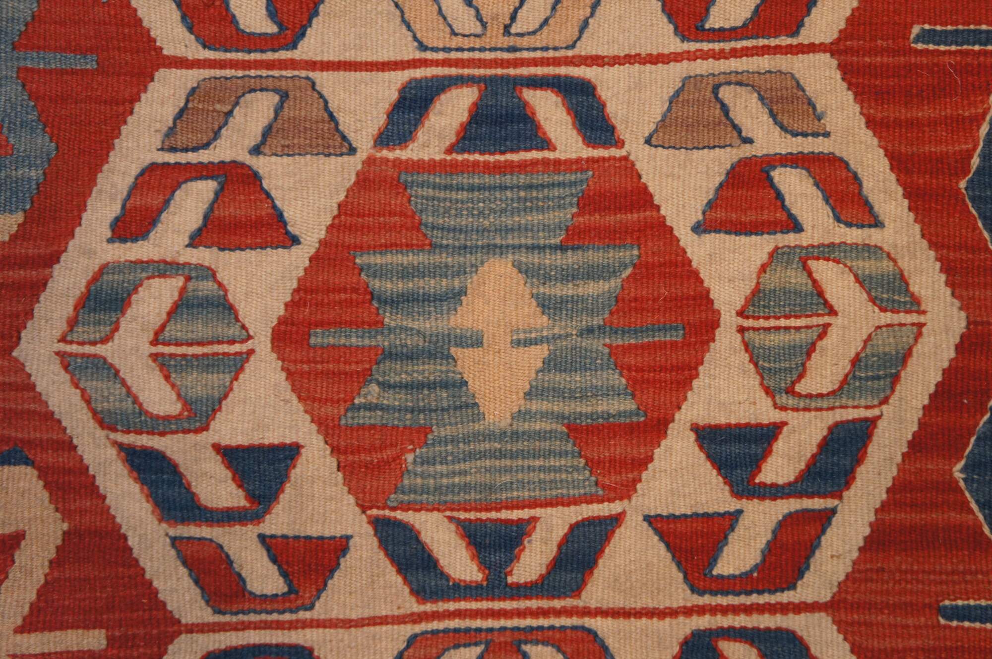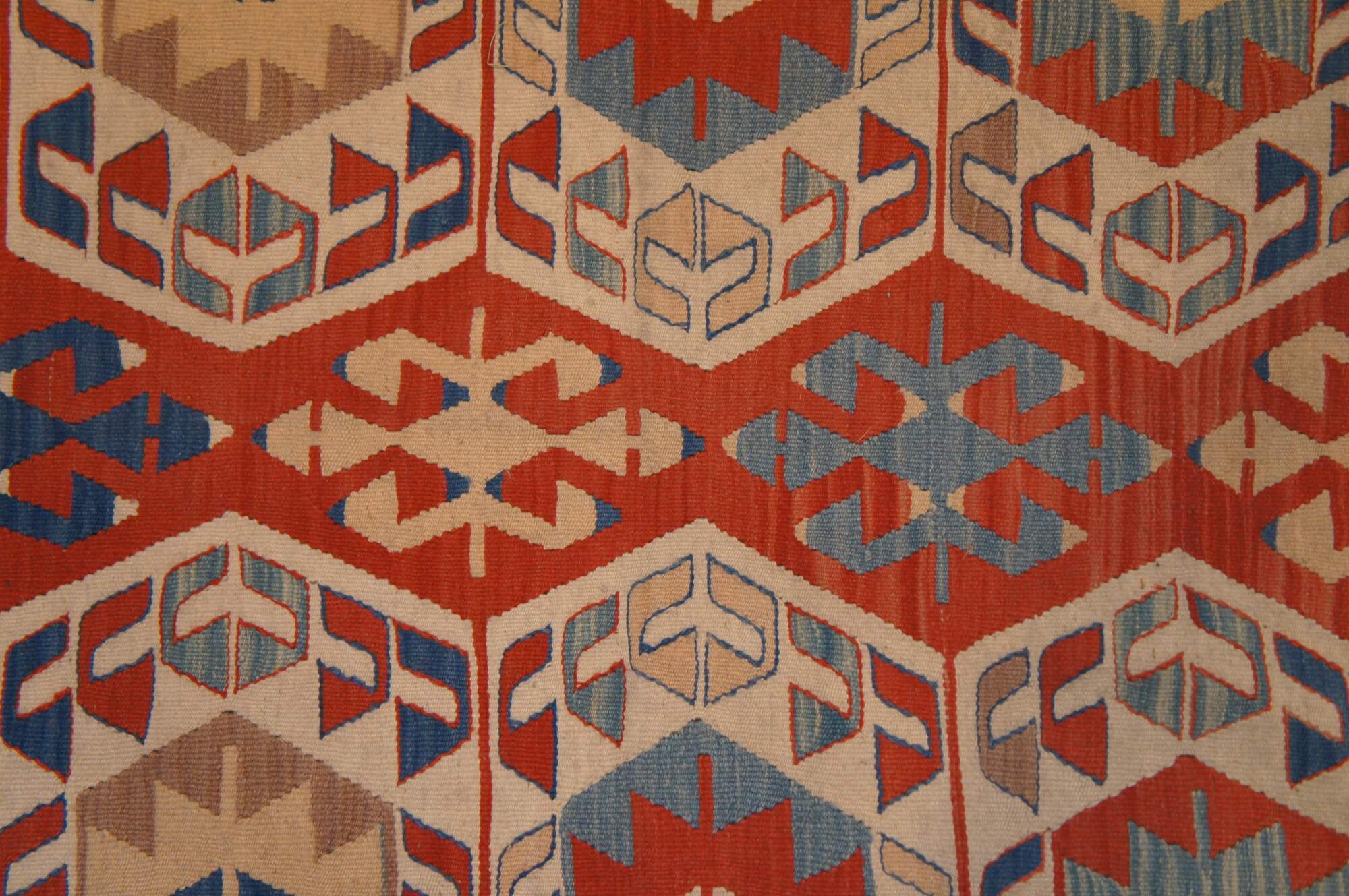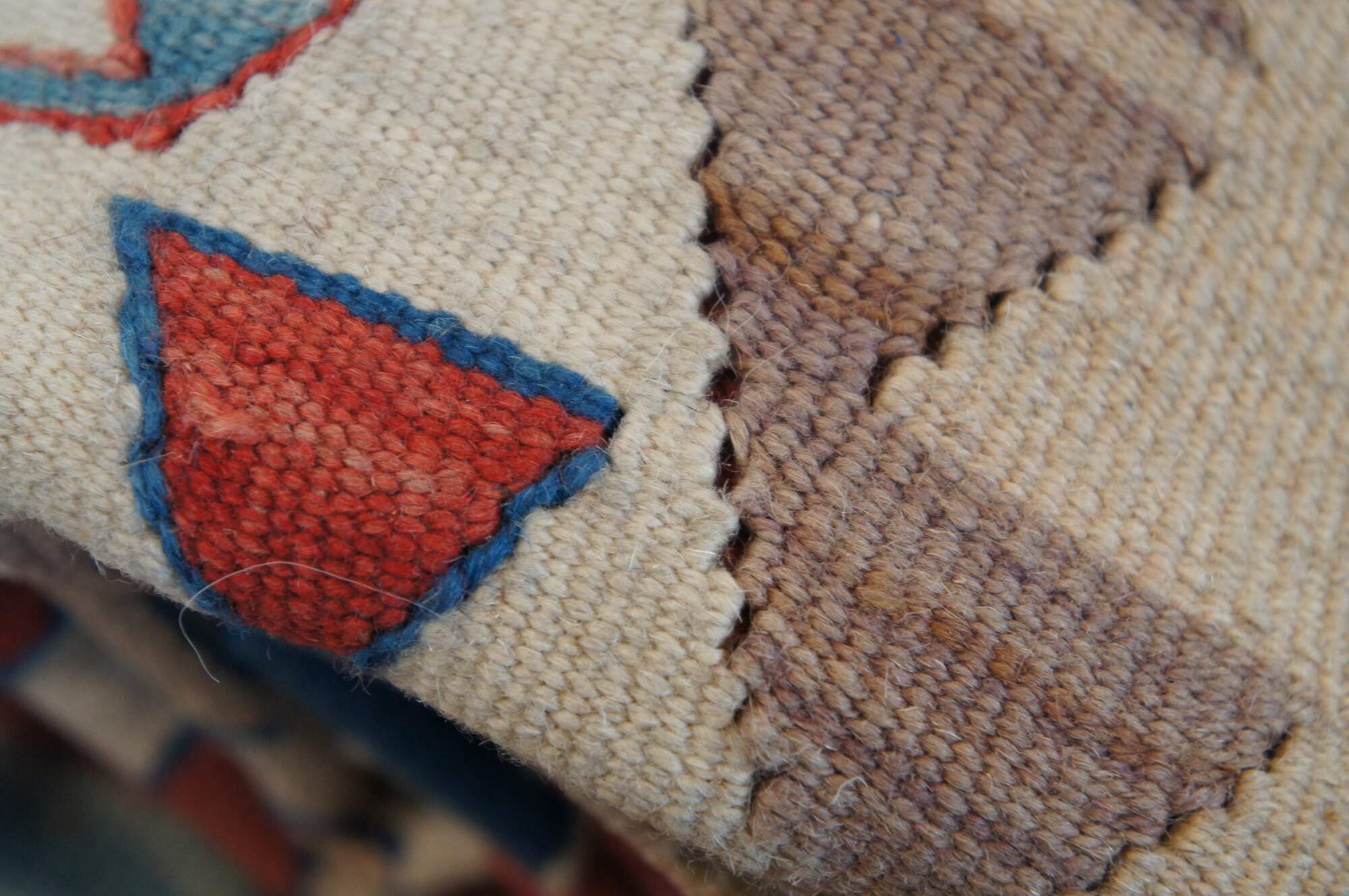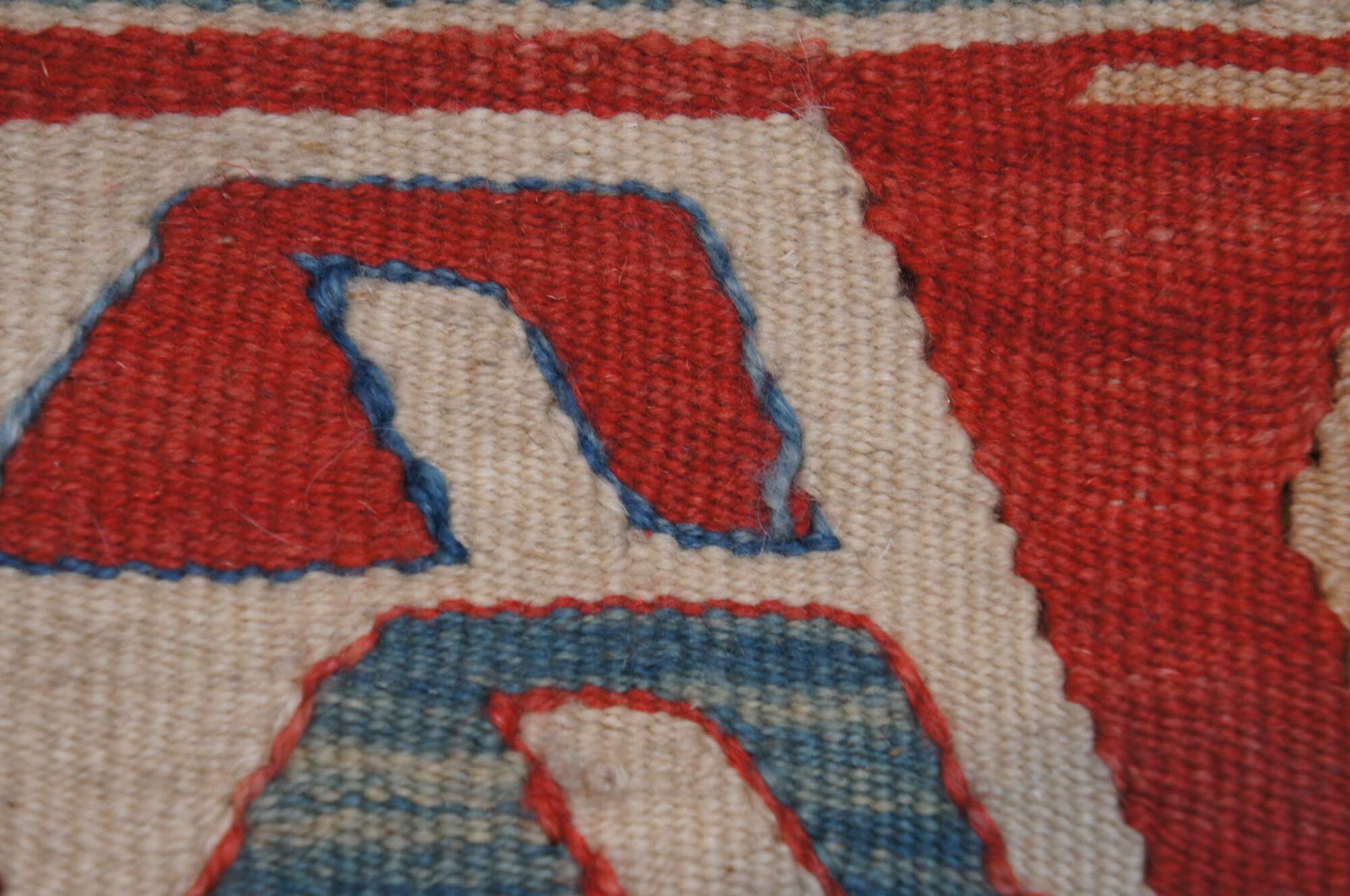 Weavers pack the weft tightly to completely cover the warp and often favor diagonal patterns so as to avoid weakening the structure of the rug with vertical slits. It produces bold, sharp patterns that weavers enjoy creating with more freedom allowed than a plainweave. This is also why kilims are so closely associated with geometrical designs even though there are are kilims with floral designs as well. This is the most common weaving technique used to create geometric and diagonal patterned kilims. The slit refers to the gap left between two blocks of color. It is created by returning the weft around the last warp in a color area, and the weft of the adjacent color is later returned around the adjacent warp. Weavers pack the weft tightly to completely cover the warp and often favor diagonal patterns so as to avoid weakening the structure of the rug with vertical slits. They work on one color block before moving onto the next. It produces bold, sharp patterns that weavers enjoy creating with more freedom allowed than a plainweave. It also results in a smooth kilim that is reversible with the same pattern on both sides in most cases.”