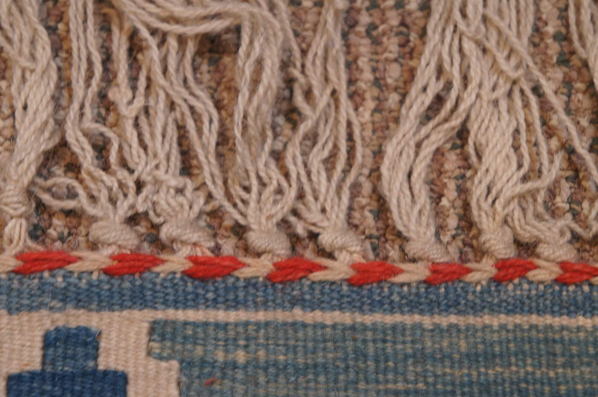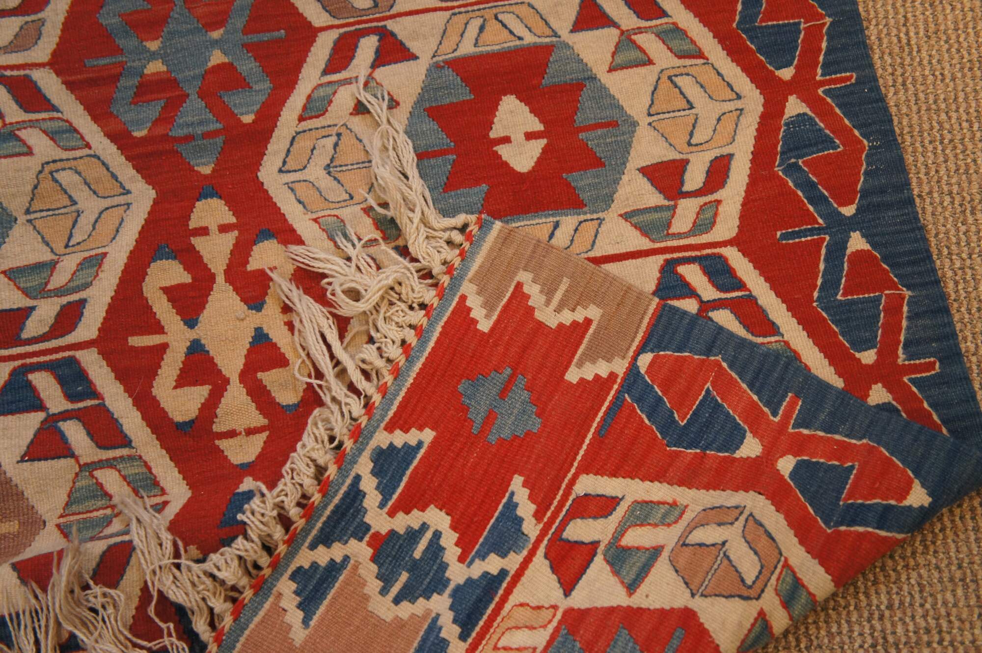 Vintage red, blue and beige geometric Turkish kilim rug with fringe. Approx 3' x 5'.