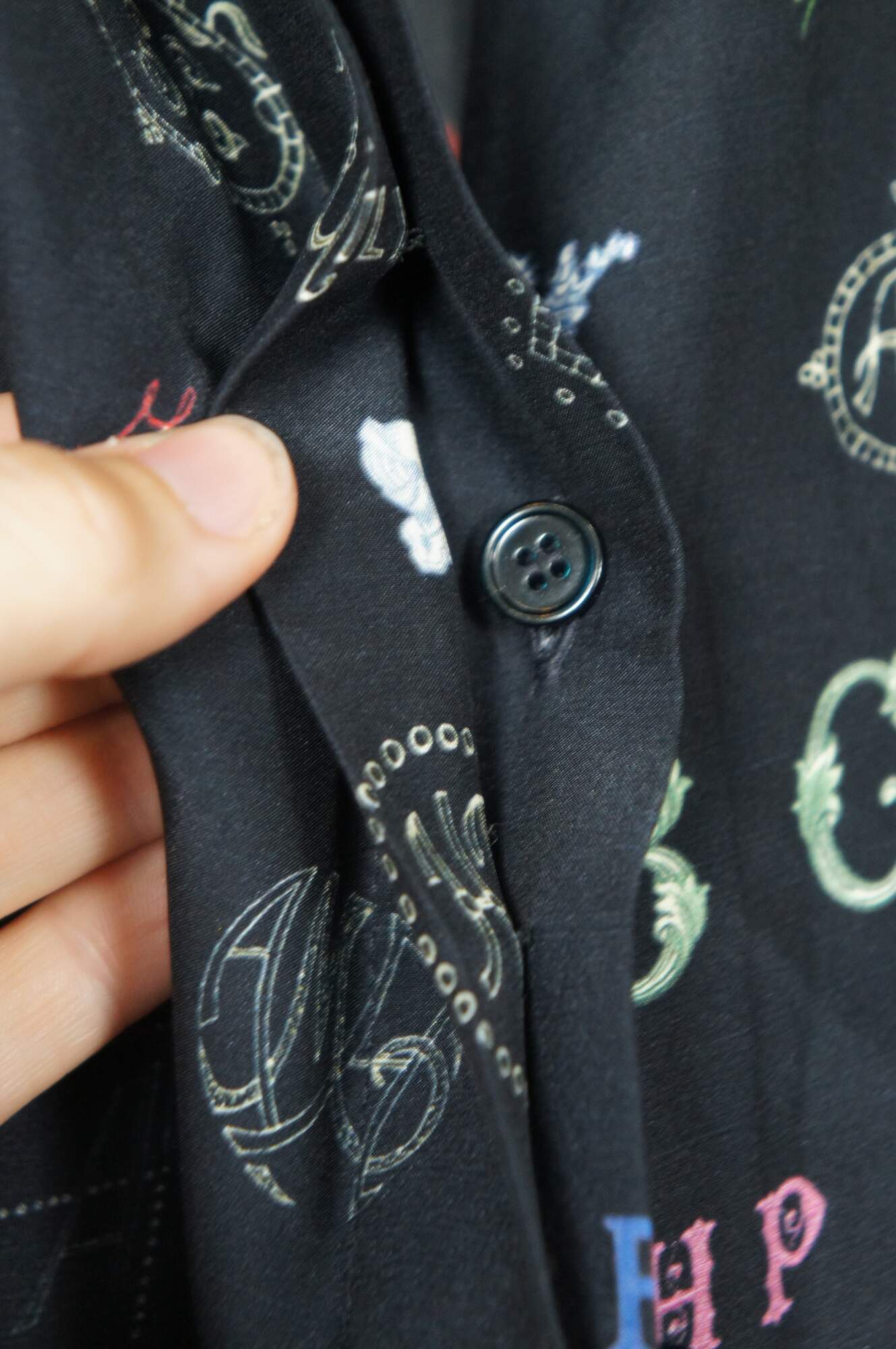 Vintage Stella McCartney 100% silk button up monogram logo shirt / long sleeve blouse with printed pattern on black ground and hem slightly longer in the back then the front. Made in Hungary.