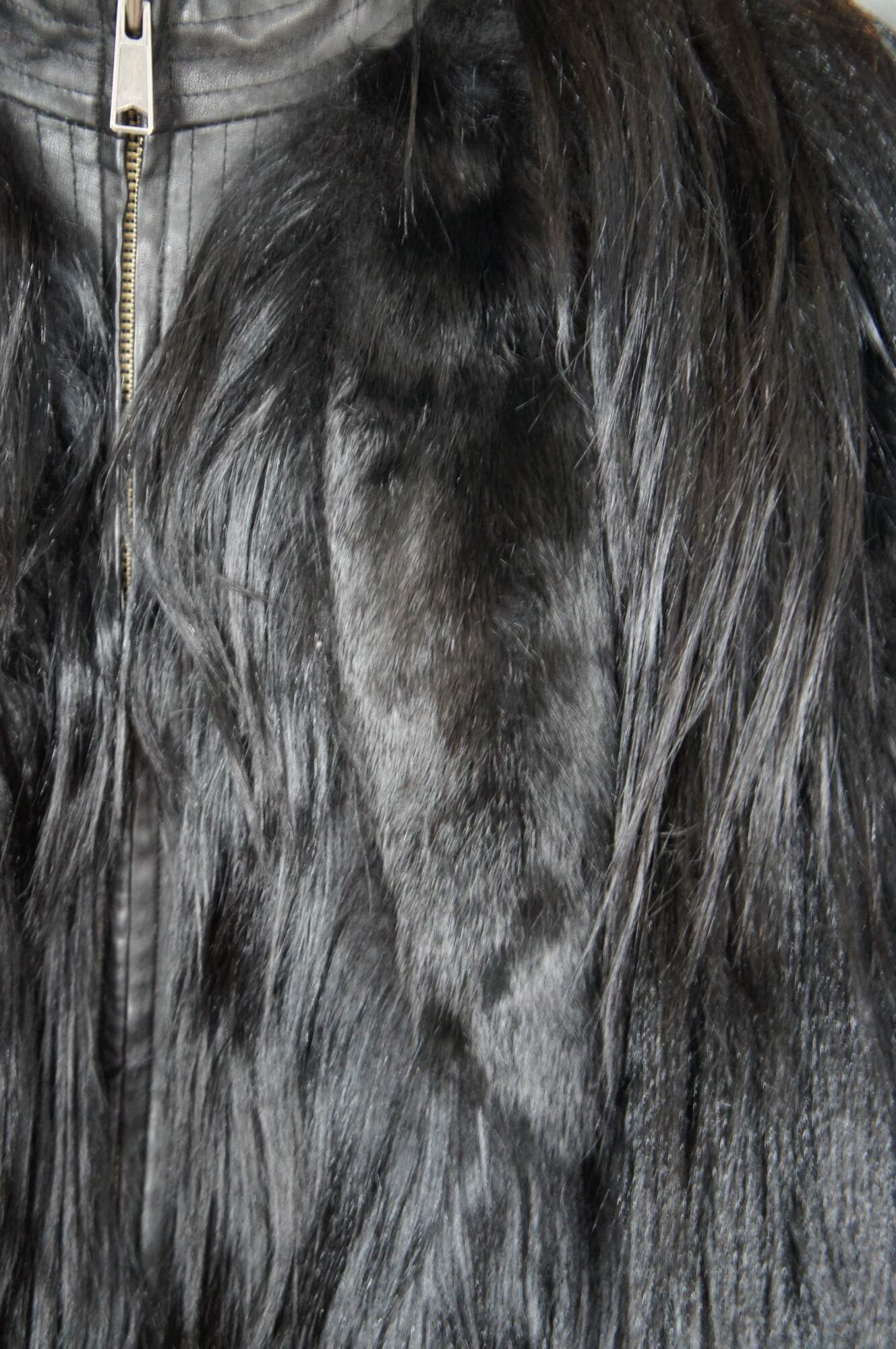 Stunning Elizabeth and James women’s black fur and leather jacket featuring alternating sections of genuine long haired goat fur, rabbit fur and lamb leather. Full zip closure.