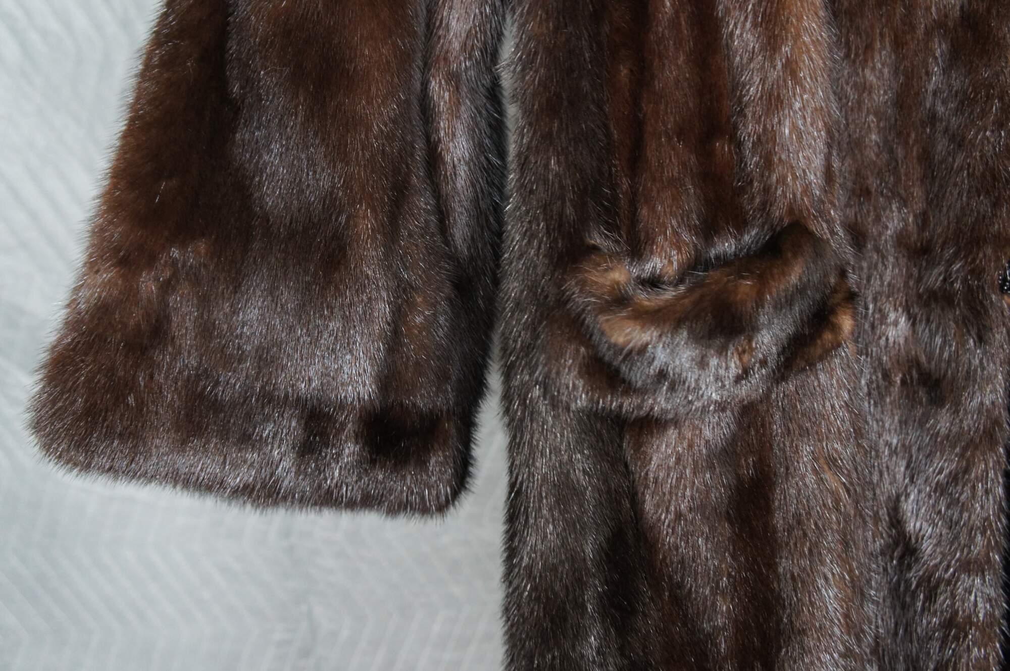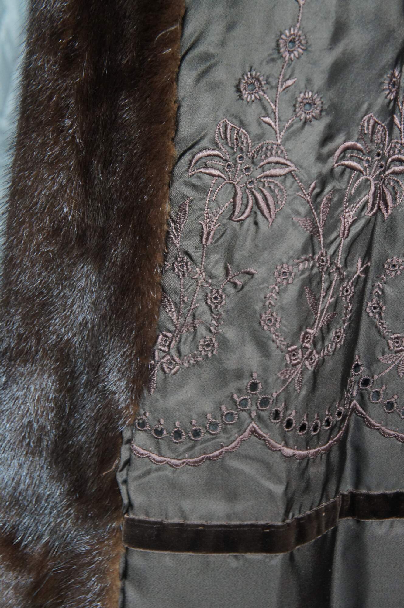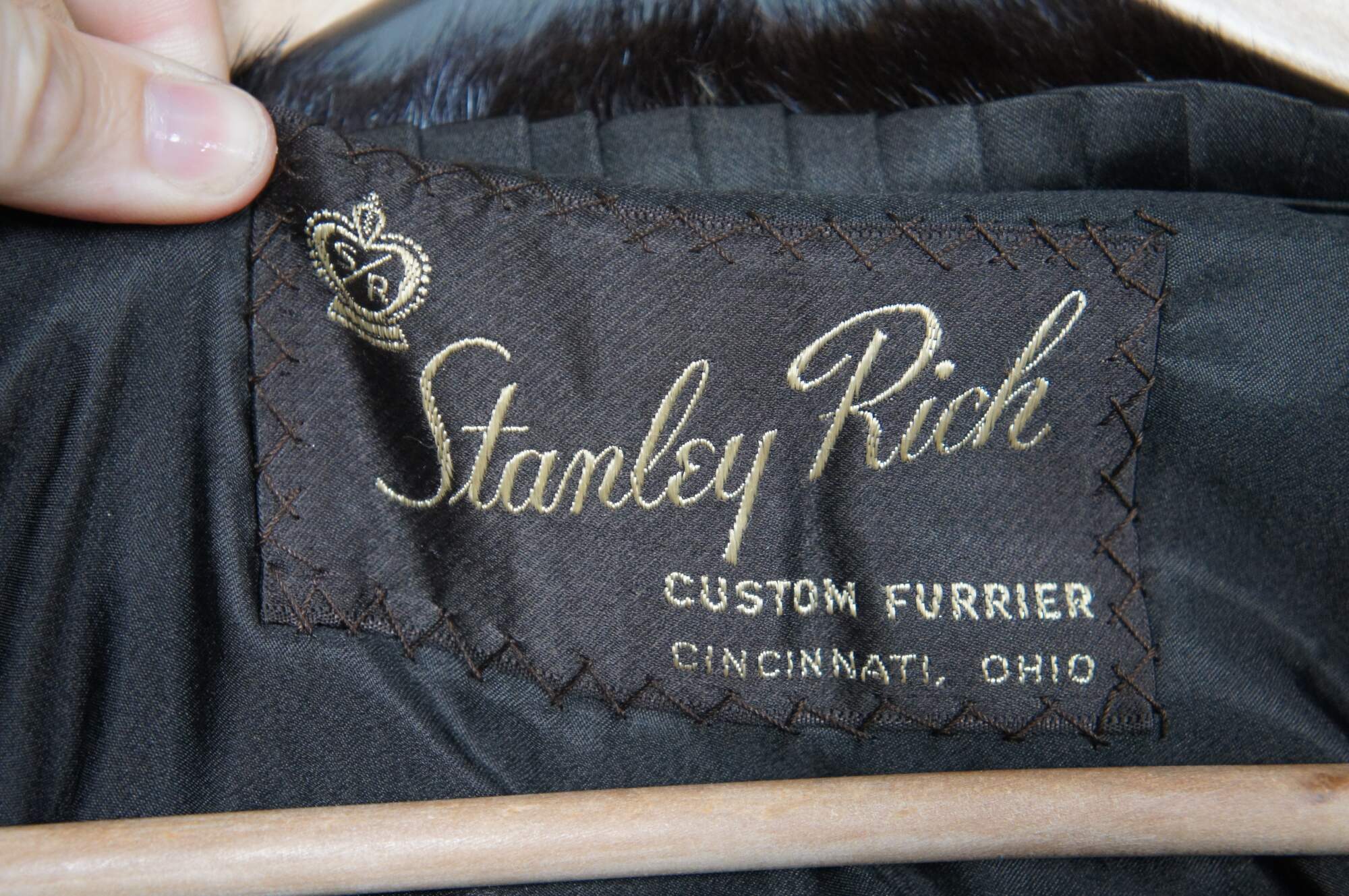 Vintage dark brown mink coat by Stanley Rich of Cincinnati, Ohio, full length with two front pockets, double breasted with two rows of black rhinestone studded buttons, and belt with matching ring buckle. Floral embroidered lining with single interior pocket. Owner was approx. 5'3", 100lbs.