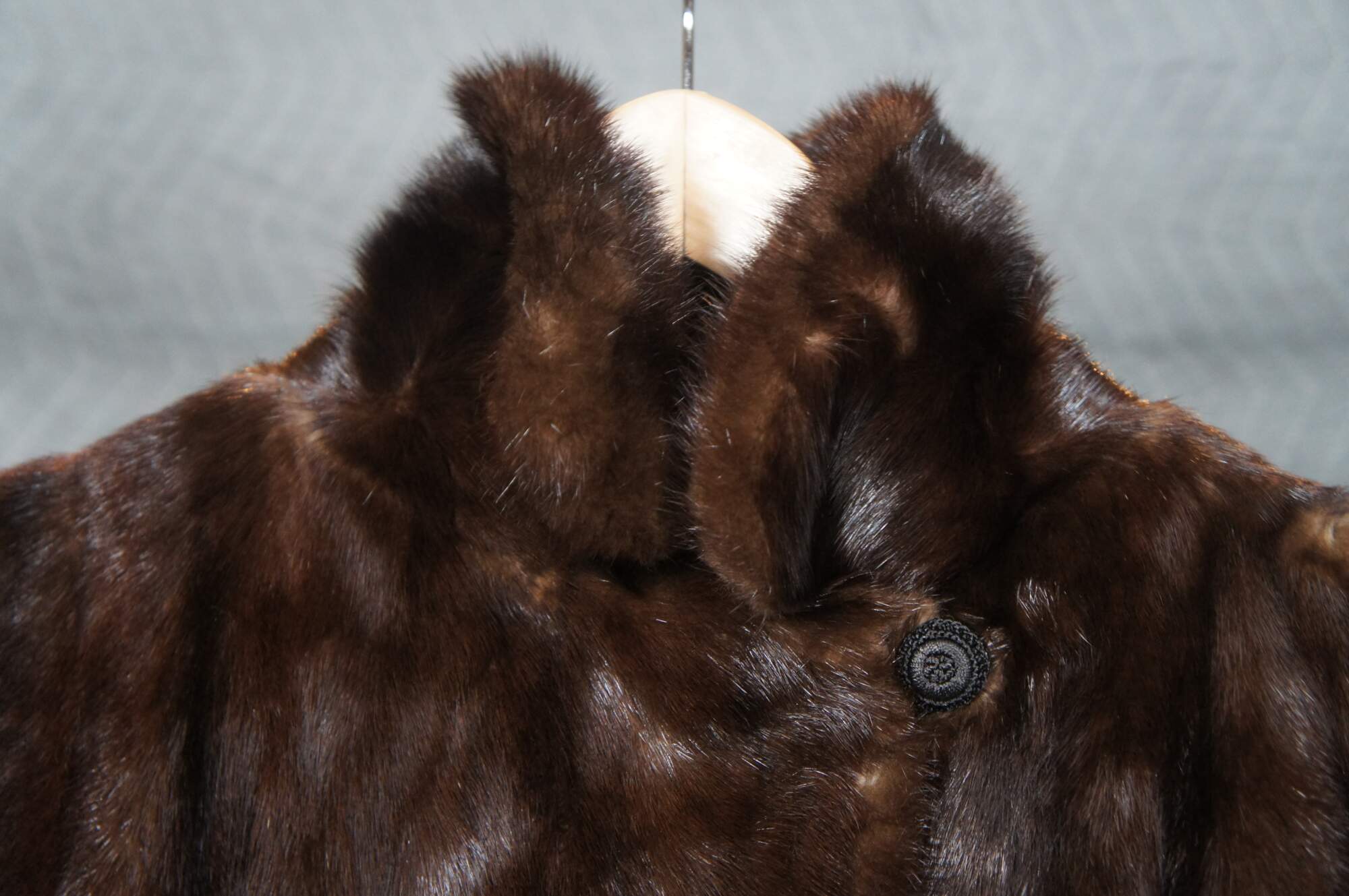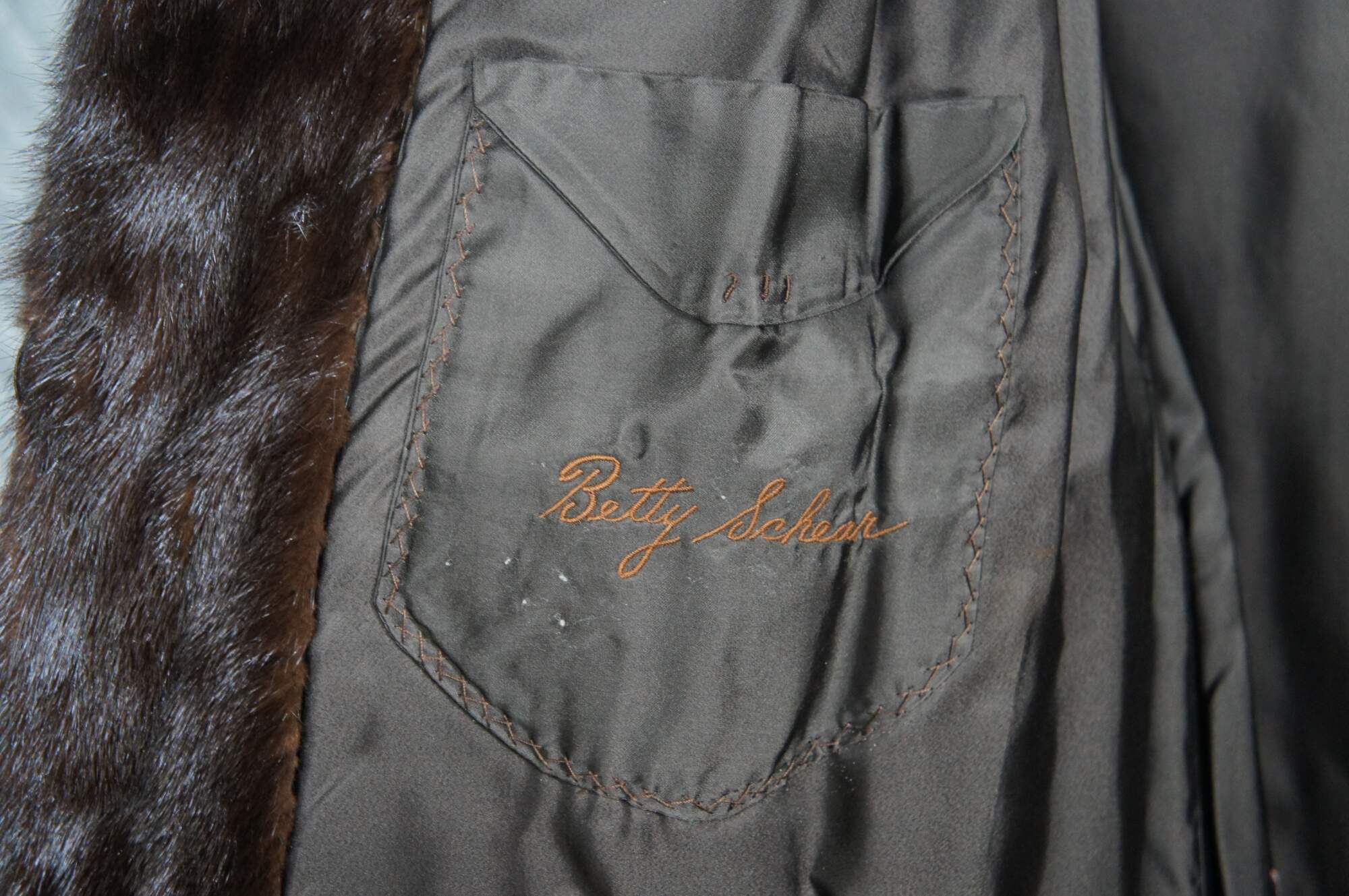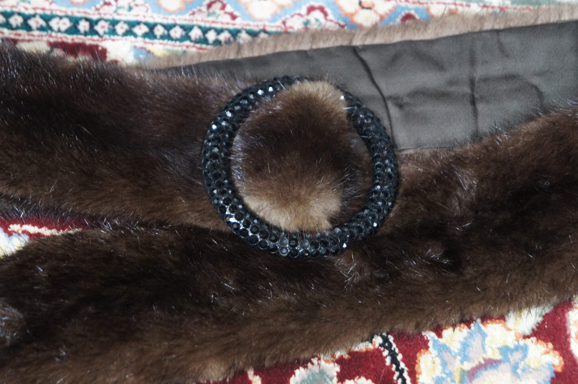 Vintage dark brown mink coat by Stanley Rich of Cincinnati, Ohio, full length with two front pockets, double breasted with two rows of black rhinestone studded buttons, and belt with matching ring buckle. Floral embroidered lining with single interior pocket. Owner was approx. 5'3", 100lbs.