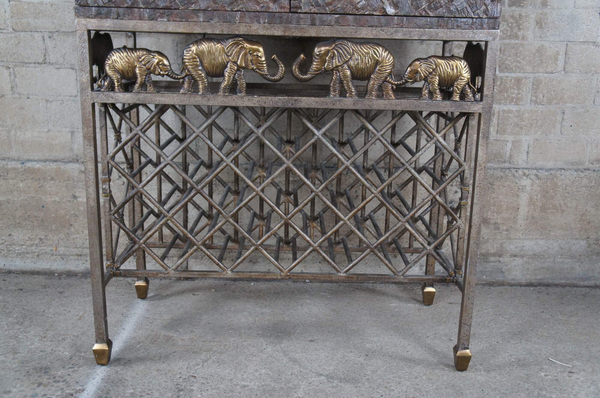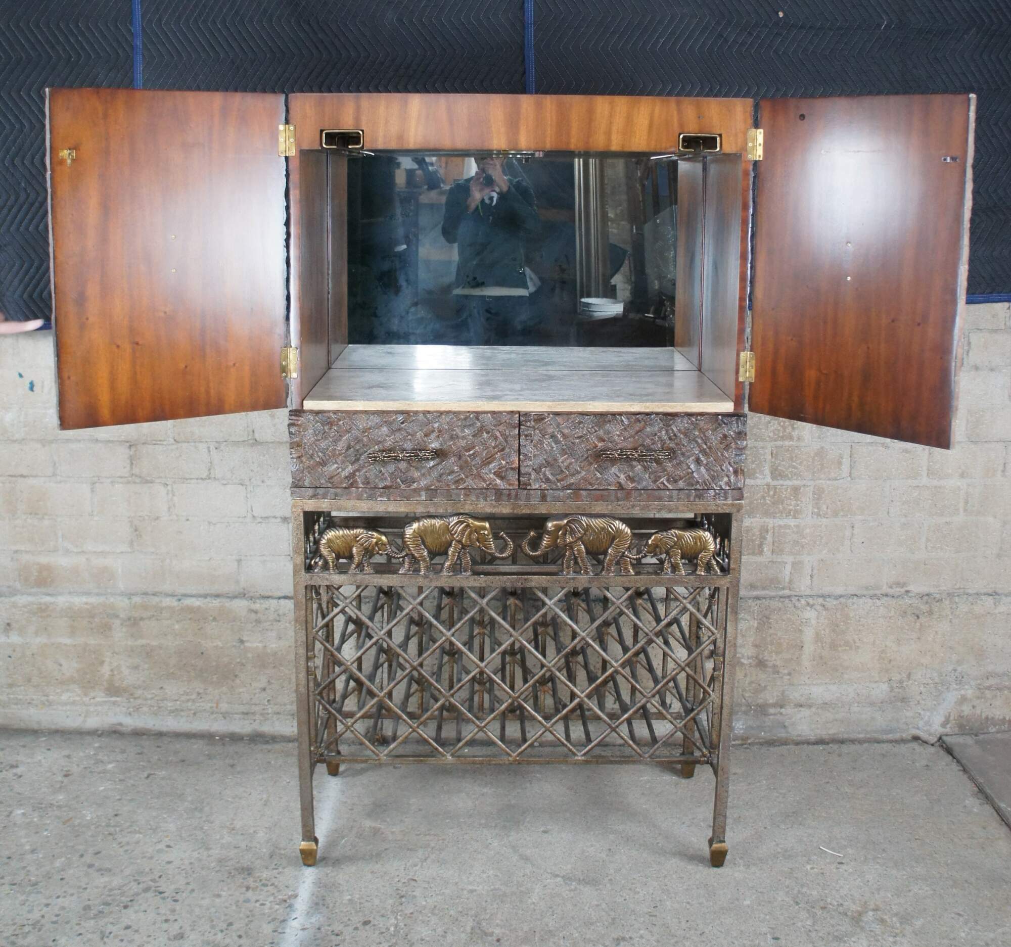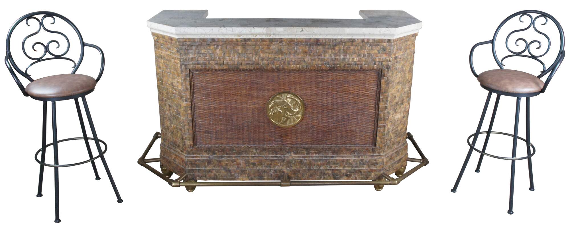 A rare and impressive Safari themed Bar, Stools and Bar Back by Maitland Smith, circa 1970s. Part of their CoCo Bark Collection. Made from split stone veneer, tessellated travertine stone, mahogany, wicker, brass and iron. The exterior bar portion features brass foot rail, wicker insert, lucky elephant medallion and reeded bun feet. The interior is fitted with mahogany, cast brass bamboo hardware, two outer cabinets, several drawers, removable wine holders and a removable brass trashcan. The bar is accented by two iron swivel bar stools with a rounded back featuring double "S" scrolls and a leather seat. Behind the bar rests the matching barback with additional storage for 25 bottles of wine. It features extraordinary figural brass elephant mounts and two mahogany drawers (one lined with a removable brass insert). Upon opening you will find an illuminated interior fit with a mirror, glassware hangers and a travertine work surface. An exceptional cabinet that will bring warmth and conversation to any setting.