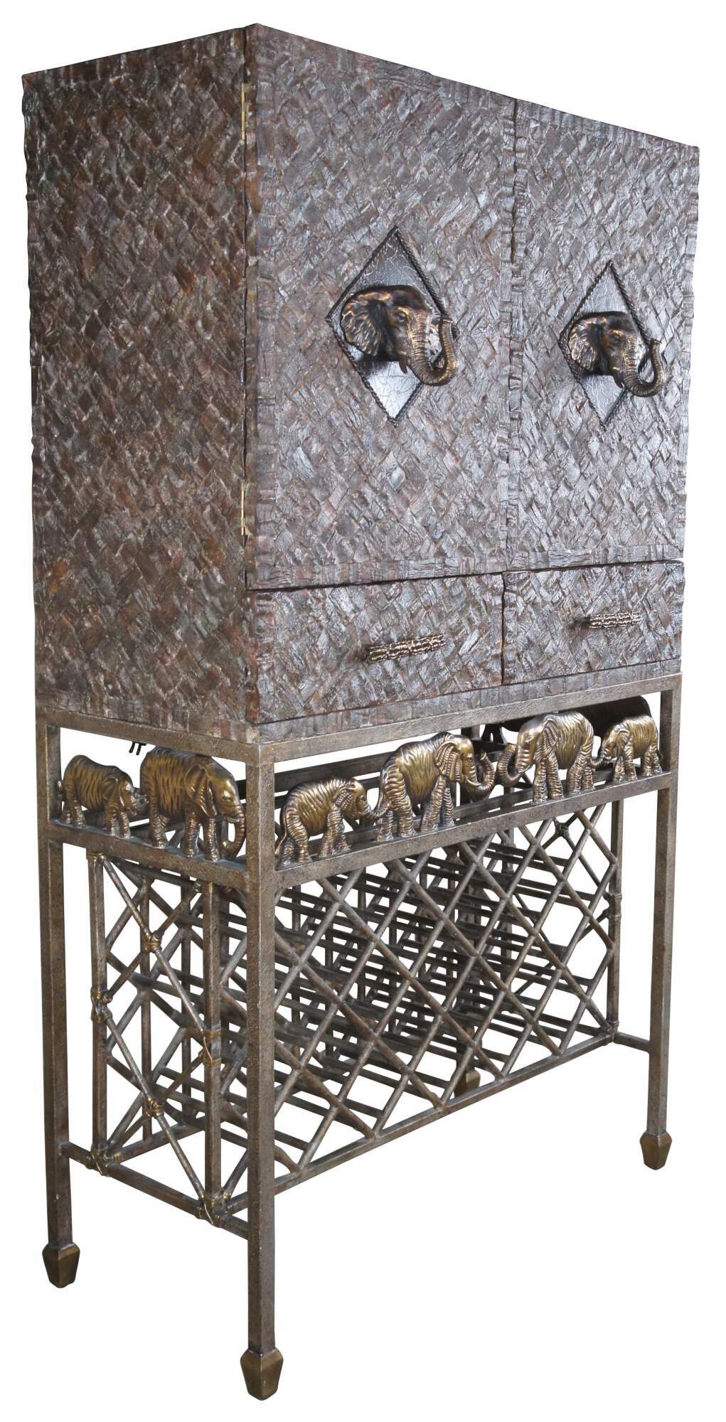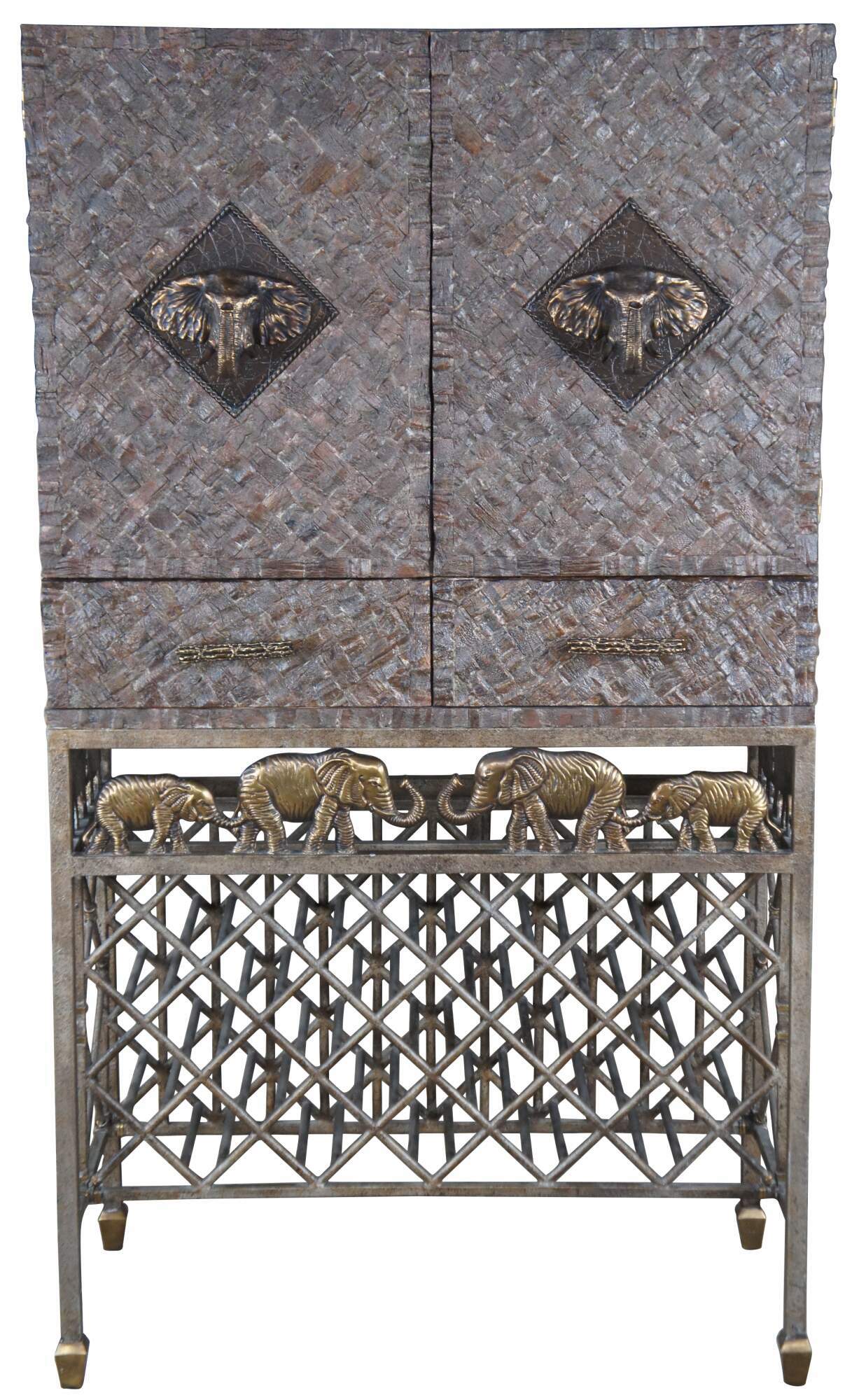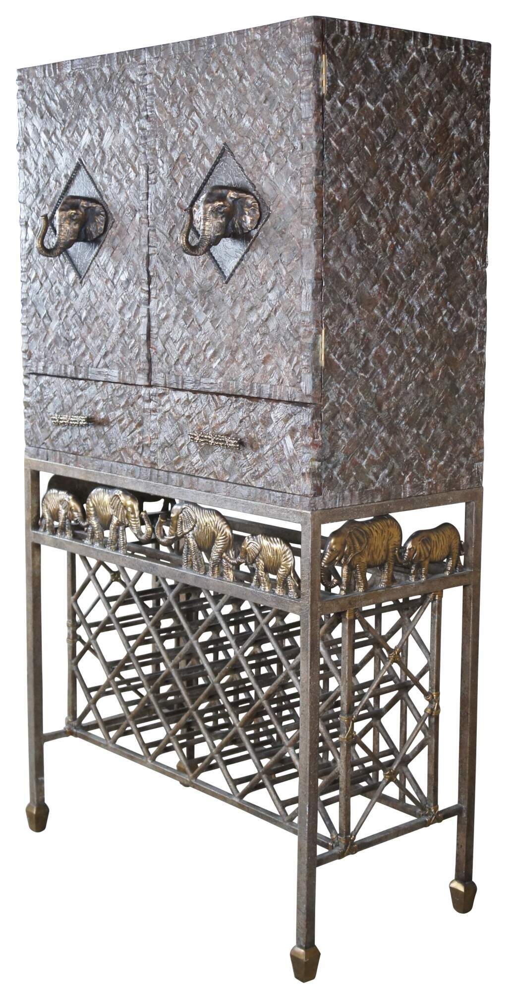 A rare and impressive Safari themed Bar, Stools and Bar Back by Maitland Smith, circa 1970s. Part of their CoCo Bark Collection. Made from split stone veneer, tessellated travertine stone, mahogany, wicker, brass and iron. The exterior bar portion features brass foot rail, wicker insert, lucky elephant medallion and reeded bun feet. The interior is fitted with mahogany, cast brass bamboo hardware, two outer cabinets, several drawers, removable wine holders and a removable brass trashcan. The bar is accented by two iron swivel bar stools with a rounded back featuring double "S" scrolls and a leather seat. Behind the bar rests the matching barback with additional storage for 25 bottles of wine. It features extraordinary figural brass elephant mounts and two mahogany drawers (one lined with a removable brass insert). Upon opening you will find an illuminated interior fit with a mirror, glassware hangers and a travertine work surface. An exceptional cabinet that will bring warmth and conversation to any setting.
