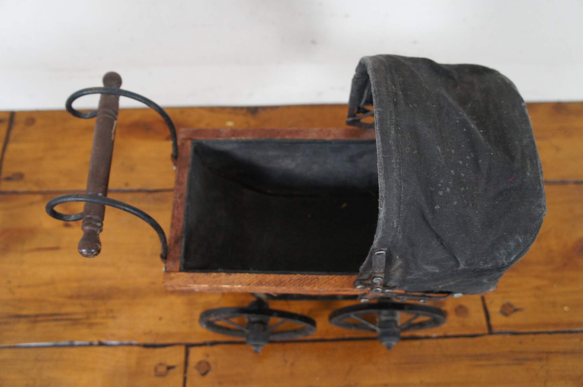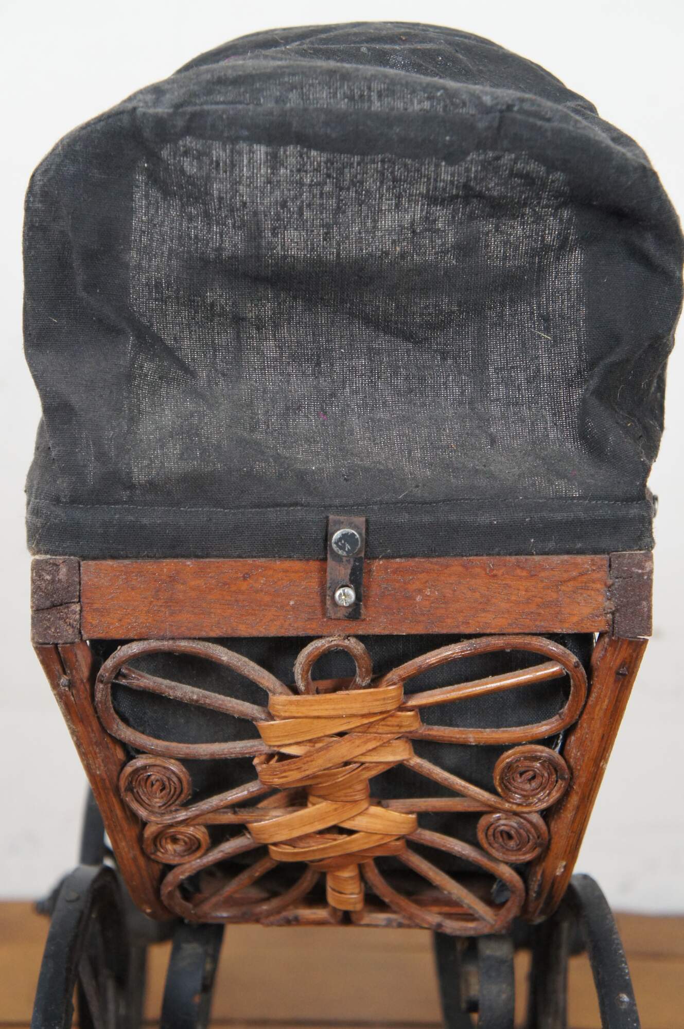 Antique Victorian doll sized baby buggy or carriage, crafted of wood and wicker accents, with iron banded wheels and wrought handle, lined and hooded with black cloth.