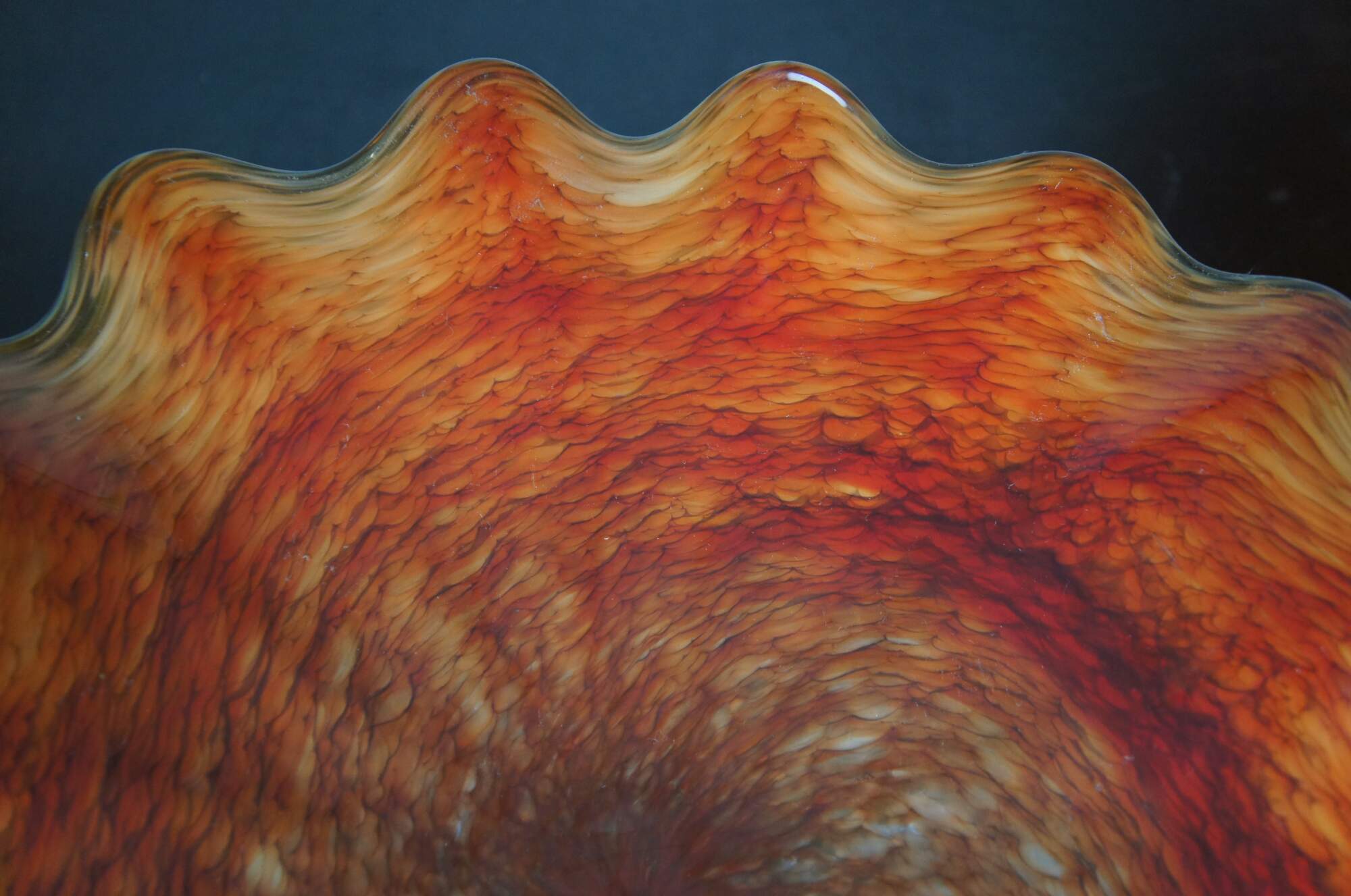 Trio of beautiful hand blown Studio art glass wall hanging plates by Dayton, OH artist Jim DeLange. This trio of ruffle edged sunburst / starburst shaped medallions featuring Chihuly style harmonizing shades of yellow, orange and red in stripes, spots, and swirling ombre. Signed along back edges. Supported for wall hanging by black metal mounting brackets (included).