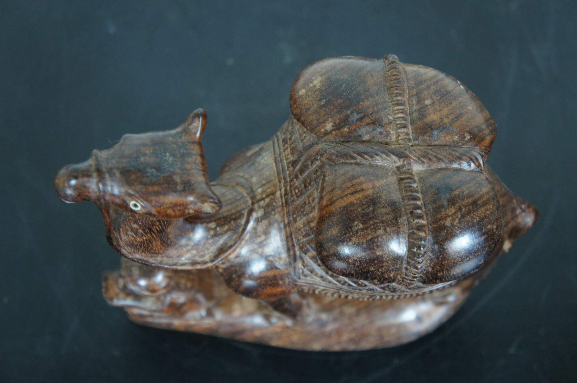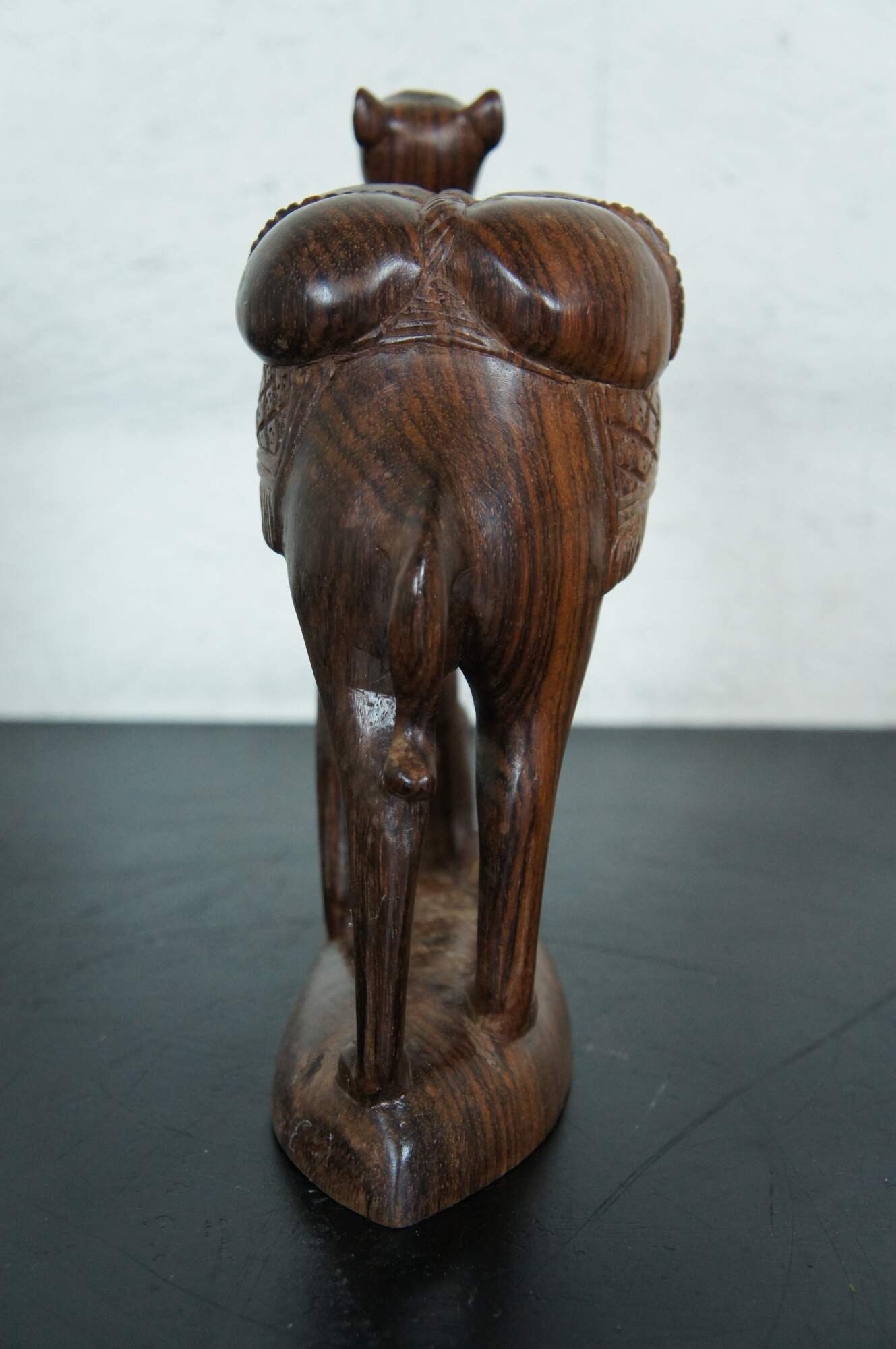 Vintage carved wood sculpture featuring a camel laden for a journey, standing over a kneeling figure at prayer.