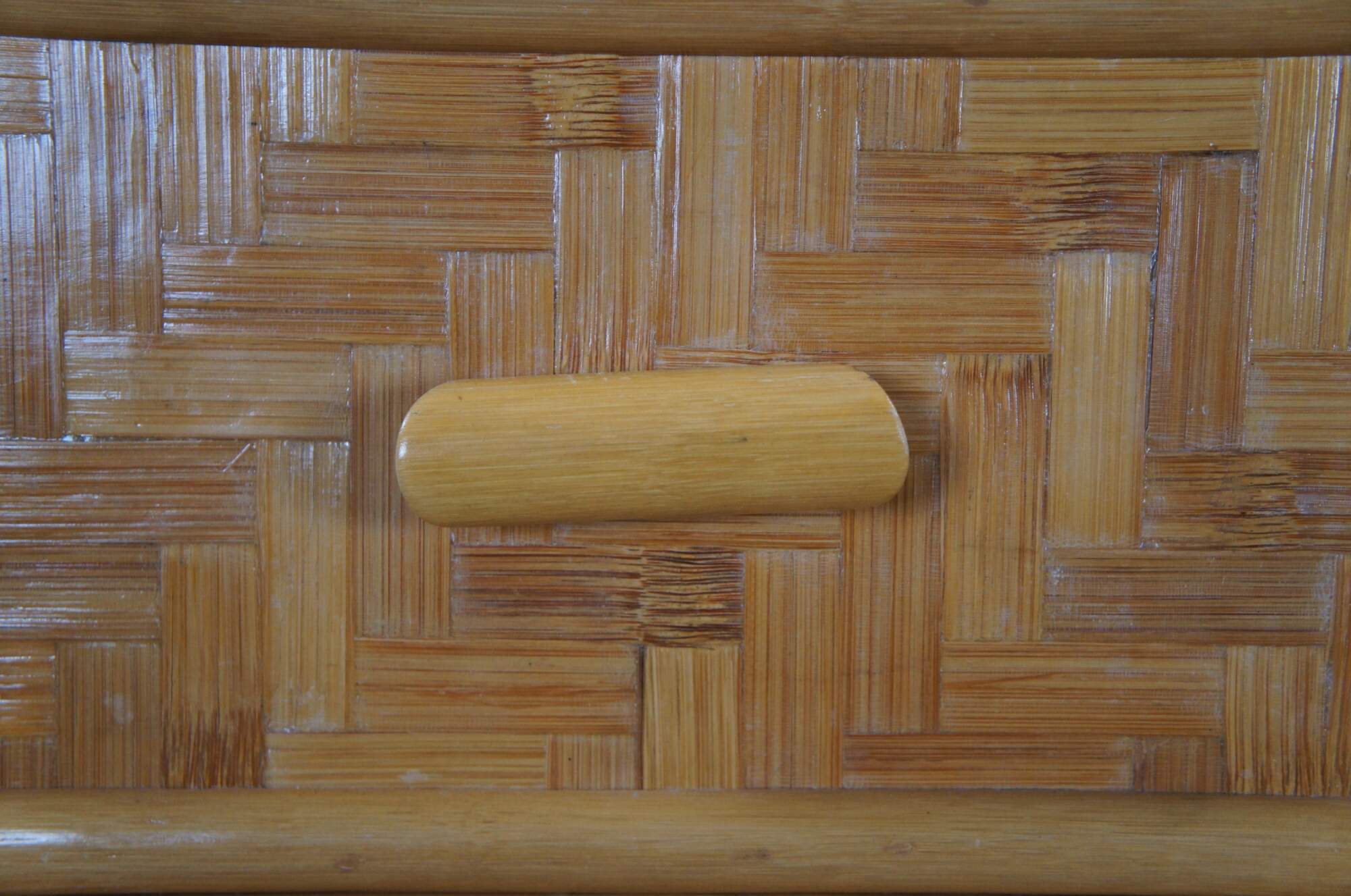 Vintage Hollywood Regency / Bohemian dresser, circa last quarter 20th century. Features a bamboo frame with geometric rattan panels. Includes 4 drawers