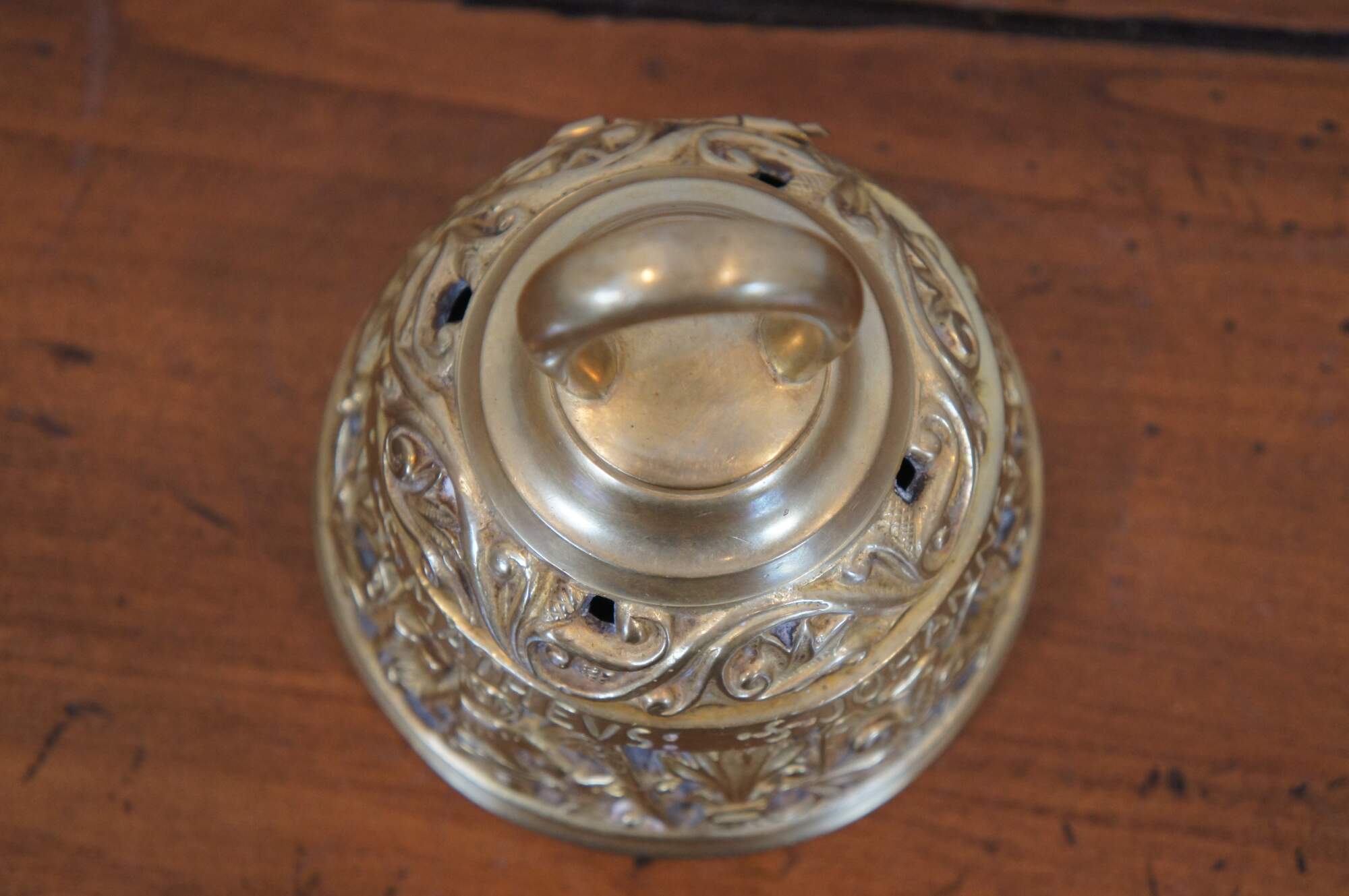Vintage brass Christian sanctuary bell shaped inkwell with hinged lid and a pierced design showing the Latin names of the four Gospel writers and their animal symbols.