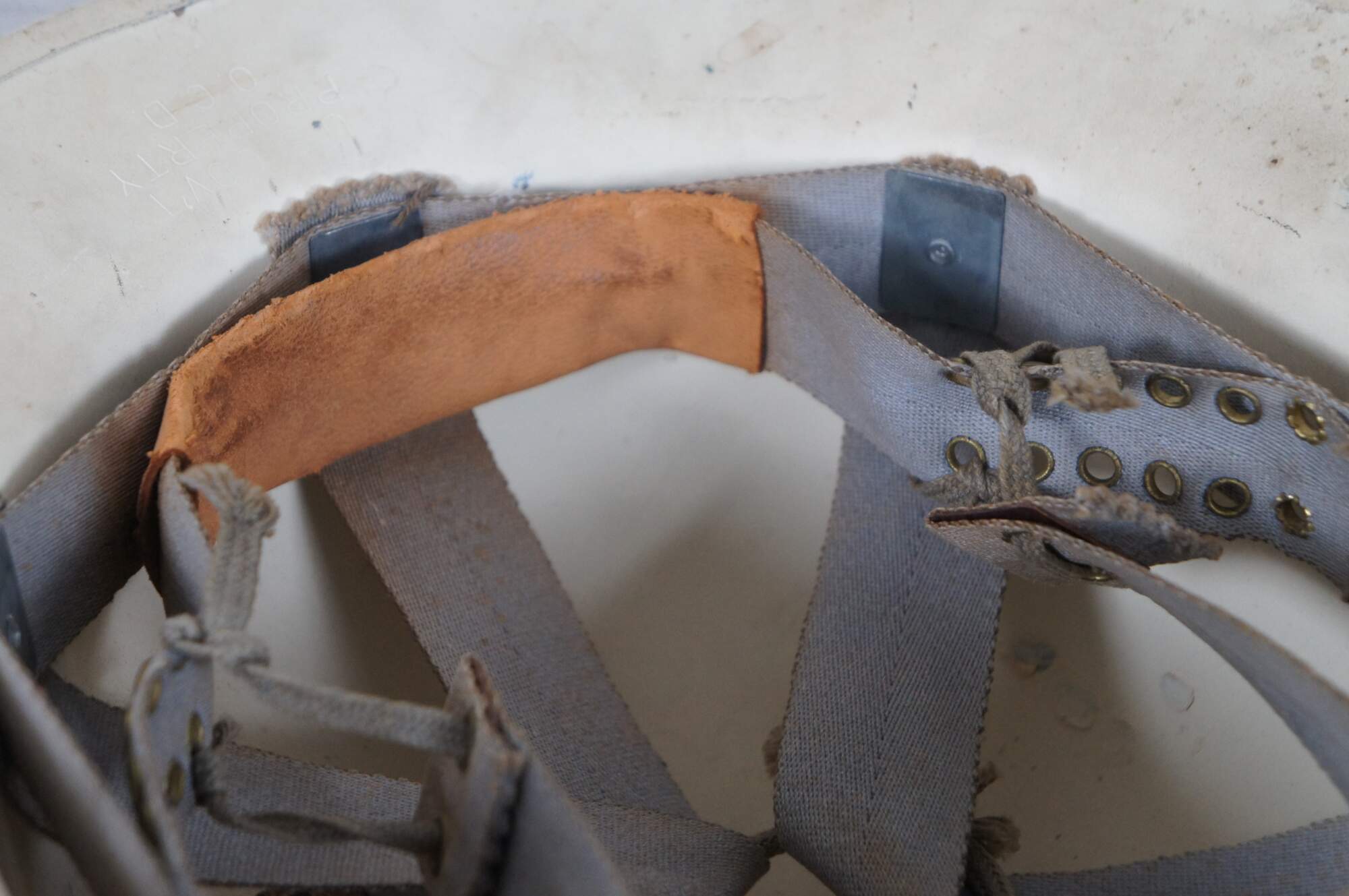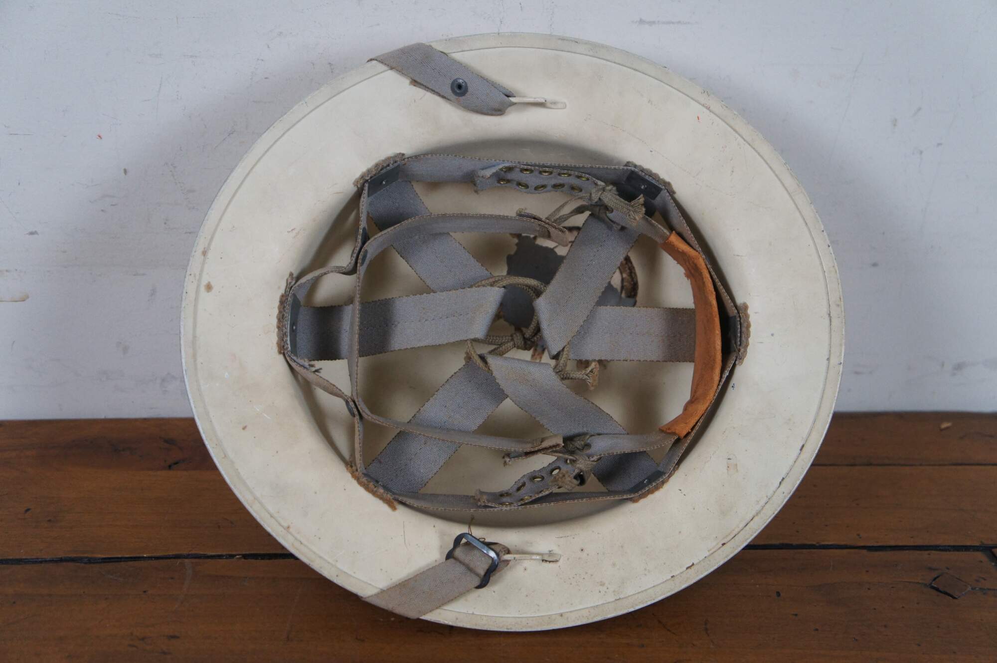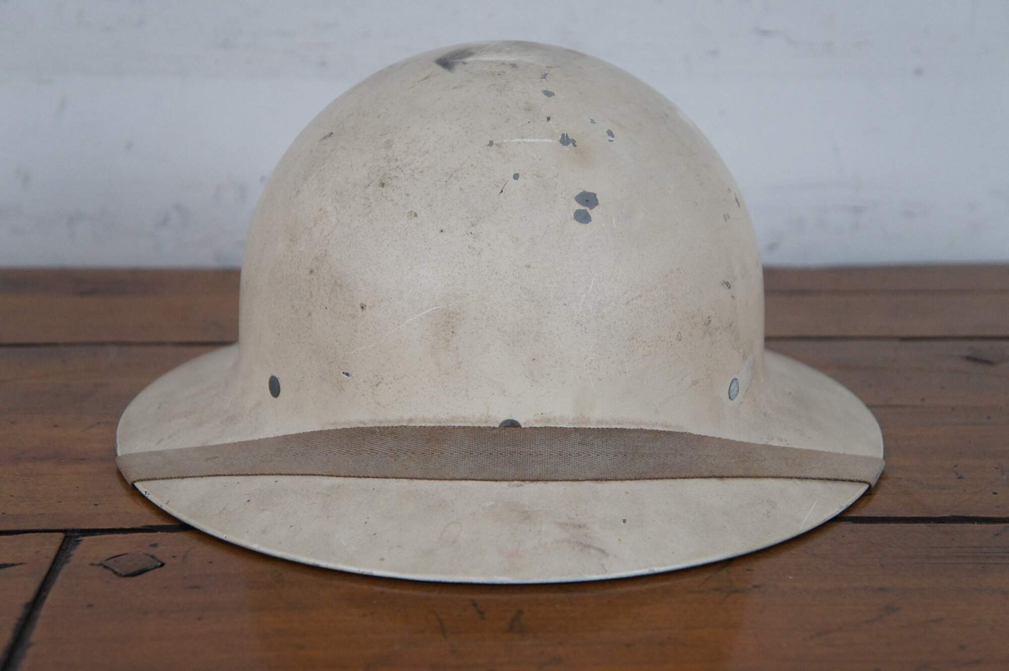 World War II era white painted metal helmet from the Office of Civil Defense. Marked US Government Property OCD.