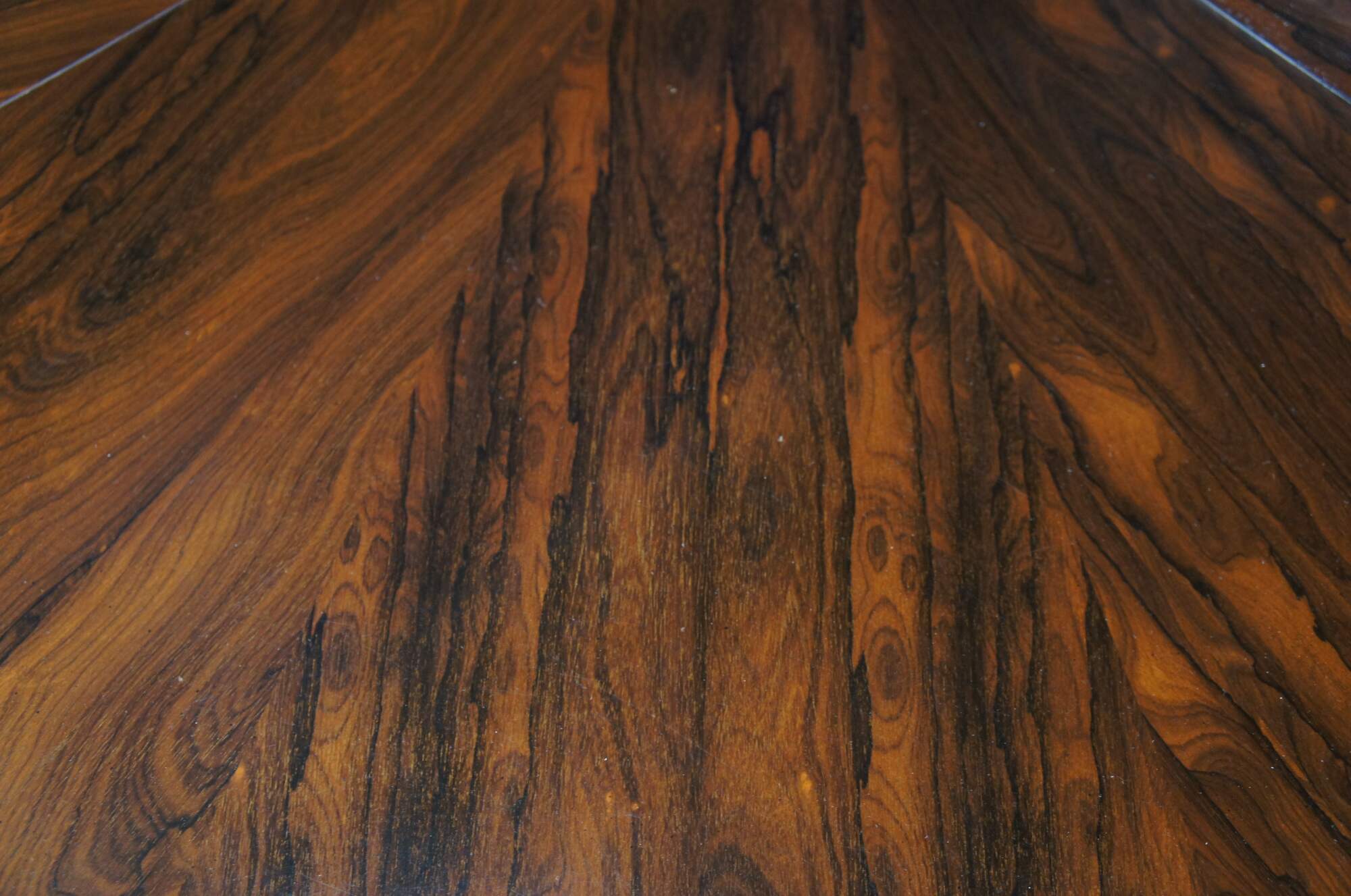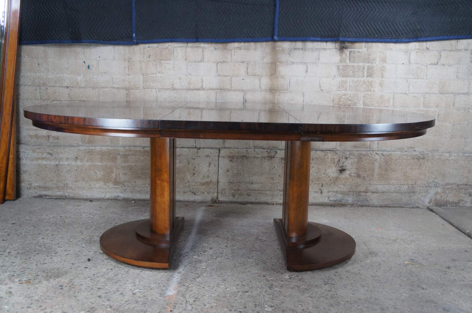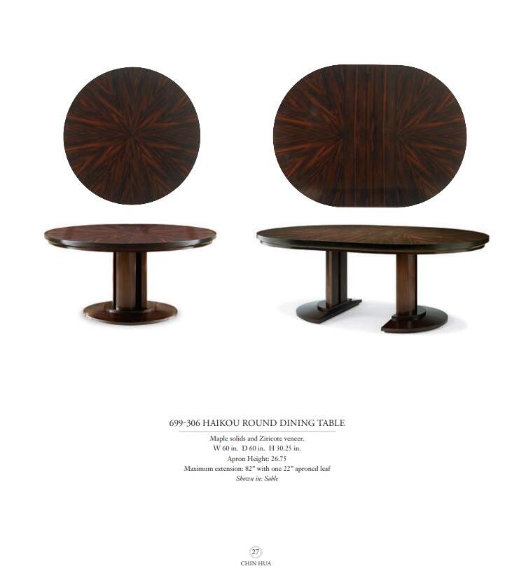 Century Furniture Haikou Round Dining Table. Made from maple solids and Ziricote Veneer. Ziricote veneer is similar to the iconic Macassar Ebony that is often seen in specialty Mid-Century and Post-Modern furnishing. The table features a minimalist design with an extendable pedestal base. Includes one leaf #699-306