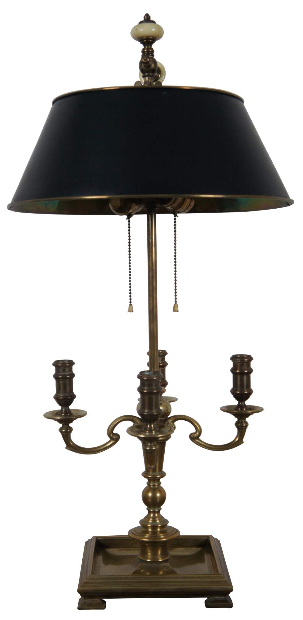 Vintage 1972 Chapman French bouillotte style table lamp with square base, four candlesticks, two lights and black tole metal shade.