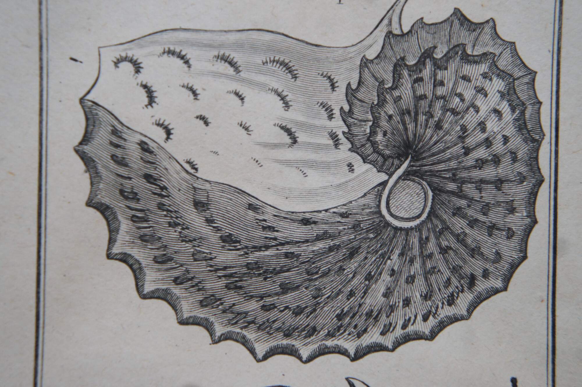 Antique engraving from a book showing two variations of the Argonaut Mollusk shell. Drawn by D. Montfert. Engraved by Augustin de Saint-Aubin.