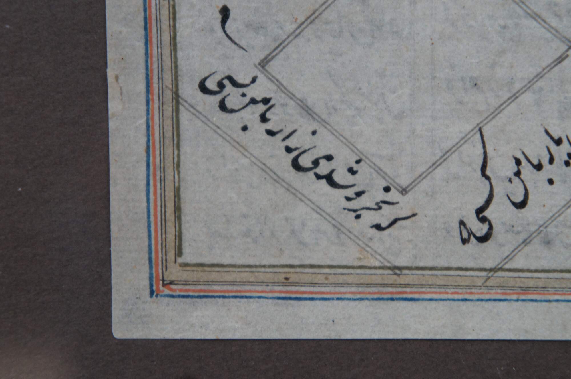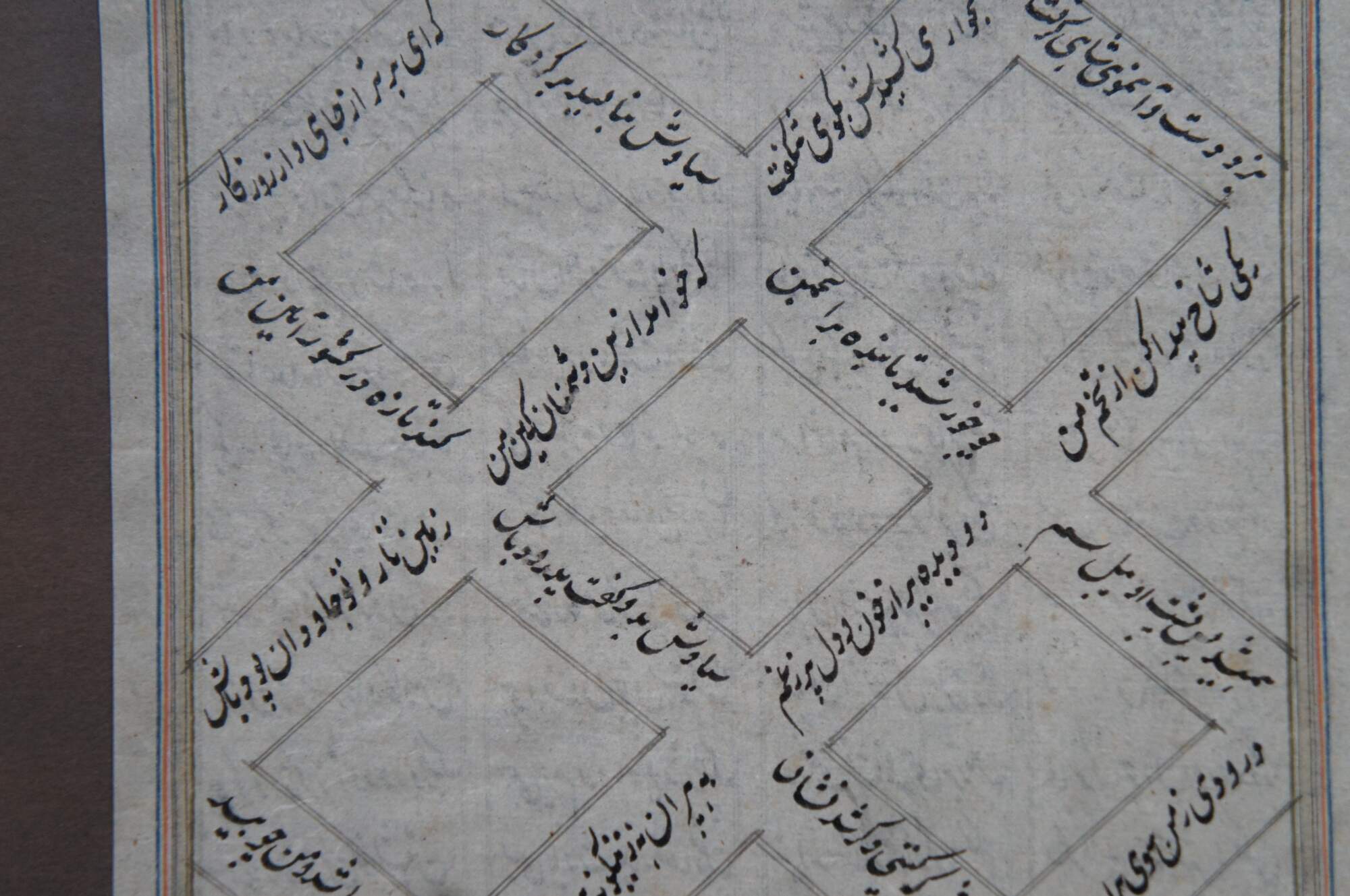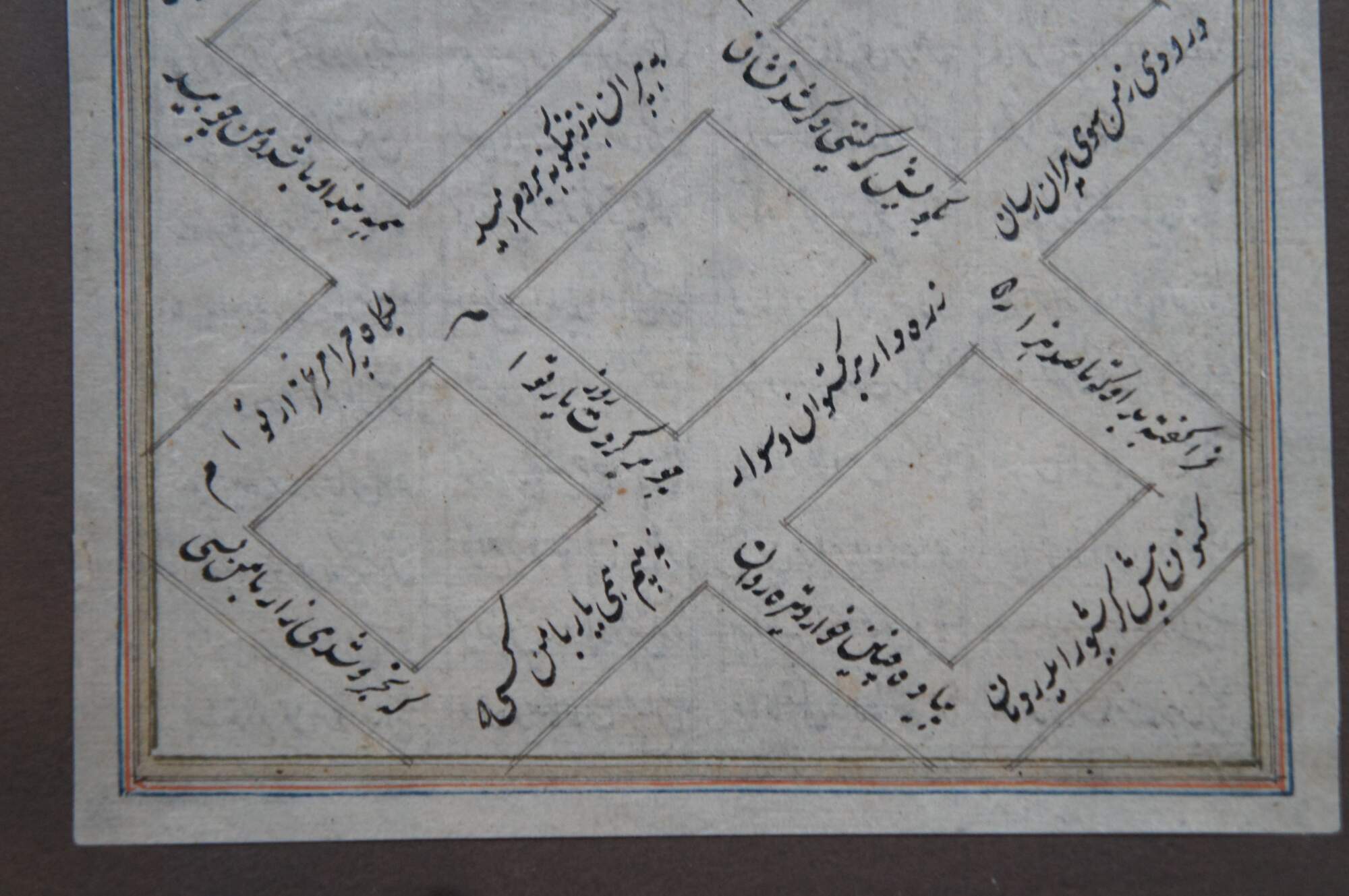 Antique framed prayer / poem / manuscript book page from the Shahnameh epic featuring Persian / Arabic / Iranian / Islamic calligraphy arranged in geometric lattice design.