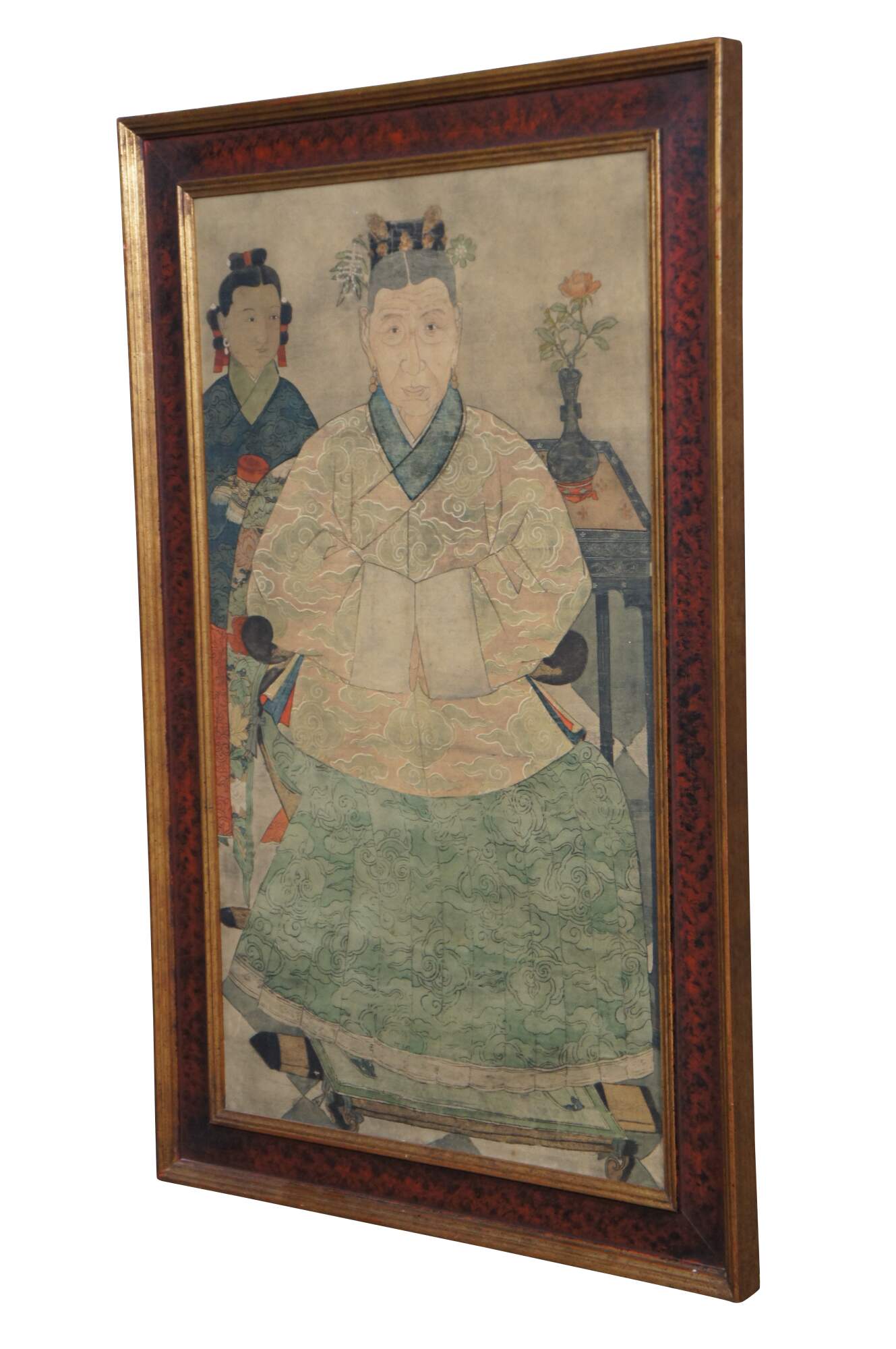 Vintage mid to late 20th century hand colored scroll style print of a Ming dynasty style family / ancestor portrait depicting an old Korean woman / Empress / Emperor seated on a raised chair with a rose on a table to one side and a young woman on the other. Distributed by Catalda Fine Arts, Inc.