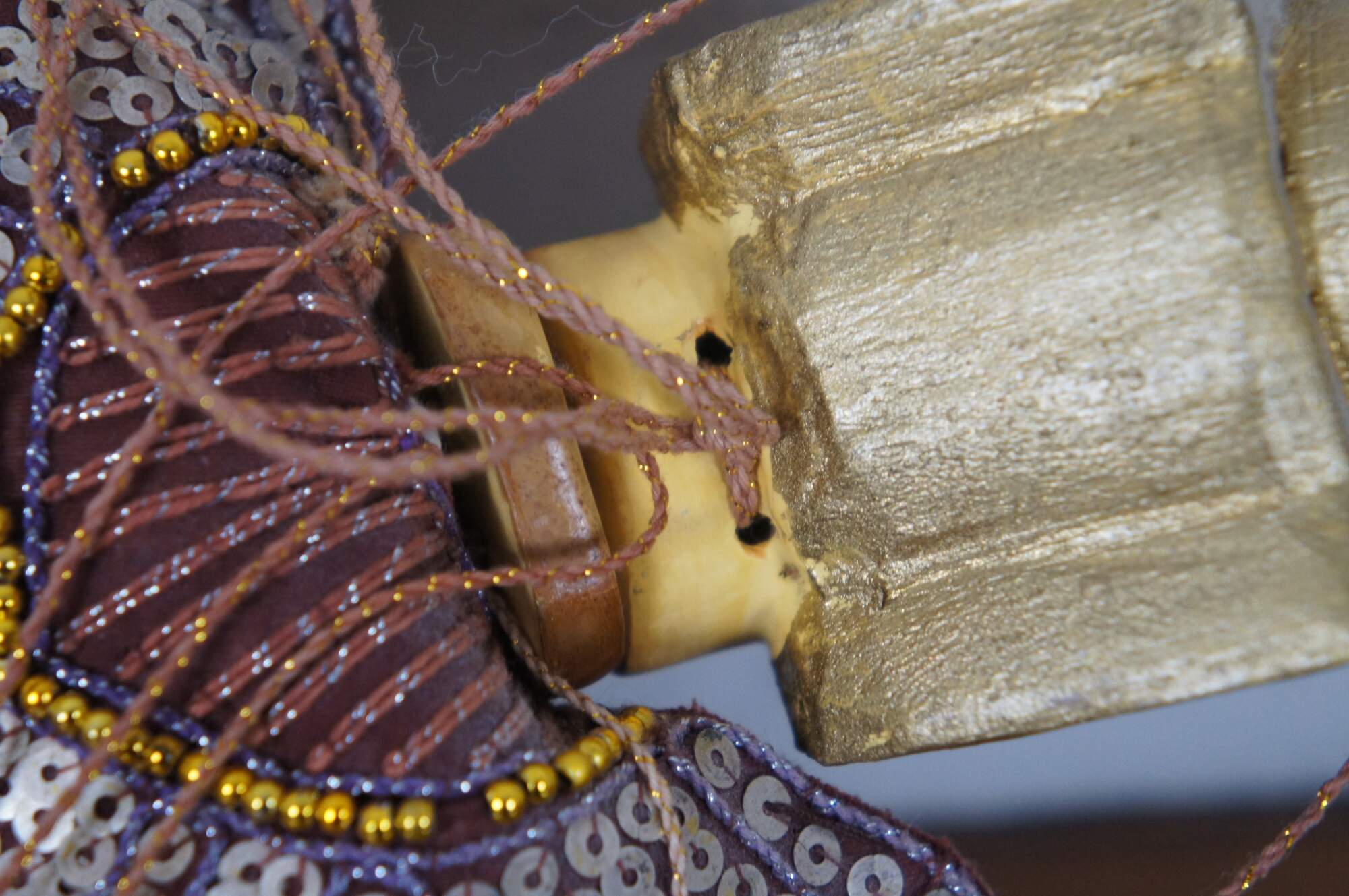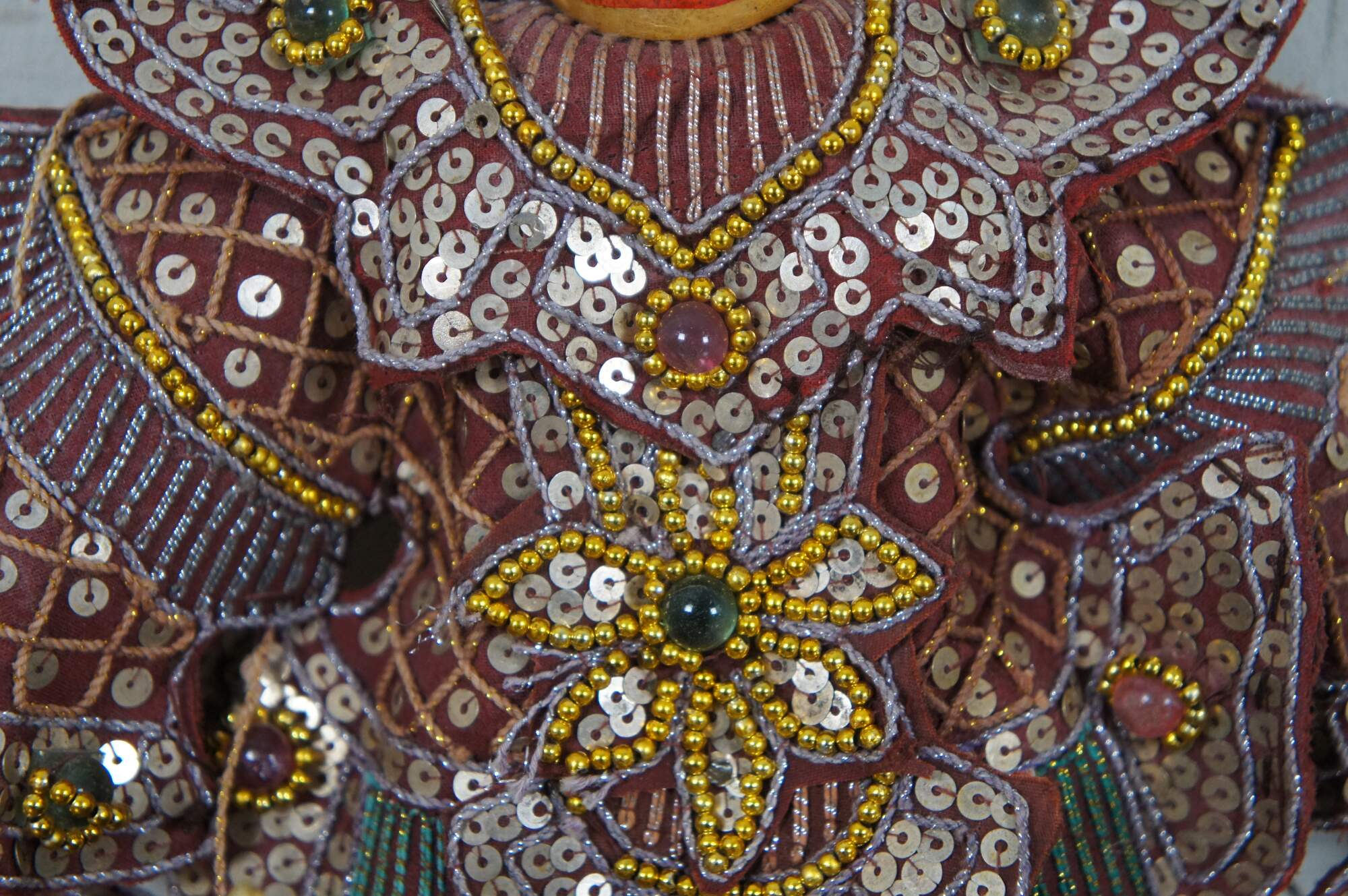 Vintage hand crafted, painted wooden marionette style puppet depicting Tha Gyar Min, King of the Celestial Beings of Myanmar / Burmese theater, fashioned with golden features and an intricately sequined outfit.