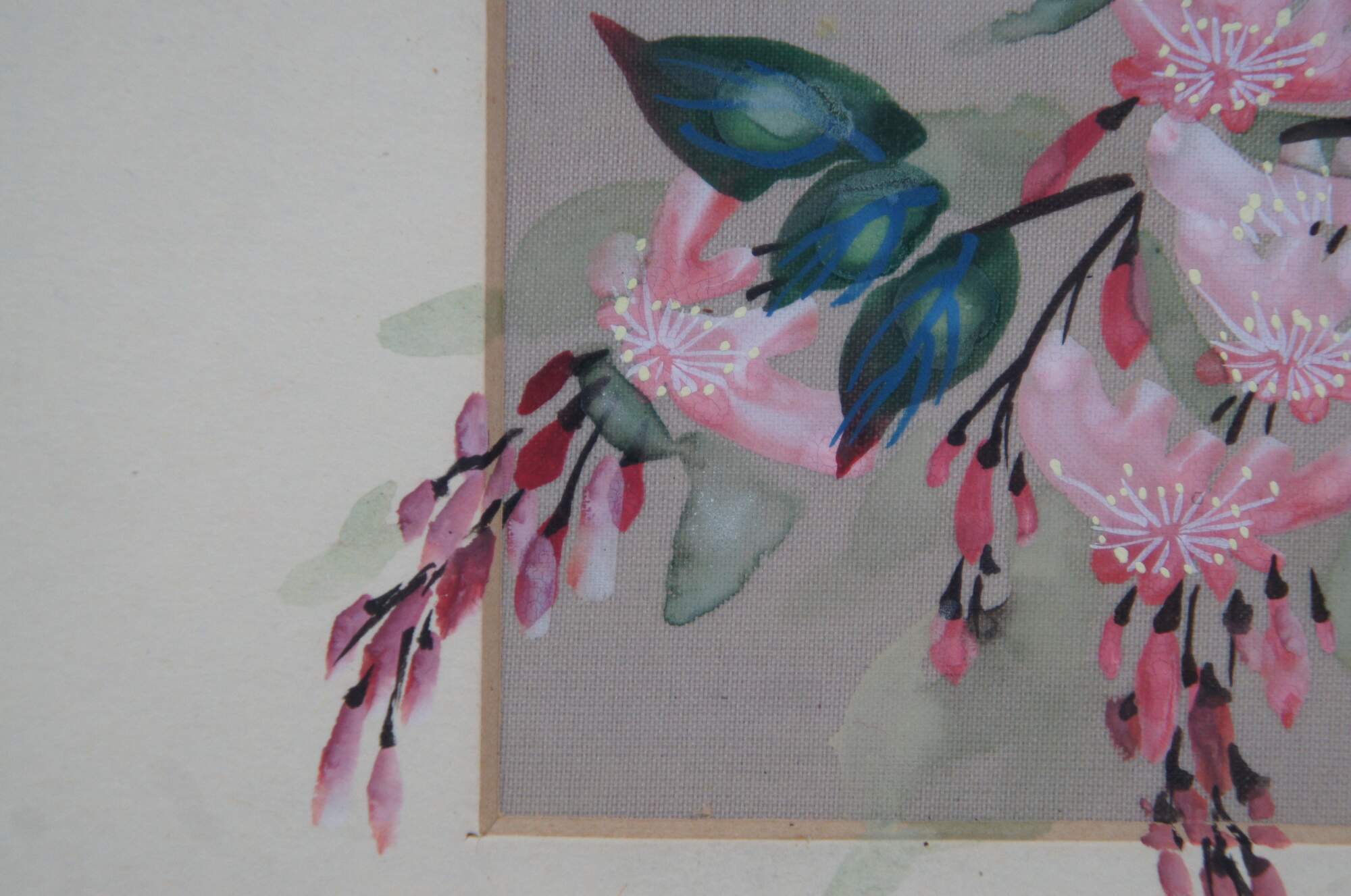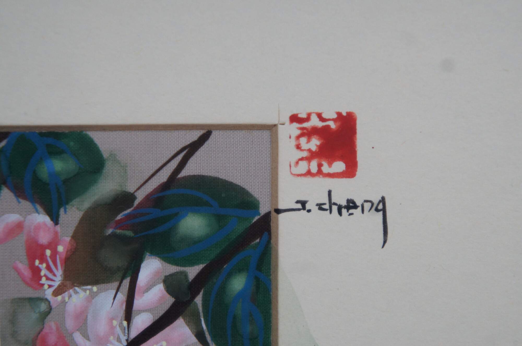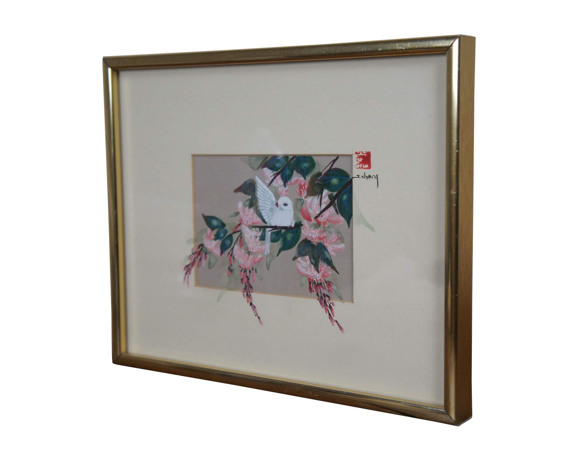 Vintage Chinese / Taiwanese John Cheng gouache / watercolor painting on silk, showing a small white bird / dove on a branch of cherry blossoms that spills off the canvas and onto the mat. Signed J. Cheng / sealed in upper right. Gold metal frame; off white mat.