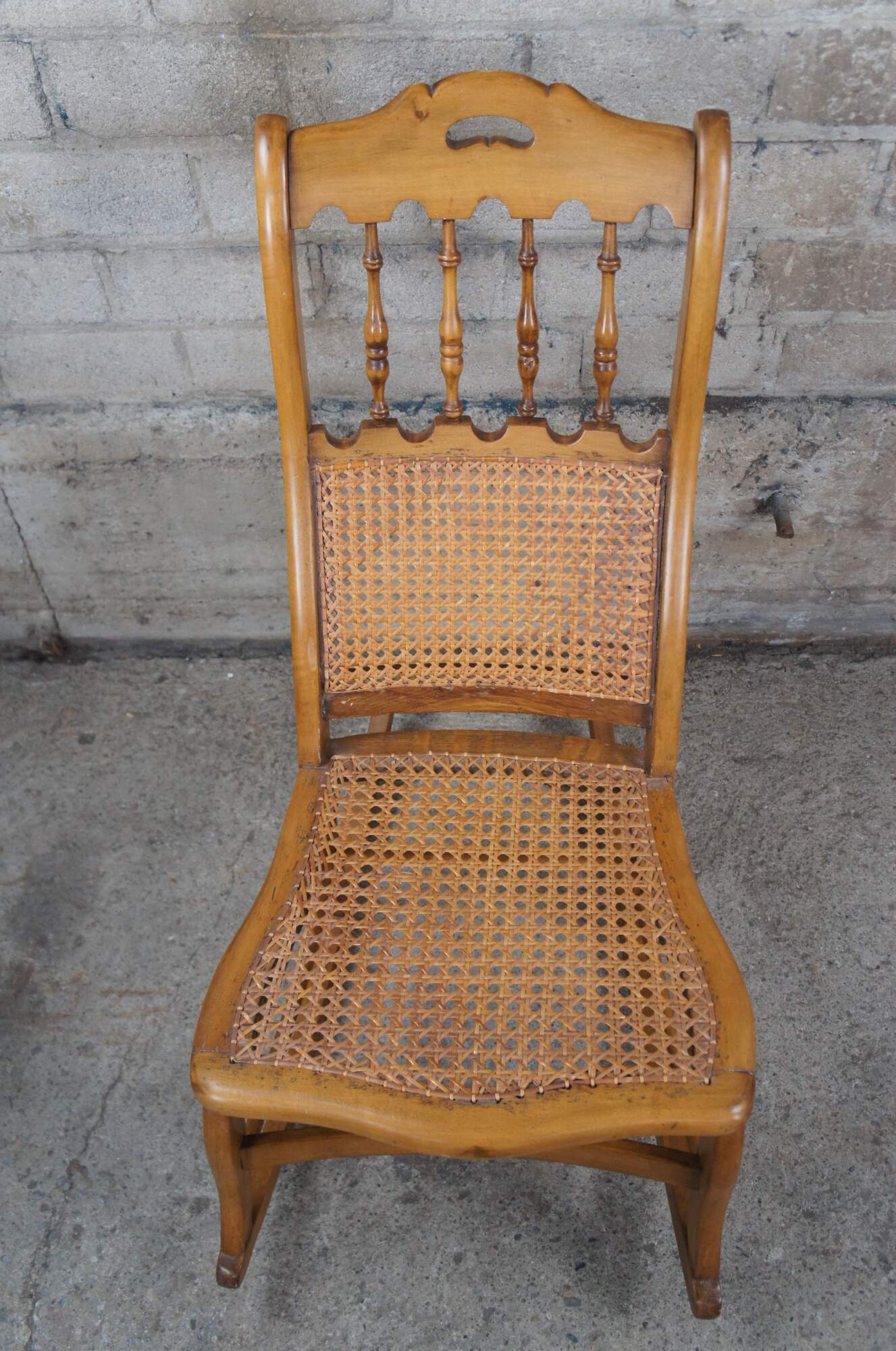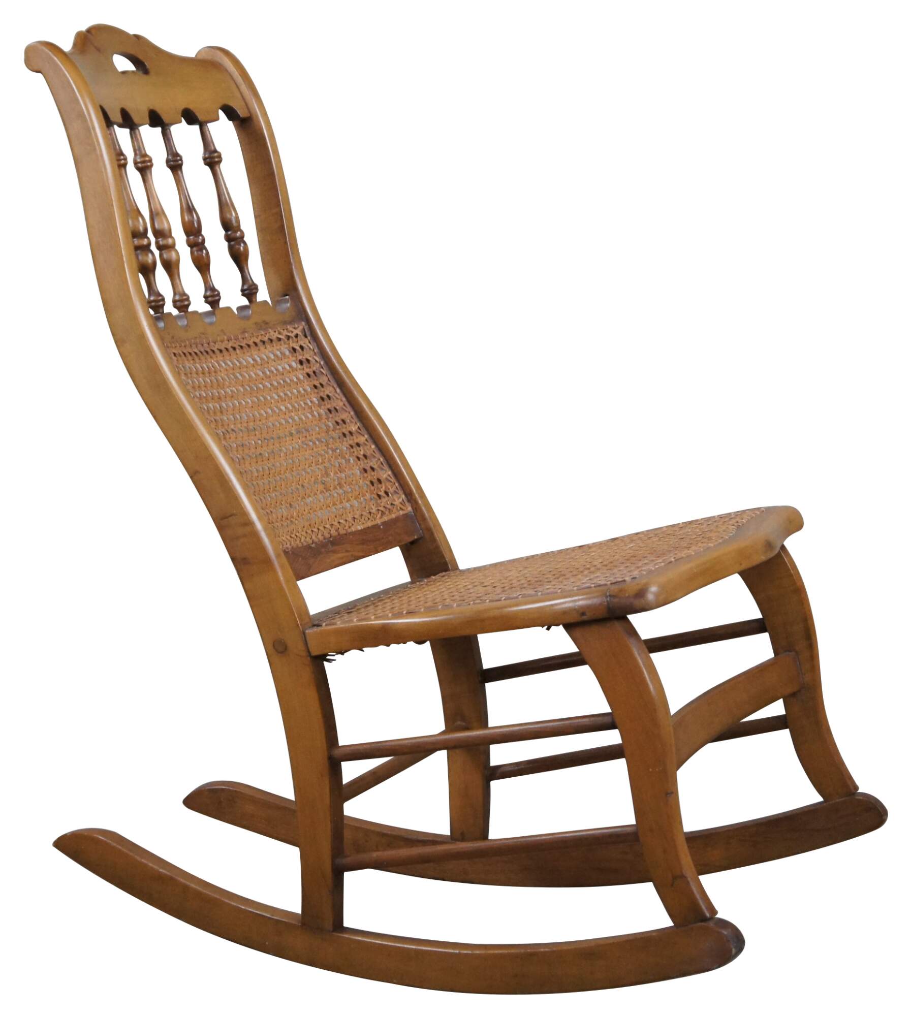 A quaint early American rocking chair, circa 1900s. Made from maple with a spindle back centered between arcade like trim. The chair features a cane seat and back.