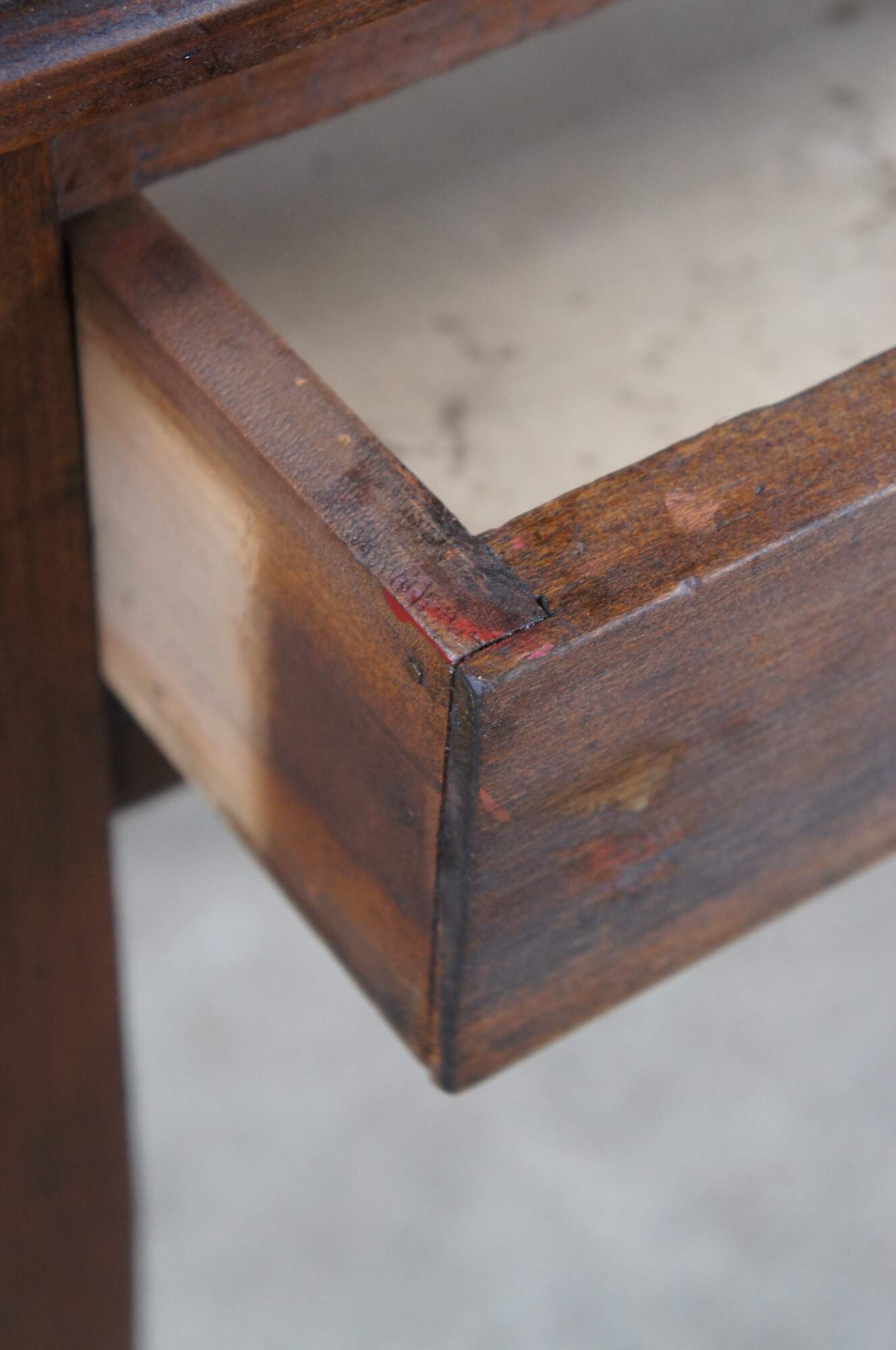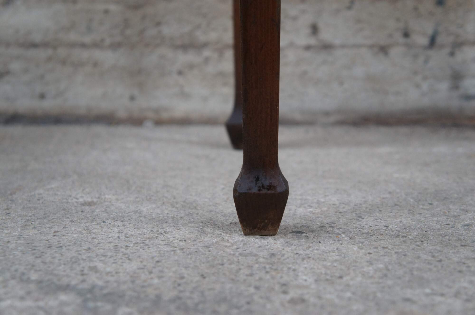 20th Century early American style end table with drawer. Features a square form made from pine with central drawer, acorn pull, serpentine cut aprons and federal inspired legs with spade foot.