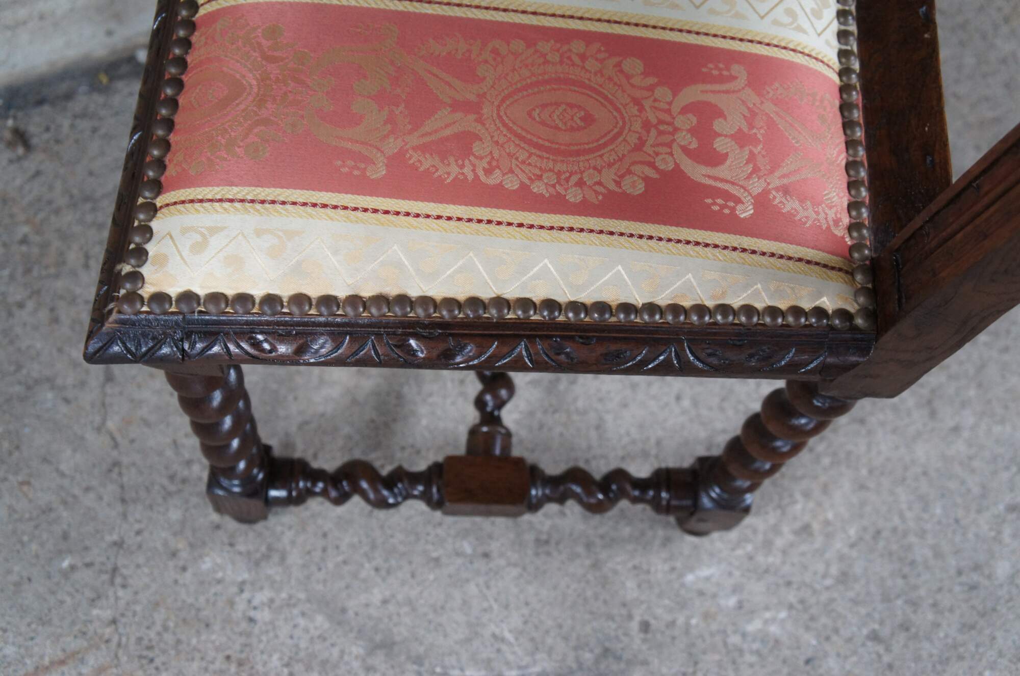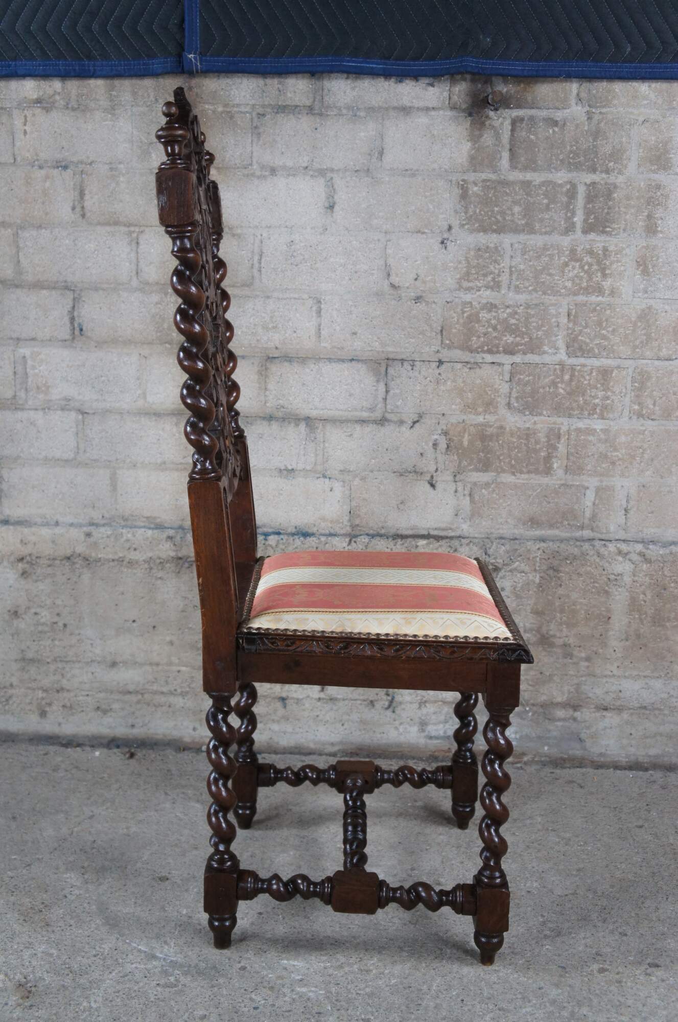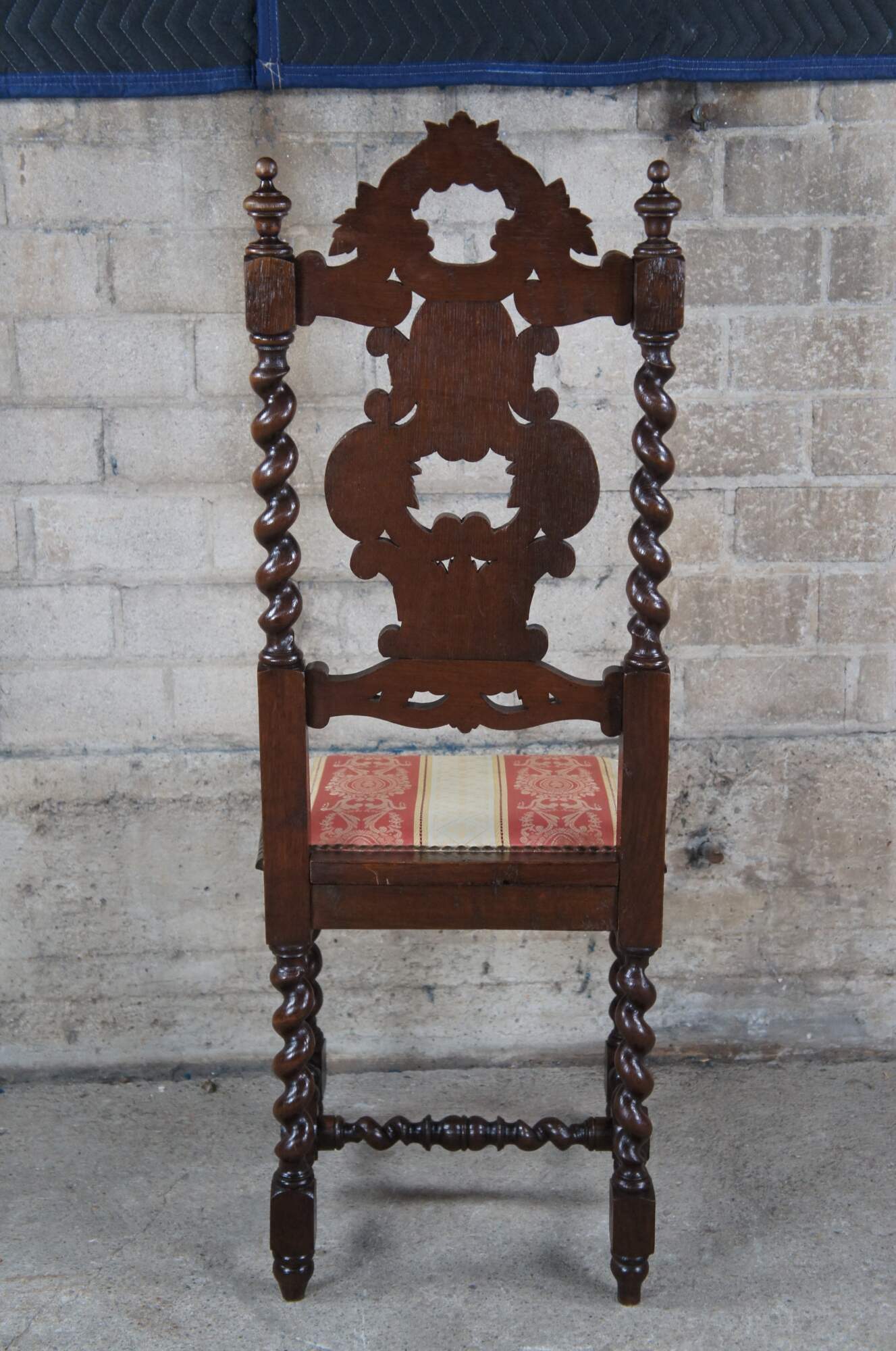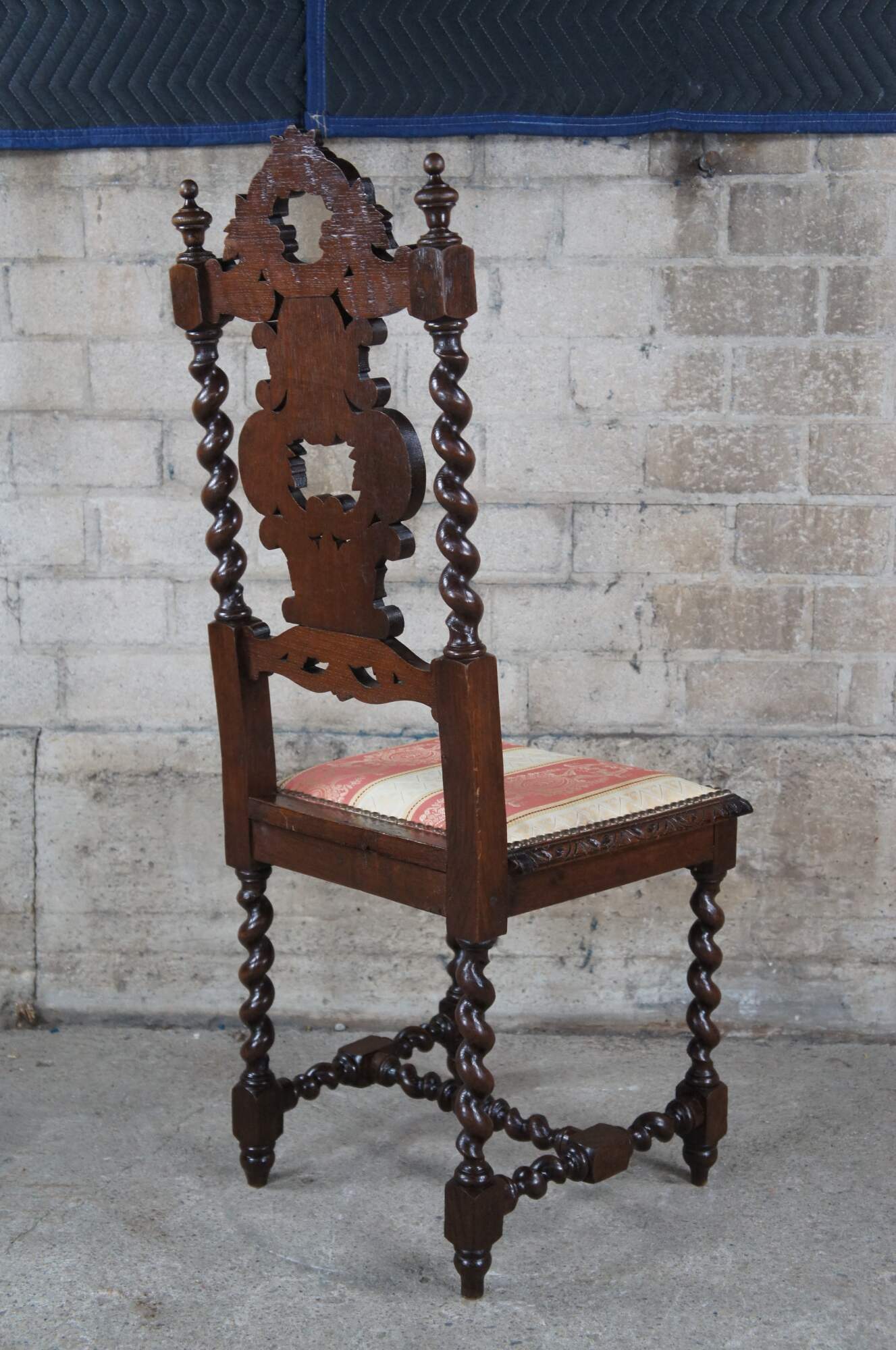 Six antique French Renaissance Revival dining chairs., circa 1920s. Made of oak featuring ornate gothic styling with a pierced / reticulated back, carved leaves over scrolled accents and barley twisted fluted stiles. Upholstered silk seats feature baroque brocade with fleur de lis and nailhead trim. The chairs are supported by ornate barley twist turned legs leading to turnip feet. The legs are connected by an "H" stretcher.