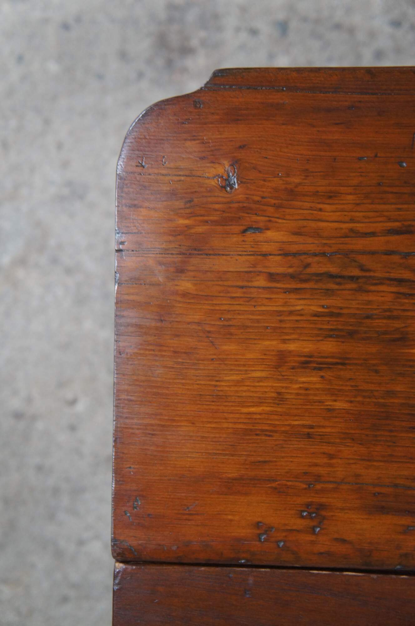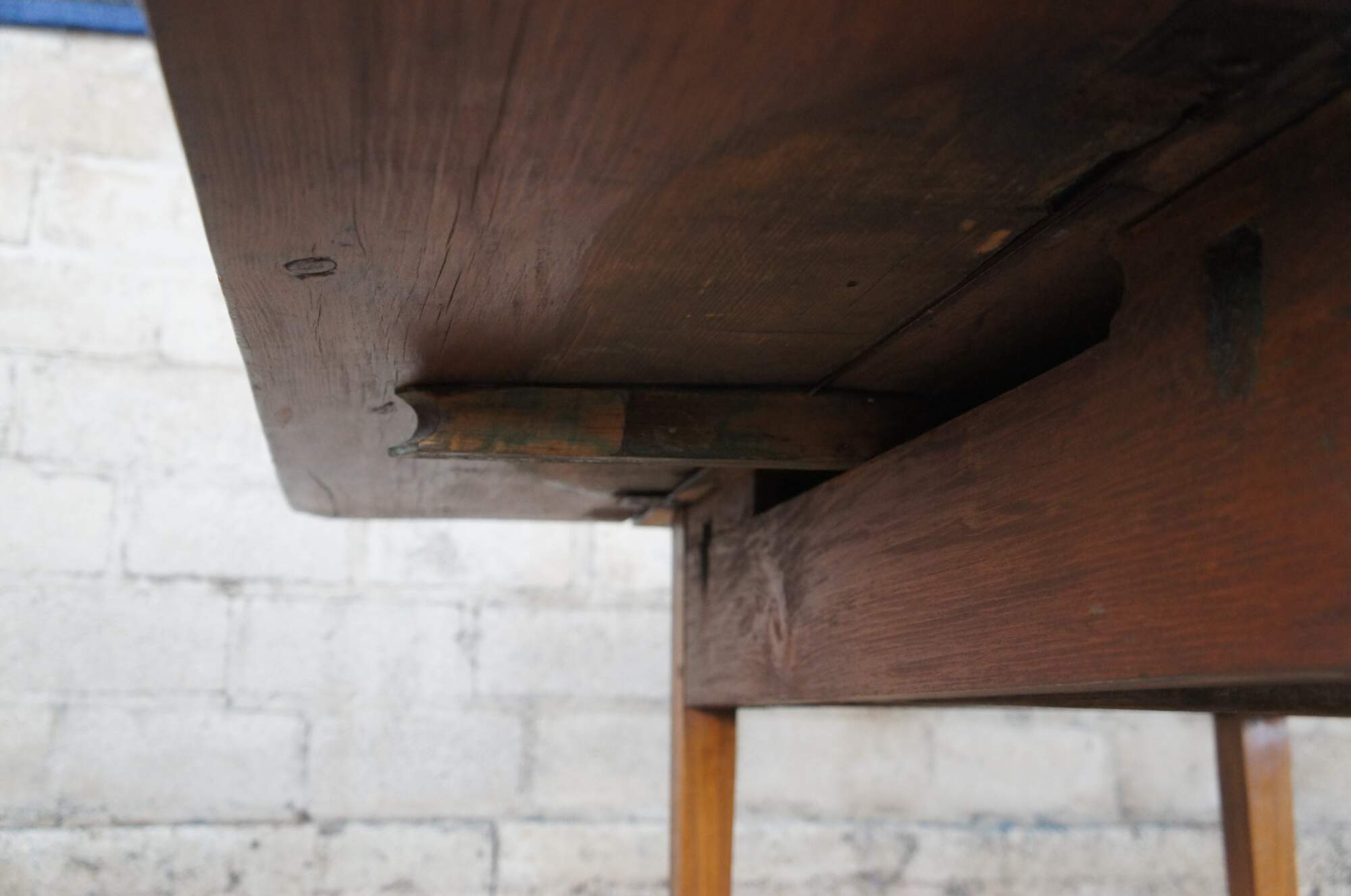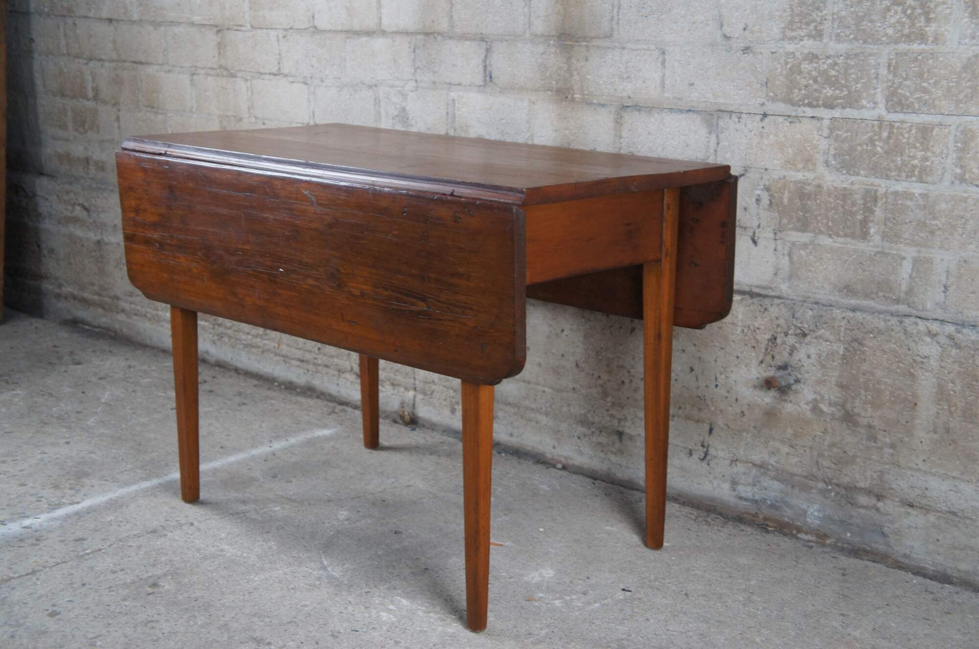 A quaint early 20th century farmhouse drop leaf breakfast table or console. A rectangular form made from pine with cut corners along the leaves. Features a long central drawer with decorative brass pull and square tapered legs.