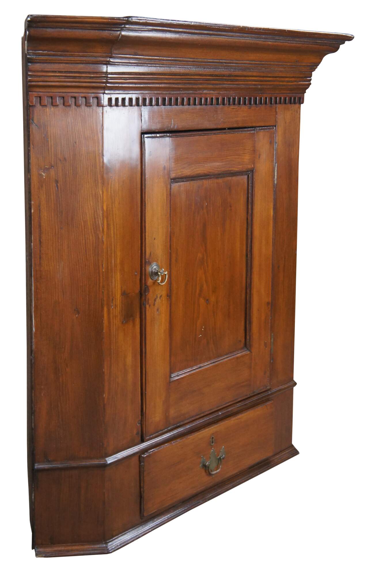 Antique Georgian corner cabinet. Made of pine featuring ornate dentil crown molding with upper cabinet and lower hand dovetailed drawer. Fitted with modern brass hardware from Ball & Ball of Whitford.