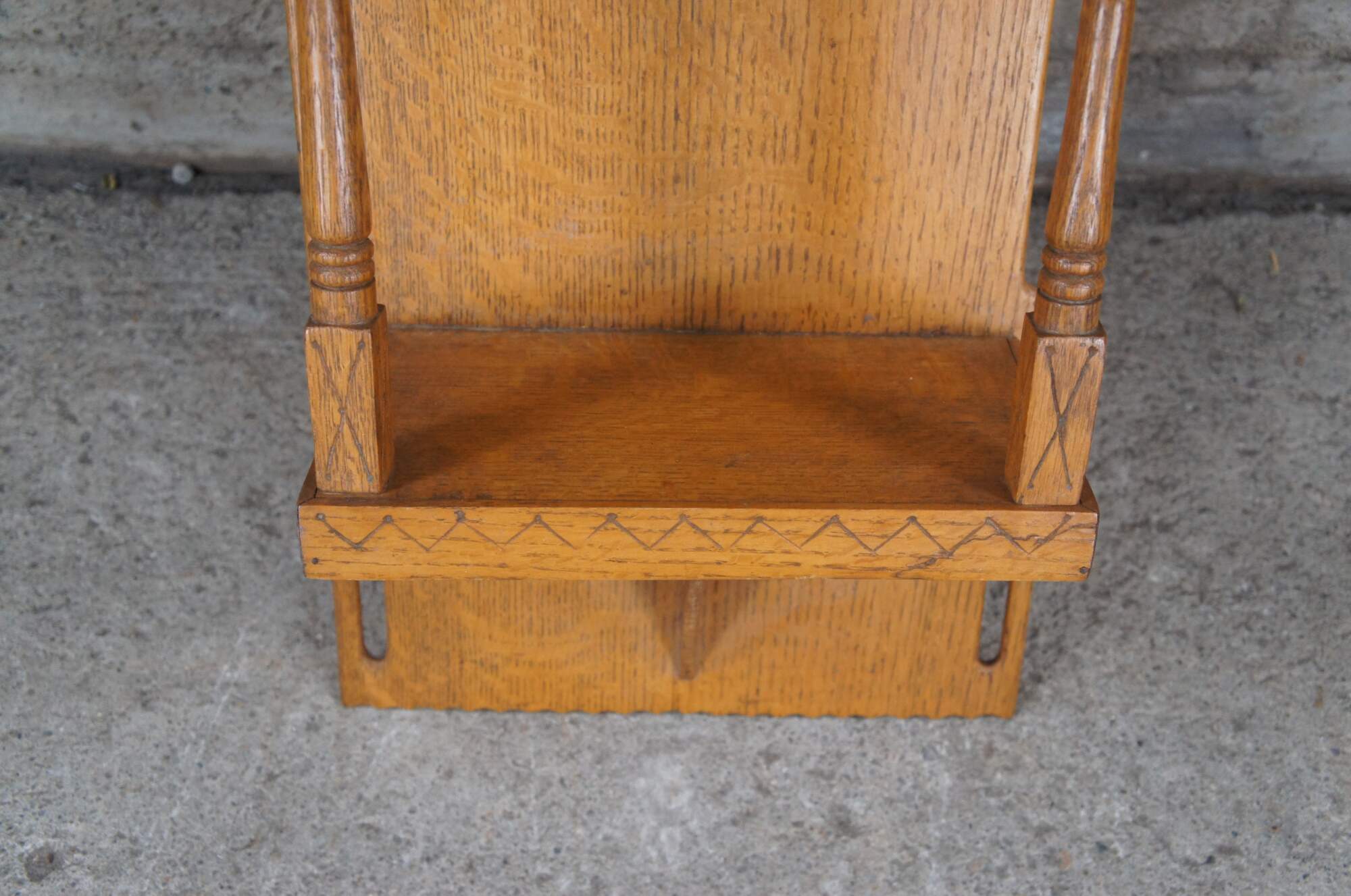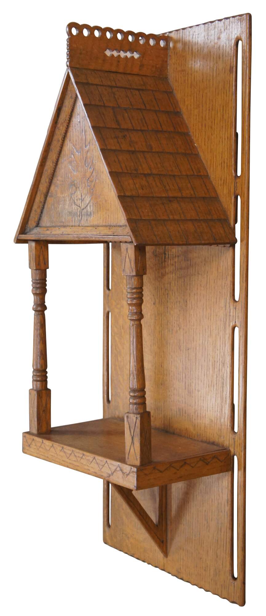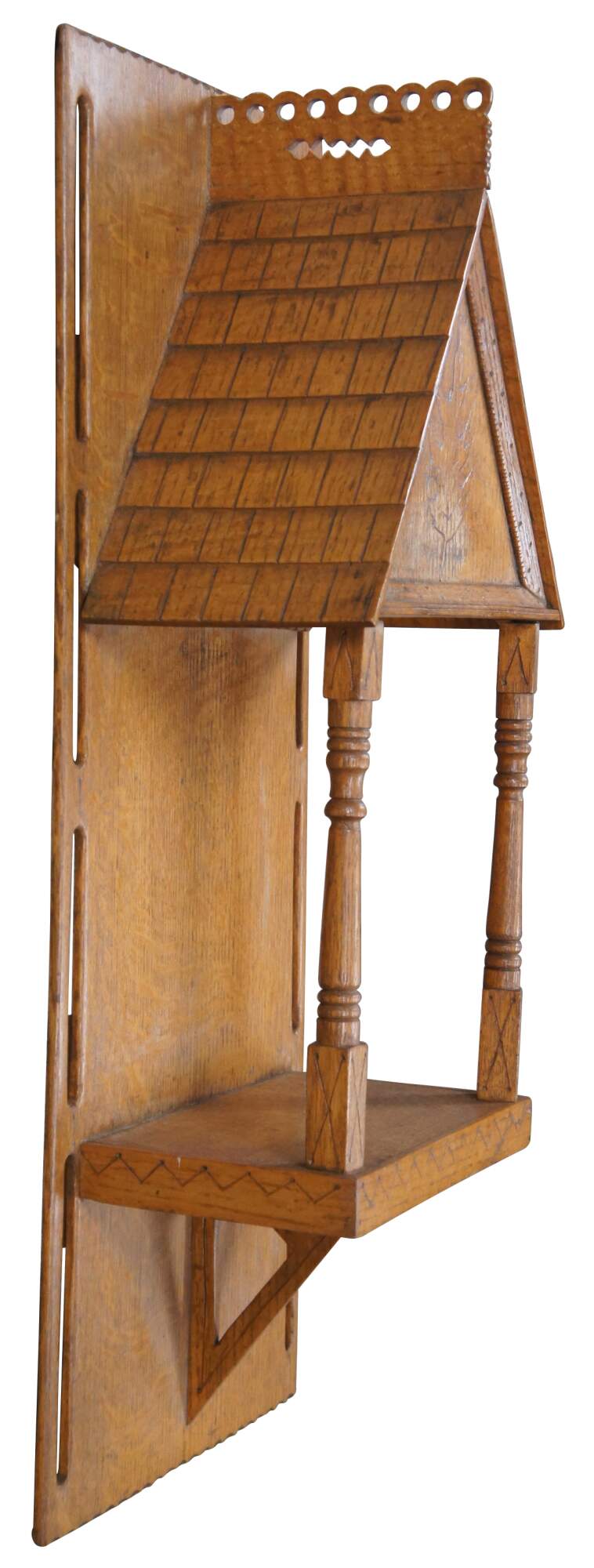 Vintage ornamental folk art wall shelf or sconce in the form of a house. Made of quartersawn oak featuring reticulated ornate details with turned columns and central maple leaf.