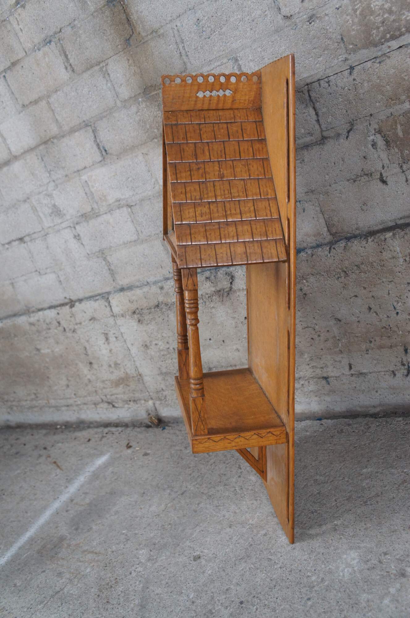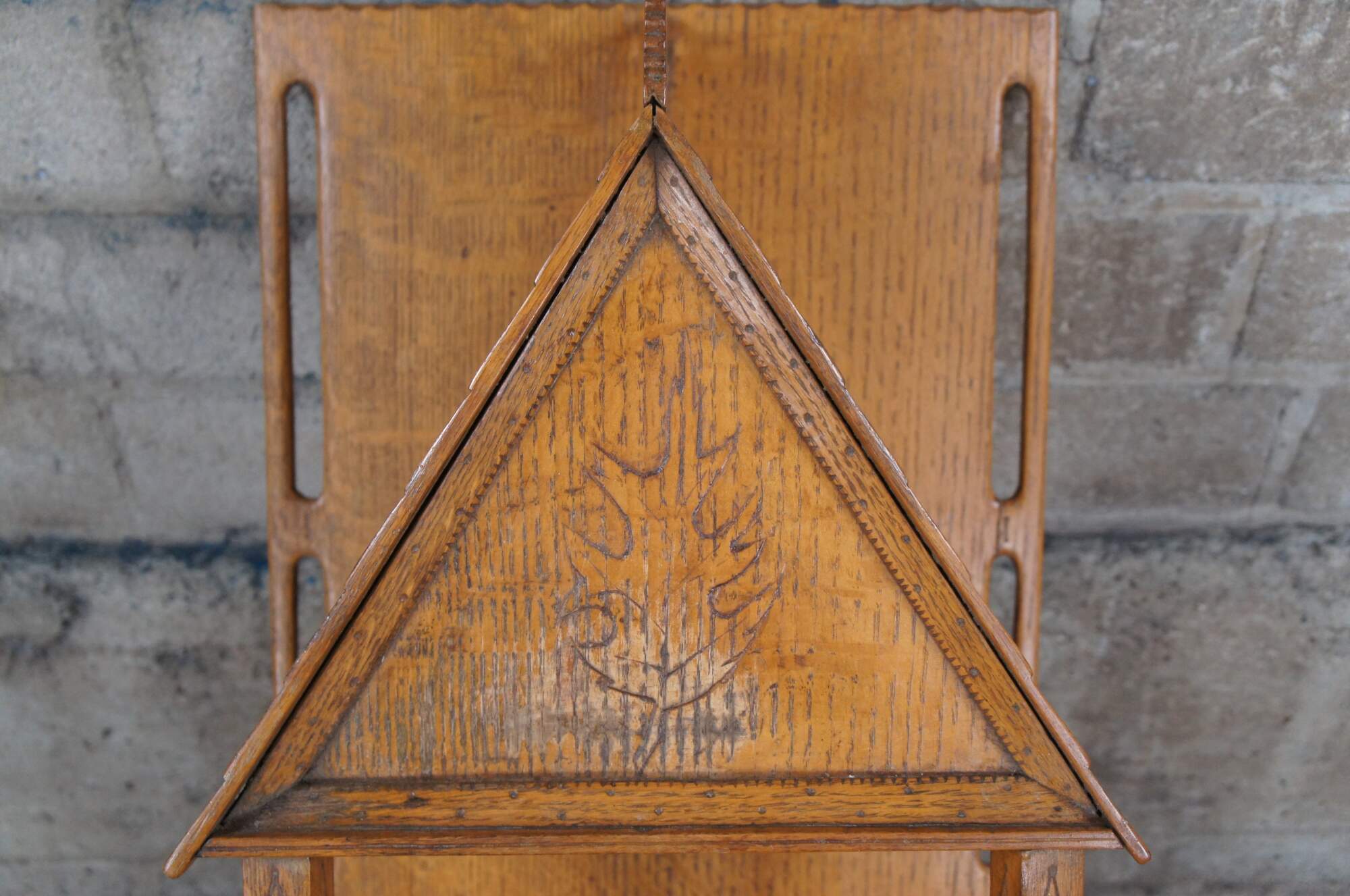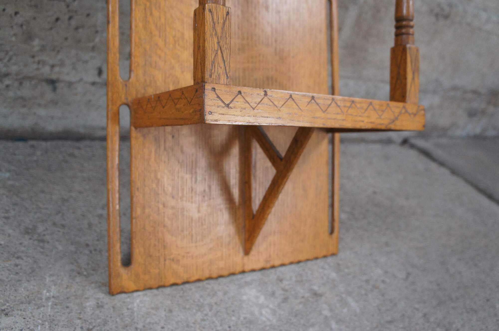 Vintage ornamental folk art wall shelf or sconce in the form of a house. Made of quartersawn oak featuring reticulated ornate details with turned columns and central maple leaf.