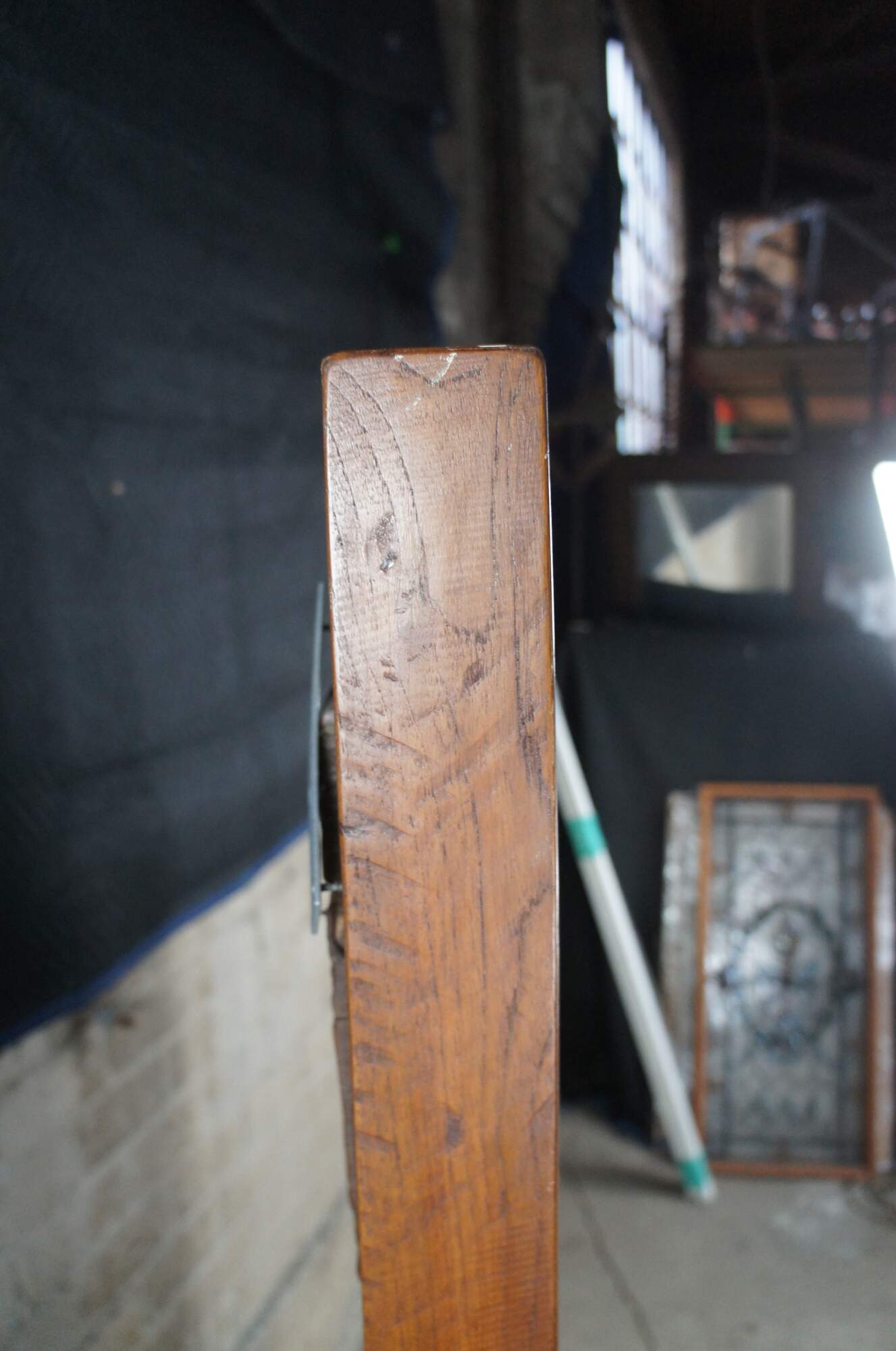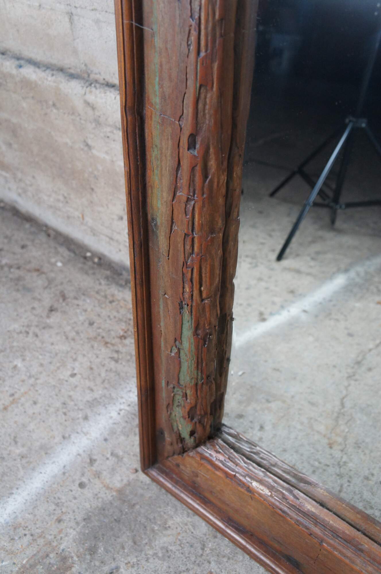 Impressive Indonesian carved mahogany over mantel or wall hanging mirror. Re-claimed or salvaged from a doorway or shutter. Original hinge marks can be seen along the inside of the trim. Features a rectangular frame with pierced foliate crown and large beveled glass
