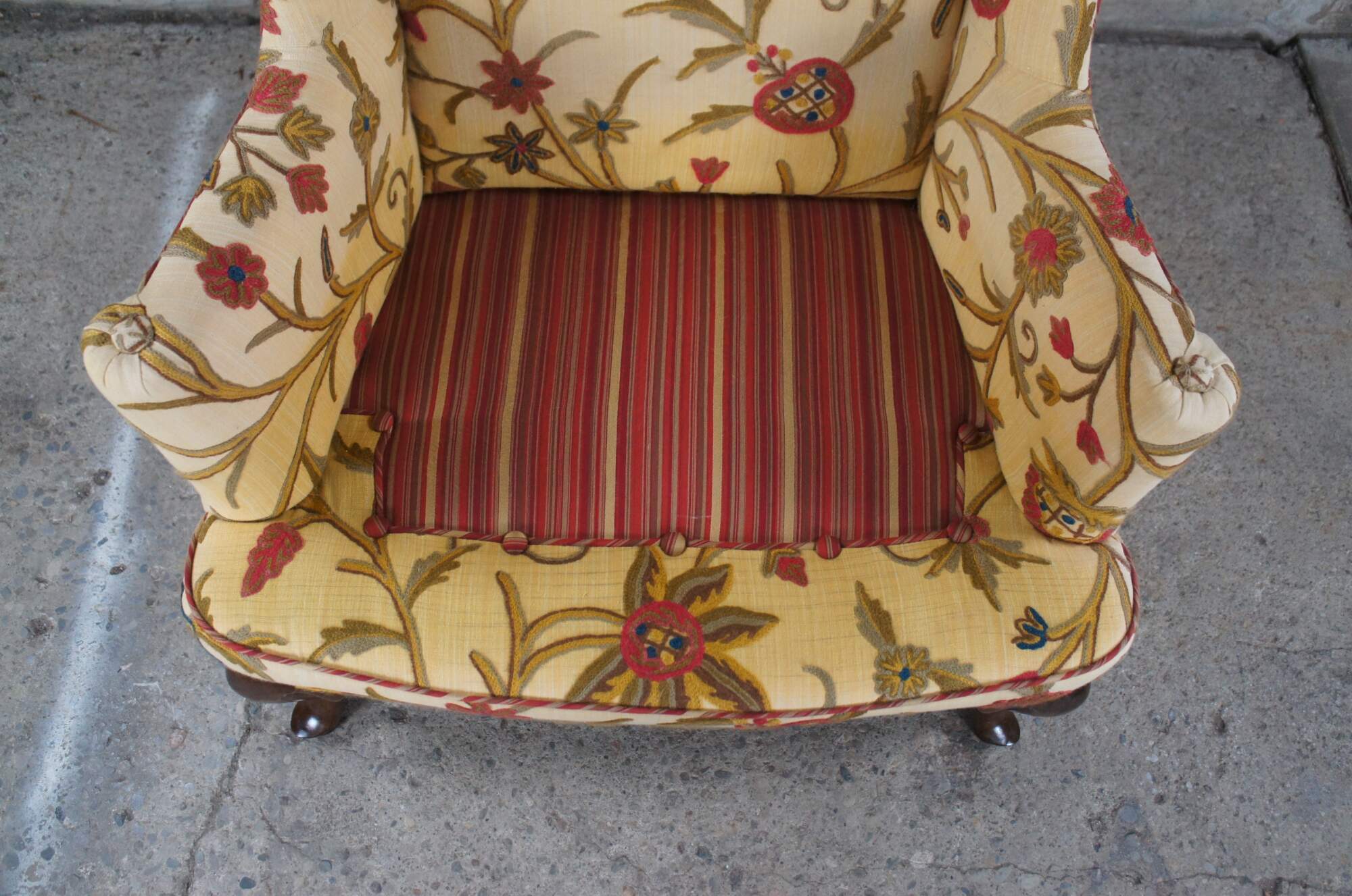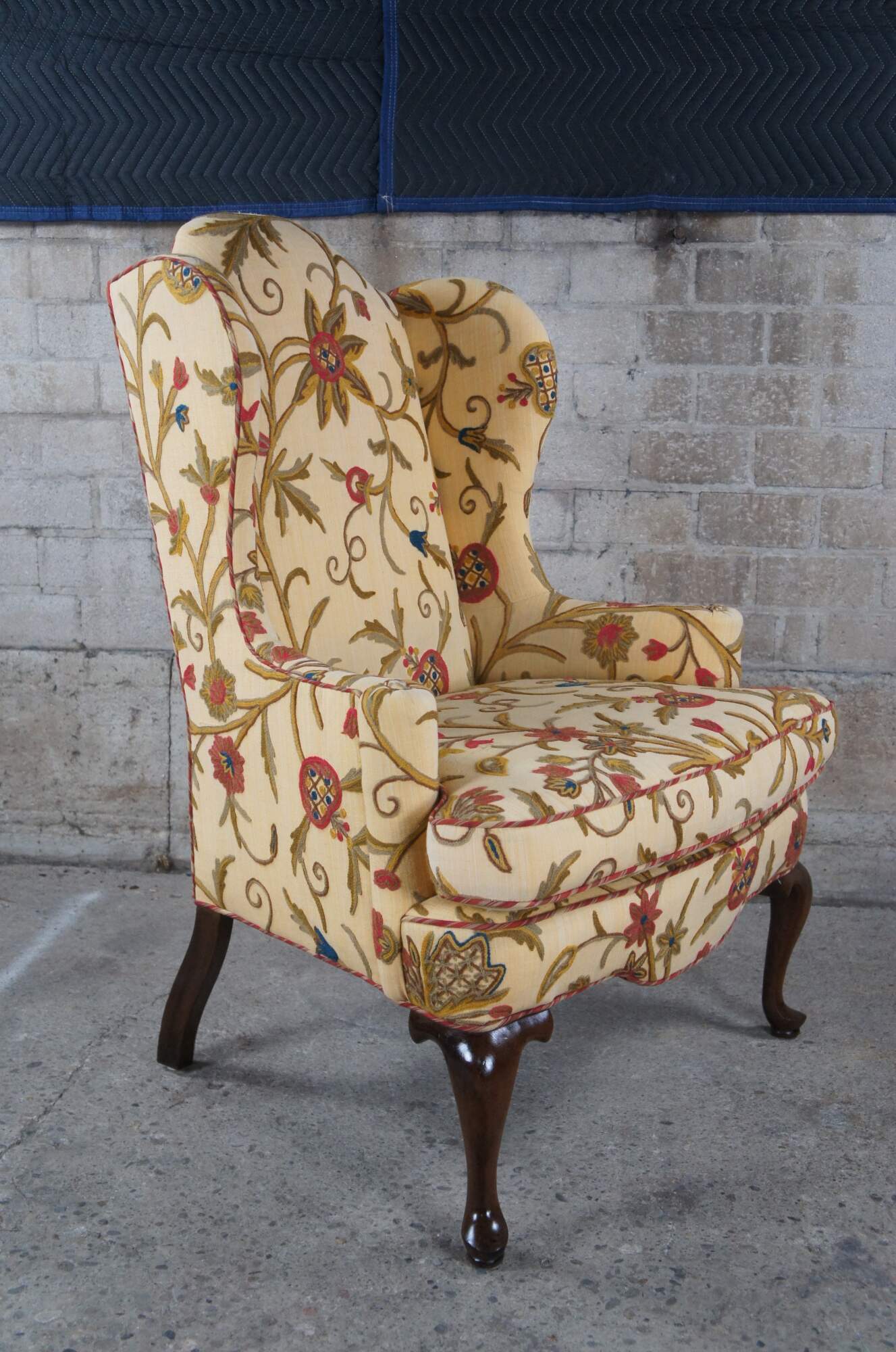 Two vintage Queen Anne library wingback easy armchairs featuring crewel floral upholstery with distressed mahogany cabriole legs leading to pad feet.