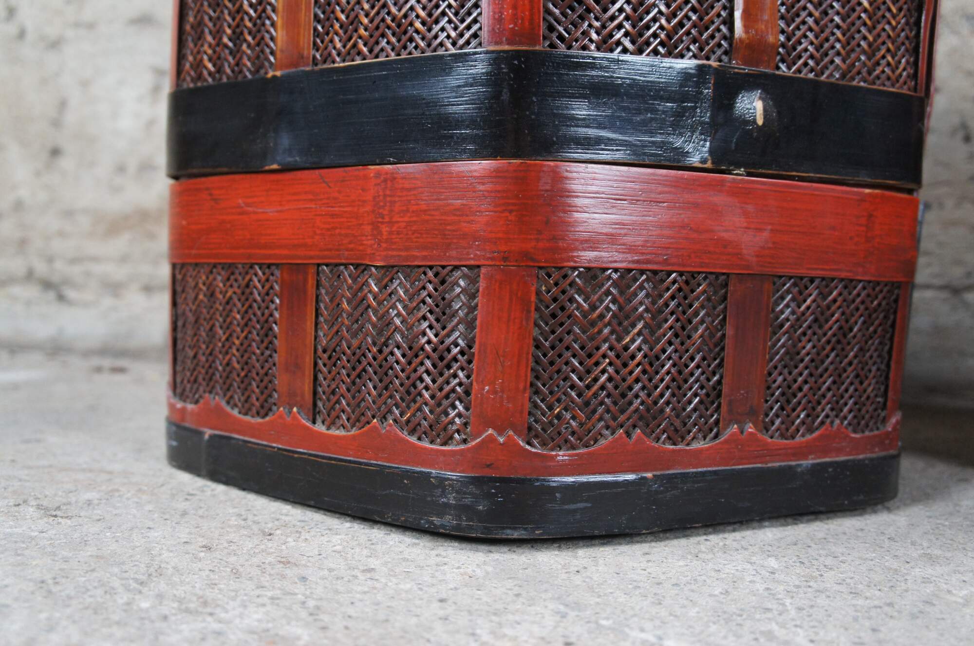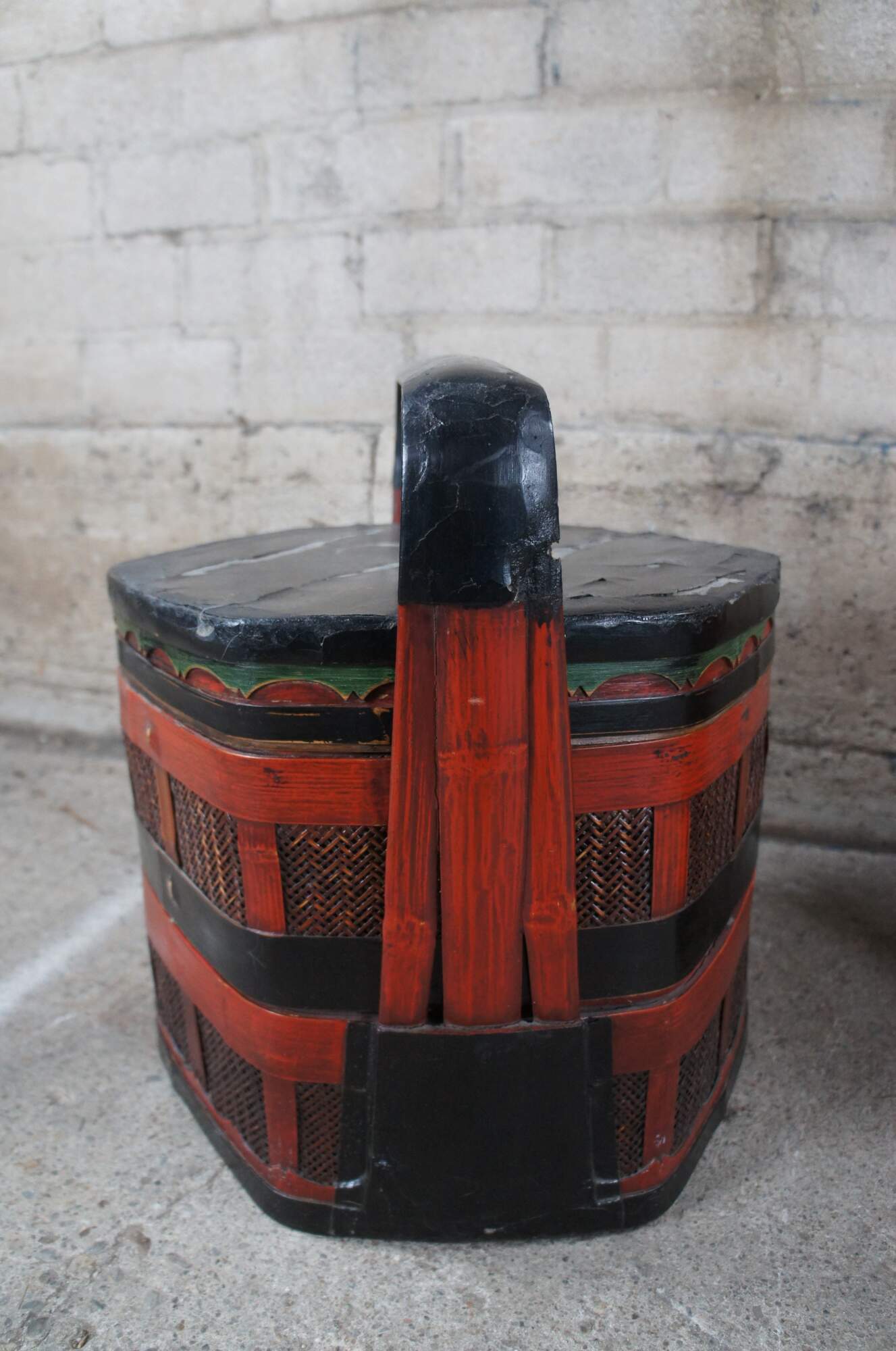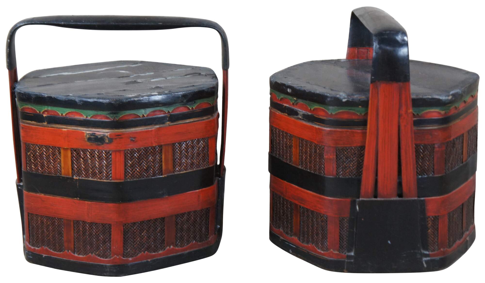 An impressive pair of antique Chinese two tiered hexagon shaped wedding basket or box. Made of lacquered bamboo and rattan. Hand painted in red and black with green accents.