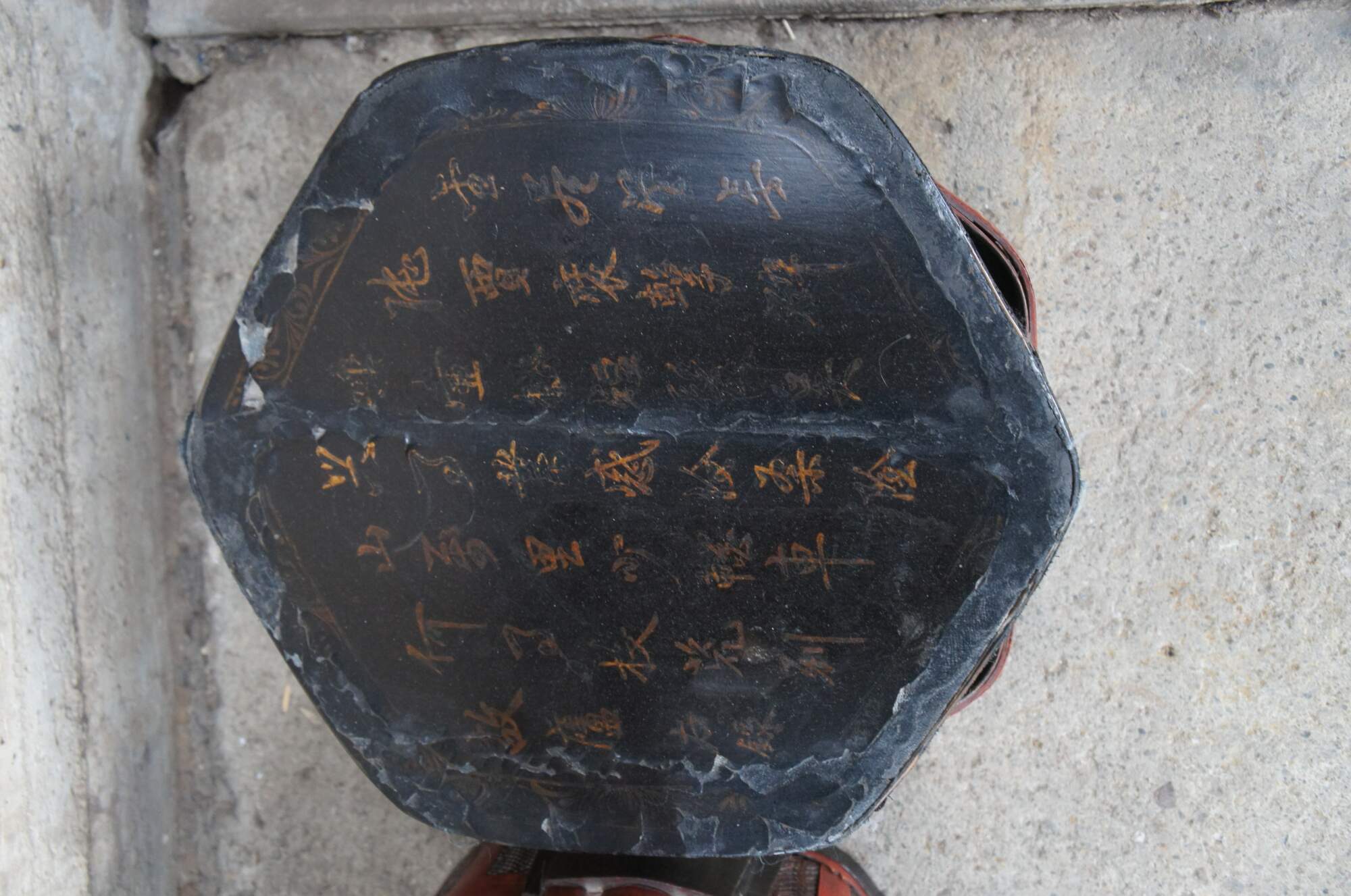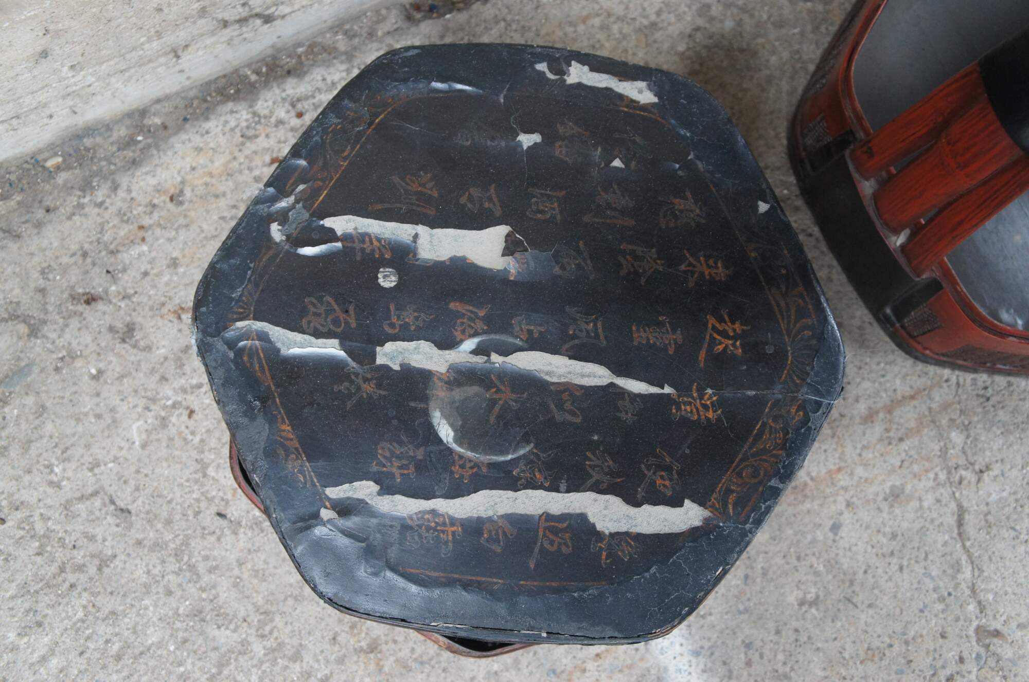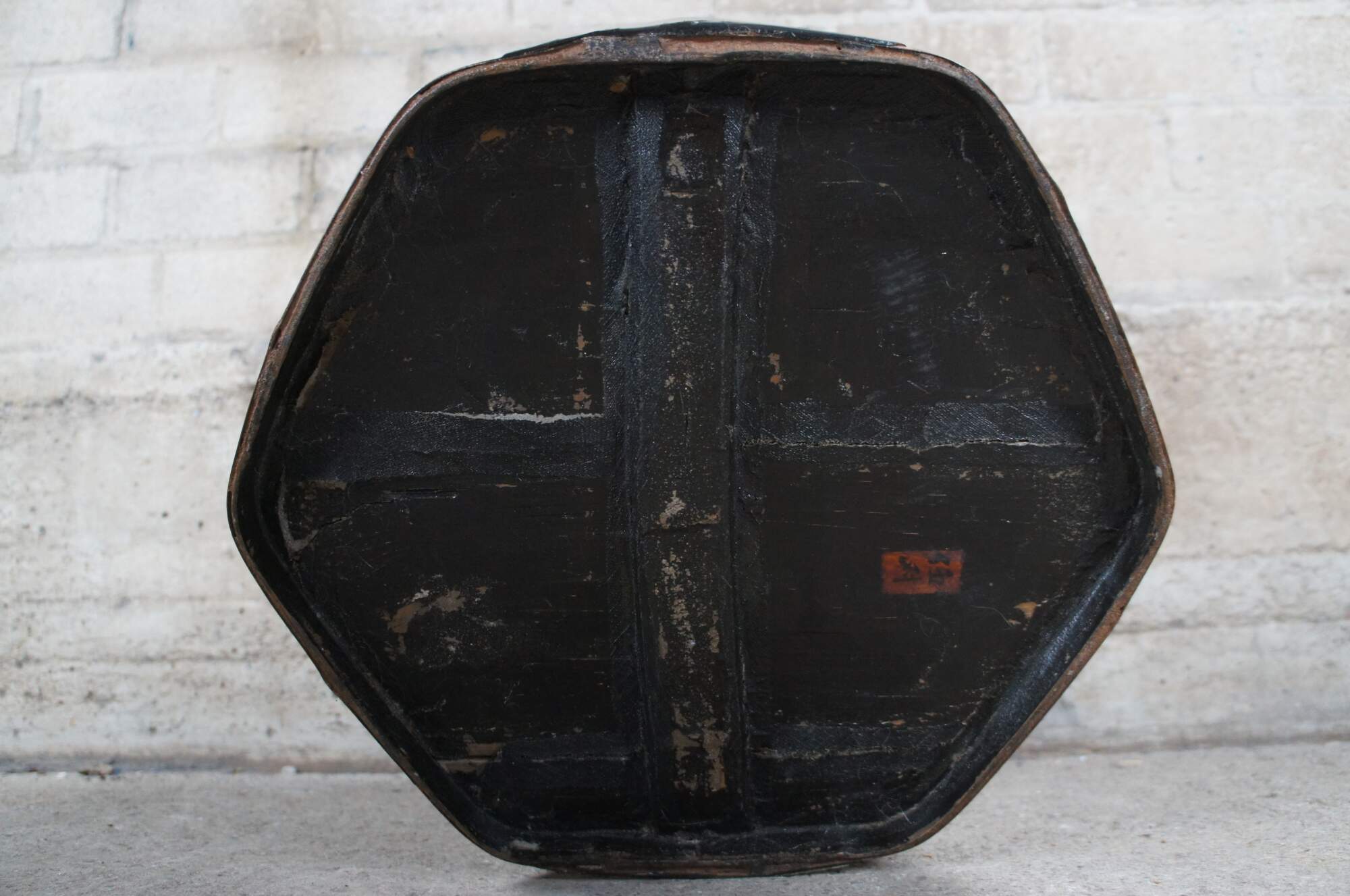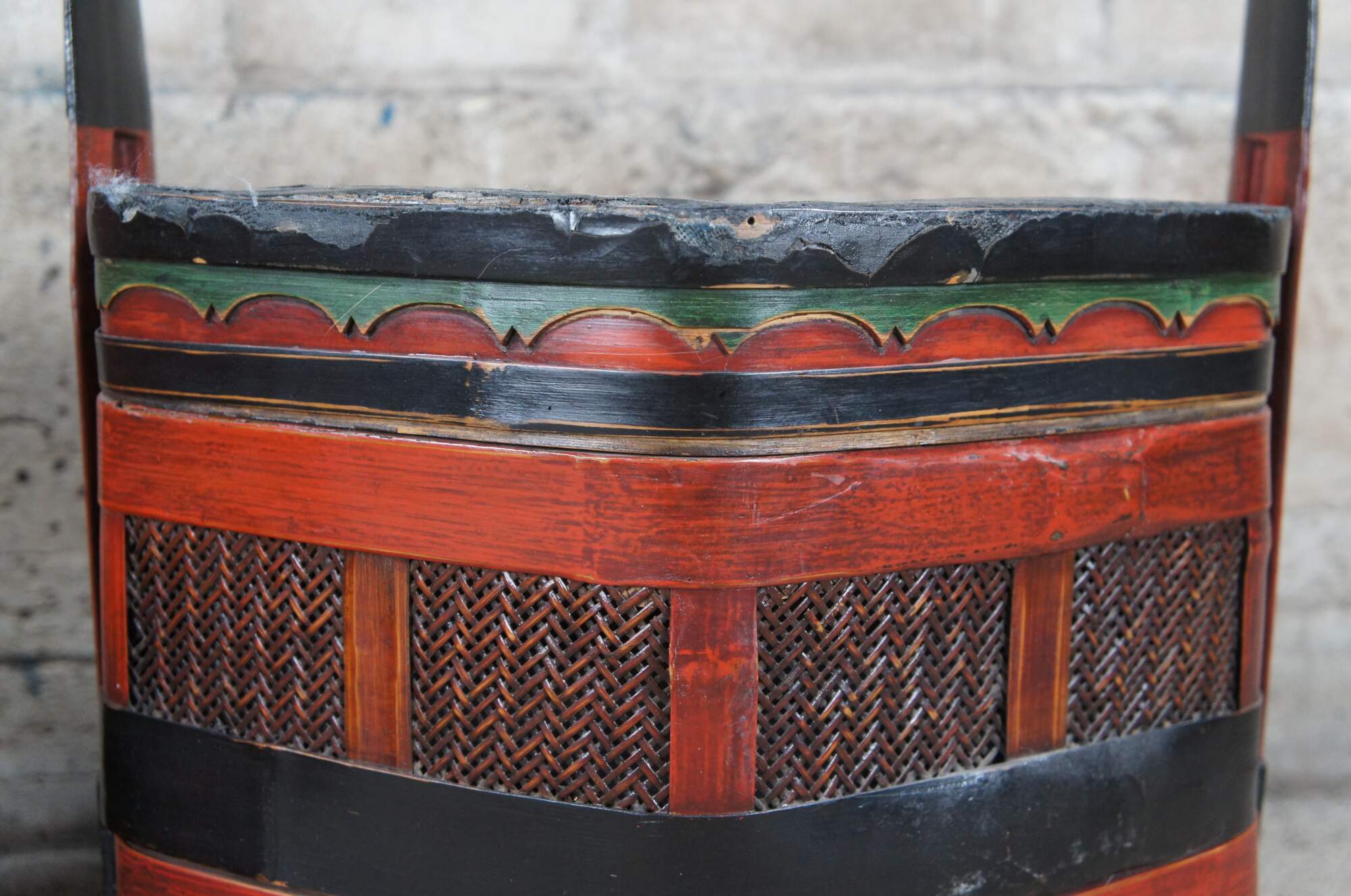 An impressive pair of antique Chinese two tiered hexagon shaped wedding basket or box. Made of lacquered bamboo and rattan. Hand painted in red and black with green accents.