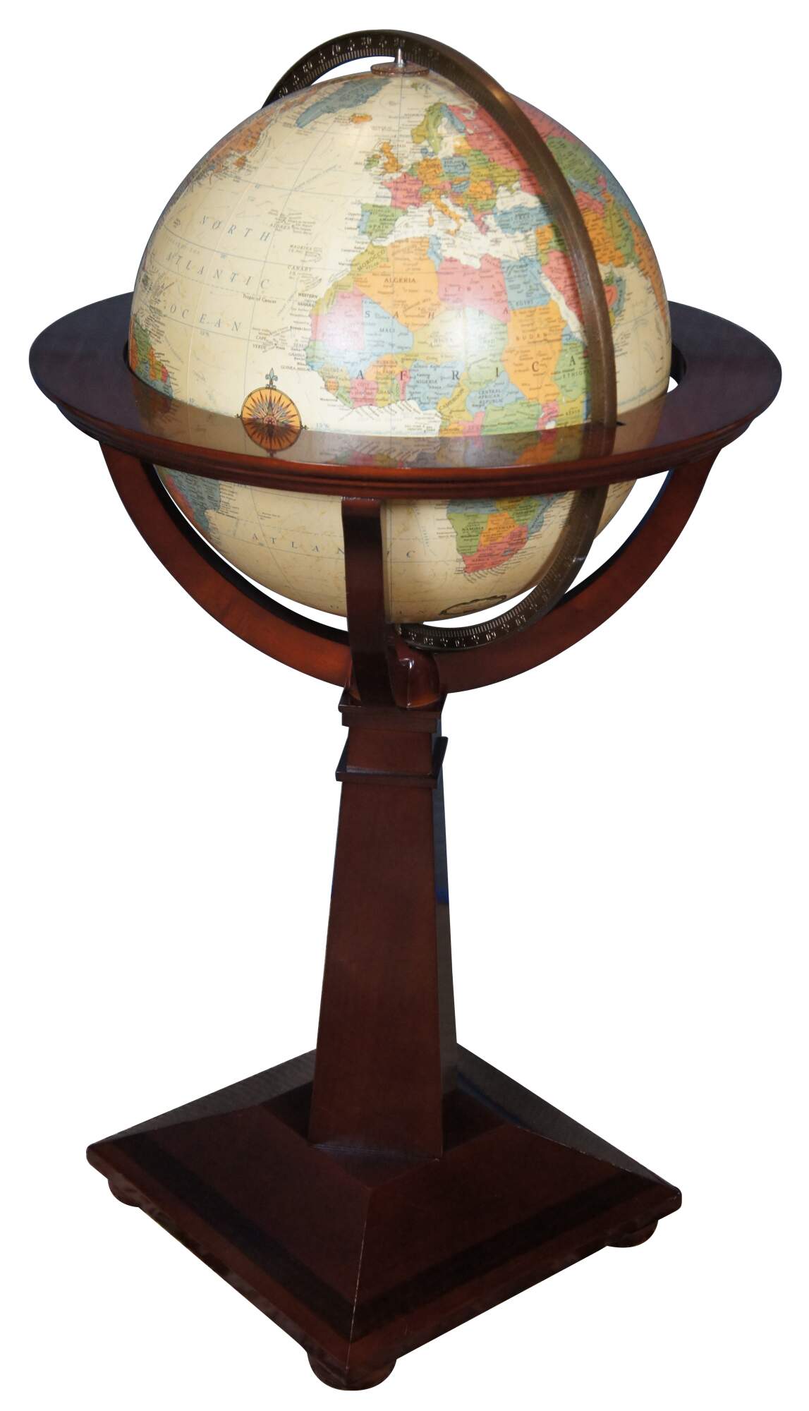 Vintage Replogle 16” floor globe set in an elegant pedestal stand with brass meridian. Batteries can be inserted for illumination.