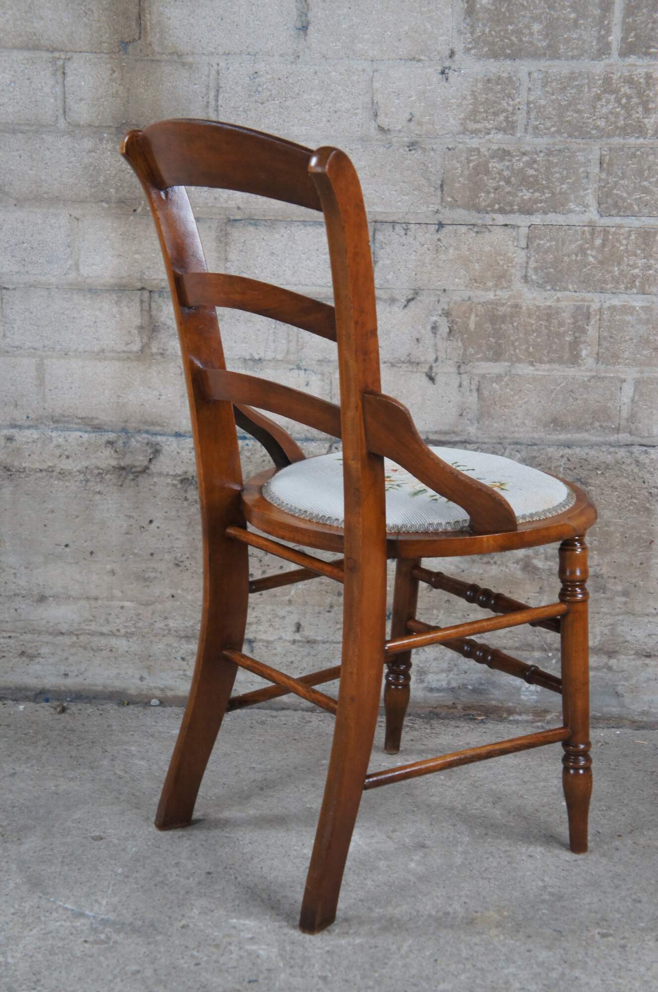 Two antique Victorian Eastlake parlor accent chairs. Made of walnut featuring turned posts, needlepoint seats, one with nail head accents, burl wood panel and cane.