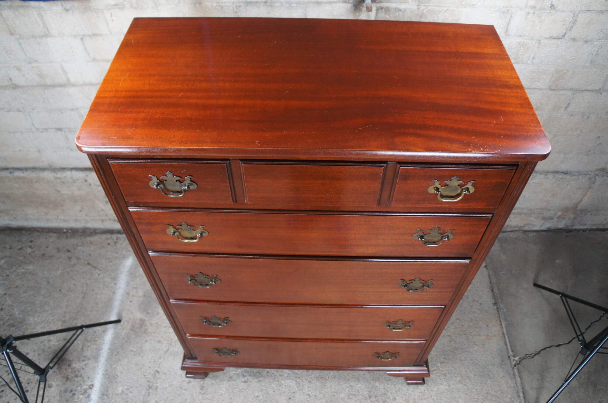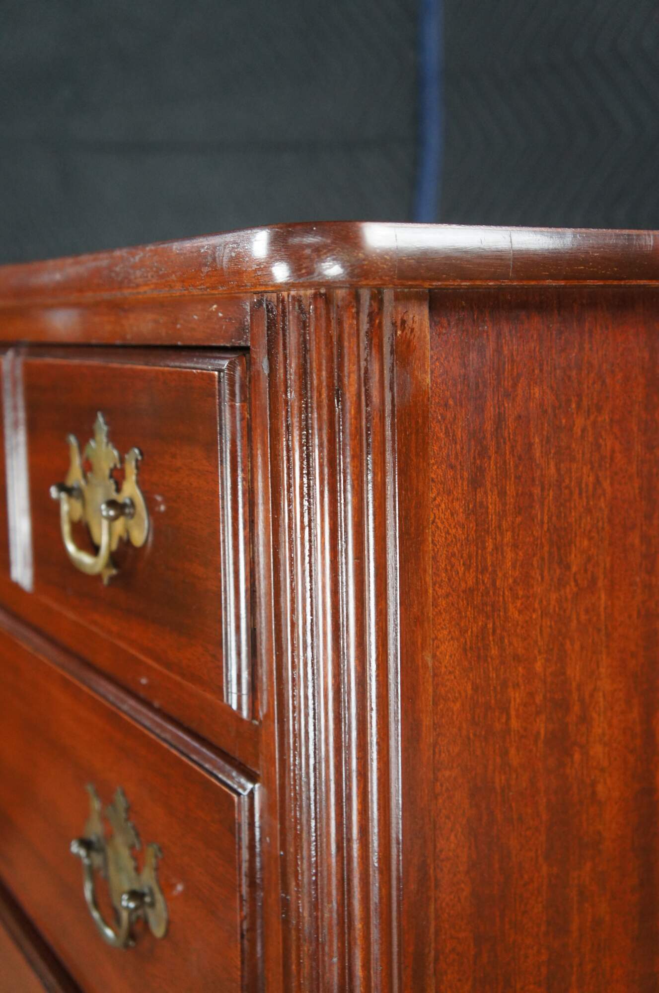 A lovely mahogany chest, circa 1940s. Features a rectangular frame featuring 5 dovetailed drawers with Chippendale style brass bat wing drawer pulls between reeded stiles. The case is supported by flared bracket feet. Upper drawer is divided with adjustable jewelry tray