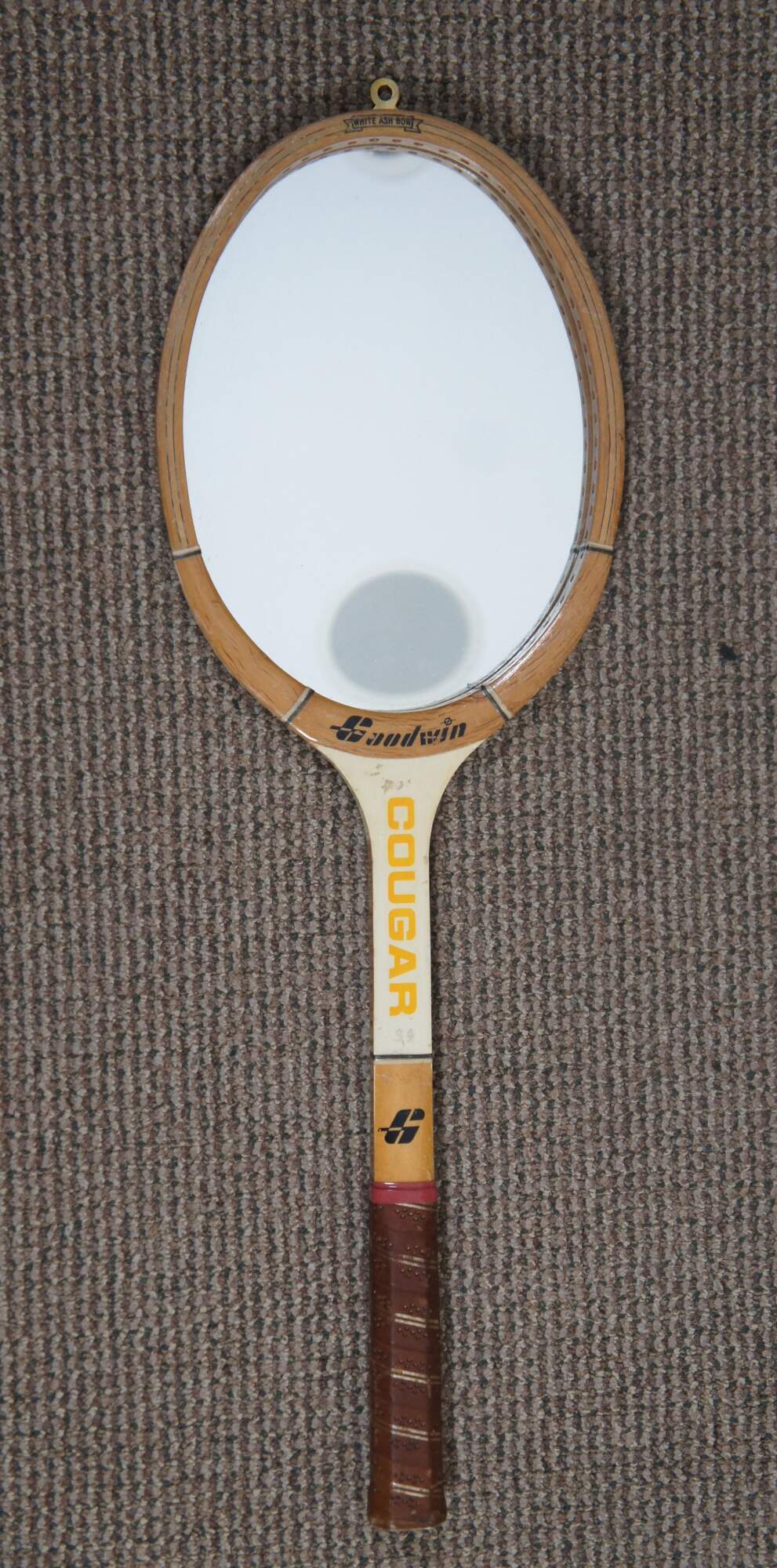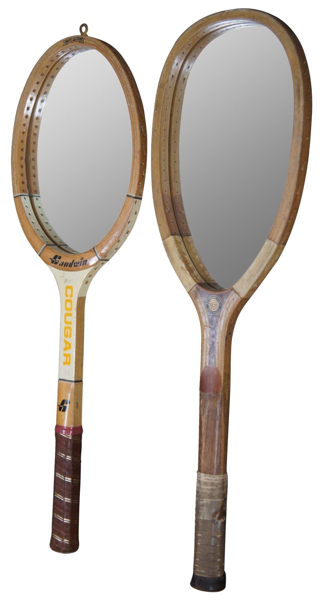 Pair of wall mirrors upcycled from vintage tennis rackets, one Goodwin Cougar and the other Spaulding & Bros Alexander.