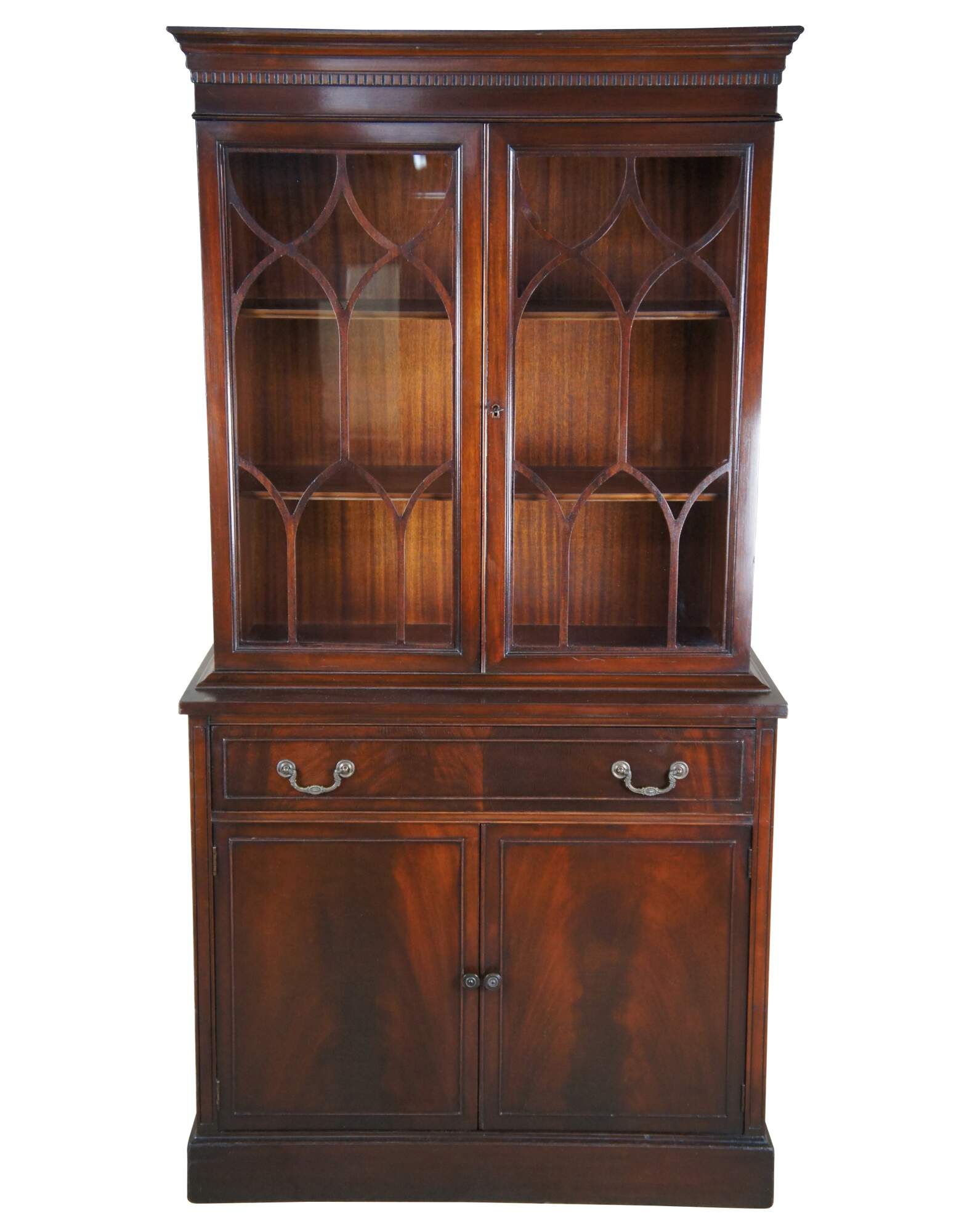A beautiful Georgian style china hutch or bookcase by Huntley Furniture, circa 1930-40s. Made from mahogany with crotch or flame mahogany front. Features a glass doors along the top with interlaced fretwork that open two two interior shelves with plate grooves. Base houses a large dovetailed drawer and lower cabinet with shelf for accessory storage. Crown features dentil carved molding.