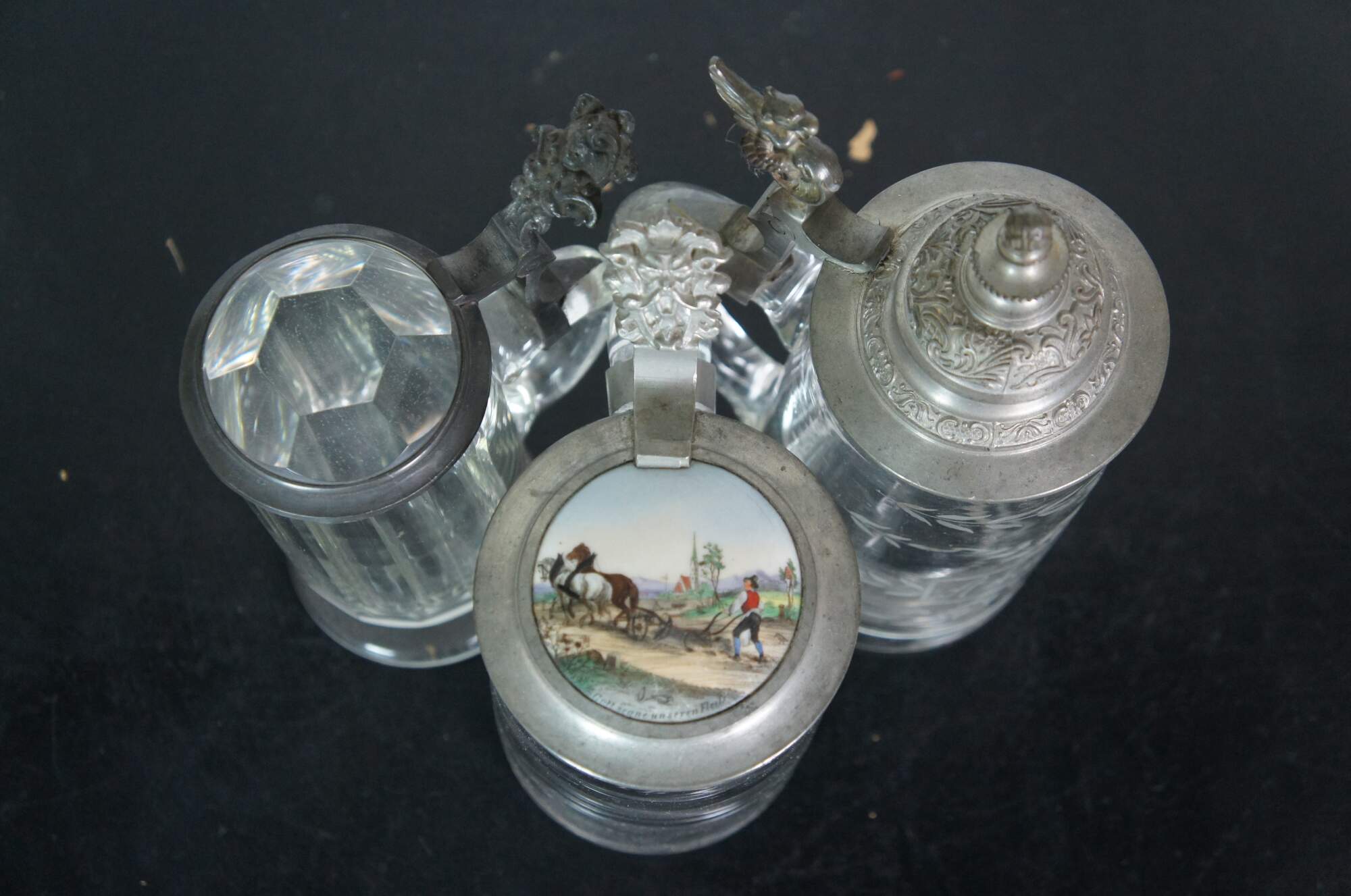 Lot of 19 rare early 20th century antique German cut / etched / faceted glass beer bar steins with metal / pewter flip top lids. Thumbprint, bubble glass, cut, and etched. Lids with painted / enameled glass or rhinestone finials - 8. Lids with painted scenes / ceramic inlays on lids - 4. Repousse floral / plain metal lids - 7. Smallest mug is a pink bohemian glass.