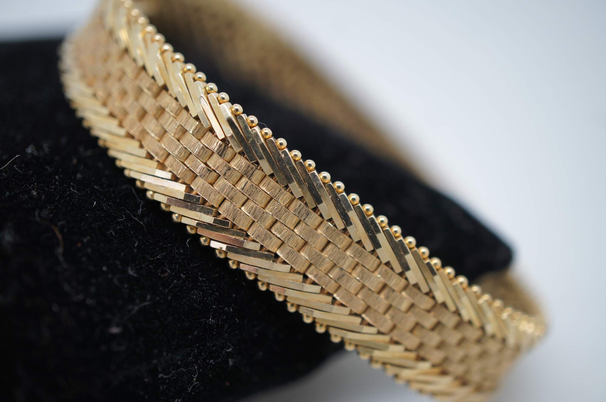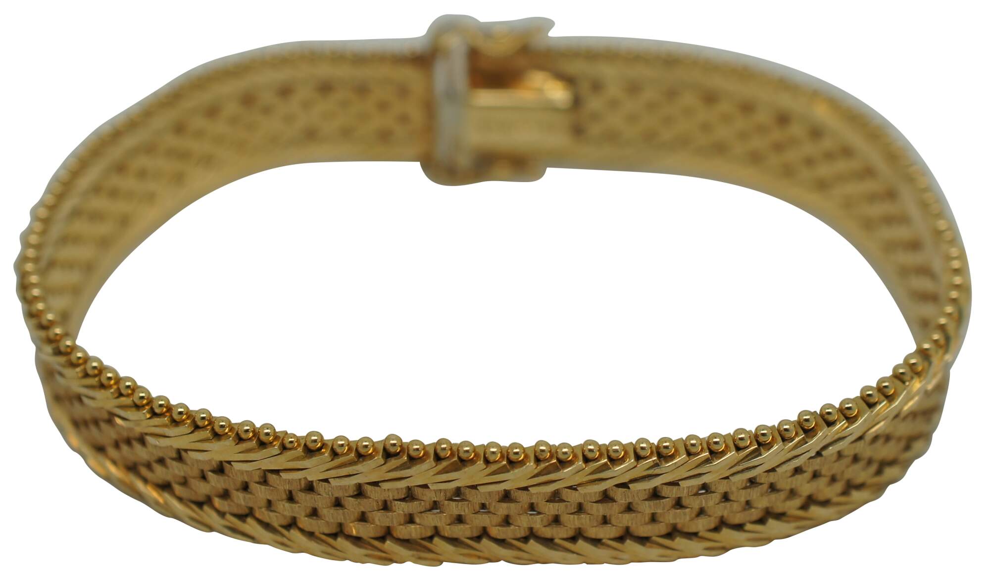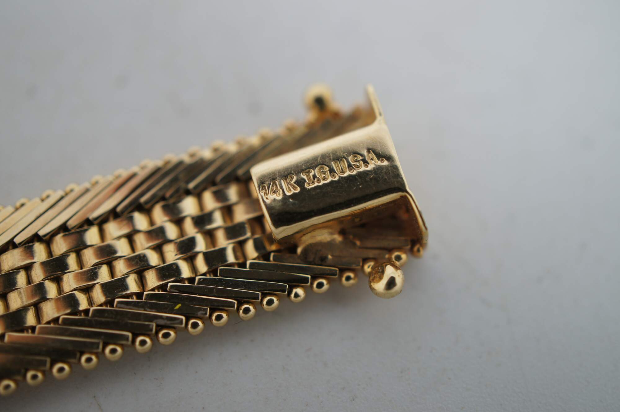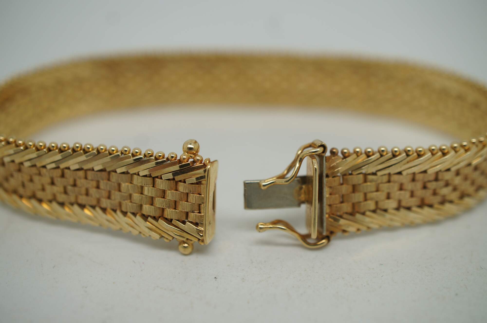 Vintage 14k yellow gold flat 9.5mm wide chain bracelet featuring a panther chain center framed with a split herringbone and beaded border. Open box clasp. Marked 14k Imperial Gold USA.